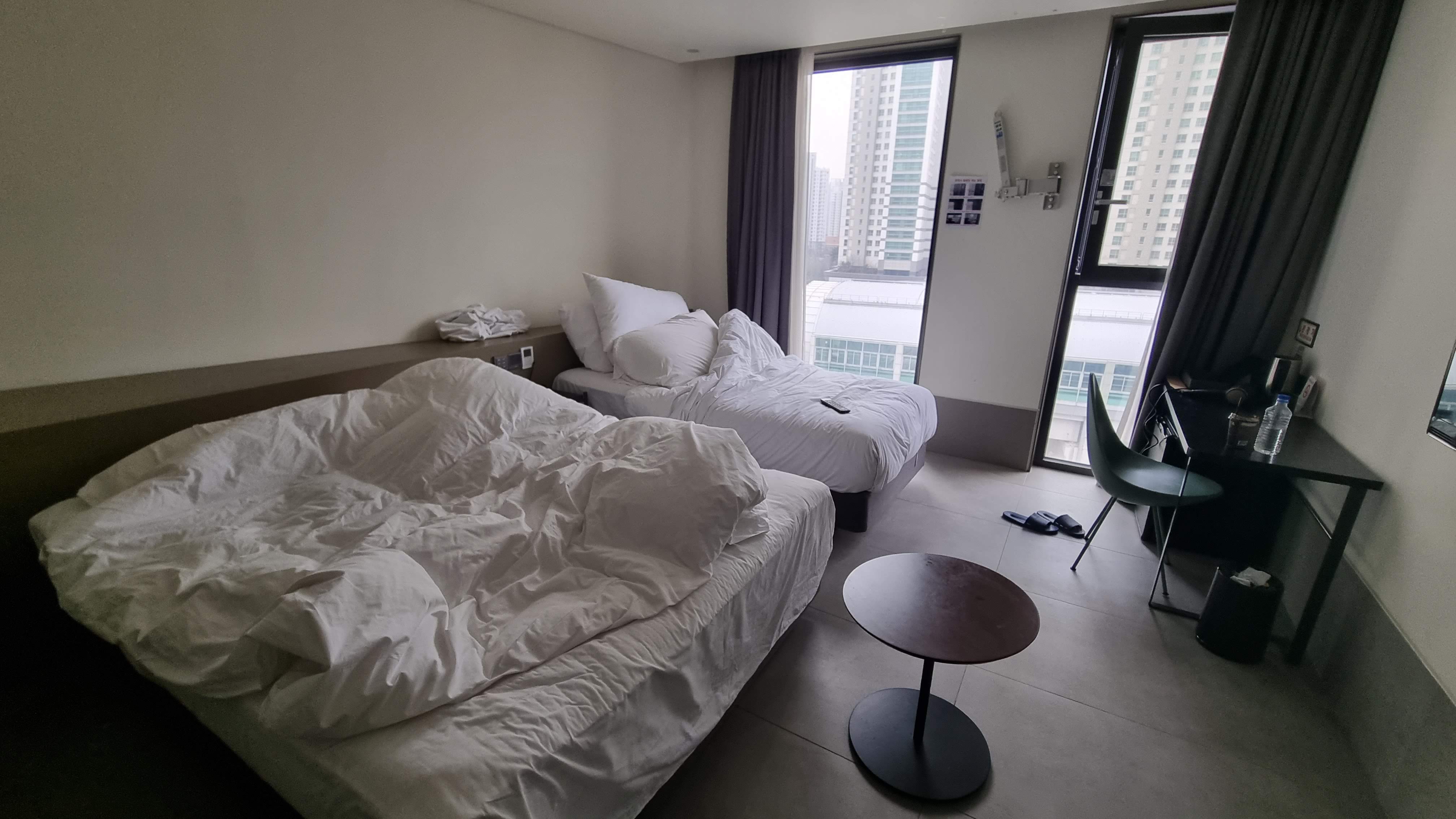 우리 가족이 하루 머룰럿던 패밀리 트윈 객실. 나갈때는 나름 그래도 깨끗하게 하고 나온다. 시트와 이블 베게등의 세탁 상태는 괜찮았다. 전체적으로 큰 불만은 없지만 가격이 13만 원에 1박을 하는 패밀리 트윈 객실이었는데 침대 양 옆으로 있는 독서등 같은 조명이 벽에서 떨어져 덜렁덜렁거렸고 그 마저 한쪽은 조명이 들어오지 않았다. 매트리스 윗부분 나무 공간의 먼지가 제대로 청소가 안되었다는 점 또한 전기포트를 포함한 종이컵과 물컵이 있는 공간이 먼지와 잔 흠집으로 인해 사용을 못한 점등이 아쉬웠다. 그 외 천장에 전 투숙객이 붙여 놓은 테이프 등이 덕지덕지 붙어 있어 기분이 별로 좋지 않았다. 프런트에 당장 전화해서 시정을 요구하고 싶었지만 다음에 다시 올 생각은 없었기에 마음을 접었다. 루프탑에 수영장(현재는 운행 종료)이나 피트니스 시설 등도 있으니 참고하시길 바란다.