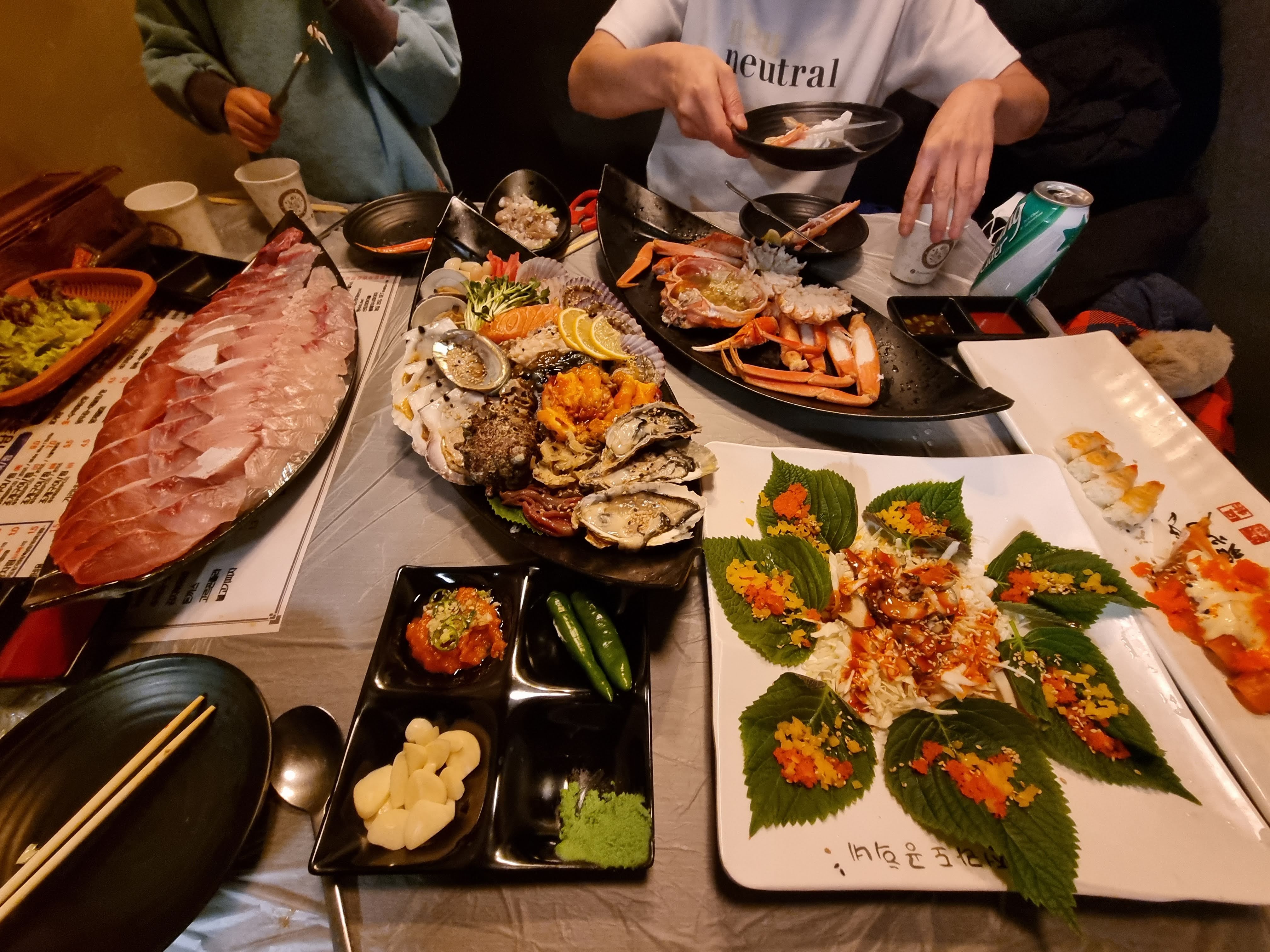 이제 아이는 낚지도 잘 먹는다. 아이는 대게는 너무 맛있게 먹고 있다. 나는 대게는 패스(사실 나도 먹고 싶긴 했다)하고 대방어 회부터 먹기 시작했다. 오랜만에 먹어서 그런지 감칠맛이 돌았다. 이것저것 몇 젓가락을 뜨니 내 조그만 위는 벌써 배부름의 신호를 보내고 있었다. 항상 느끼는 것이지만 나는 먹방 유튜버들을 정말 존경한다. 조개찜도 먹고 날씨 알쌈도 먹고 초밥도 먹고 회도 먹고 해삼과 개불도 먹고 대개도 먹어보고 정말 입에서 비린내가 날 정도로 먹었다. 와이프나 나나 양이 많지 않고 아이도 많이 먹지 않으니 사실 음식은 3분의 1의 남았던 거 같다. 마지막에는 정말 회를 꾸역꾸역 입에 넣었다고 해도 과언이 아니다. 그만큼 3인 가족이 먹기에는 차고 넘쳤다. 매운탕이고 뭐고 생각도 안 나서 그만 먹고 일어섰다.