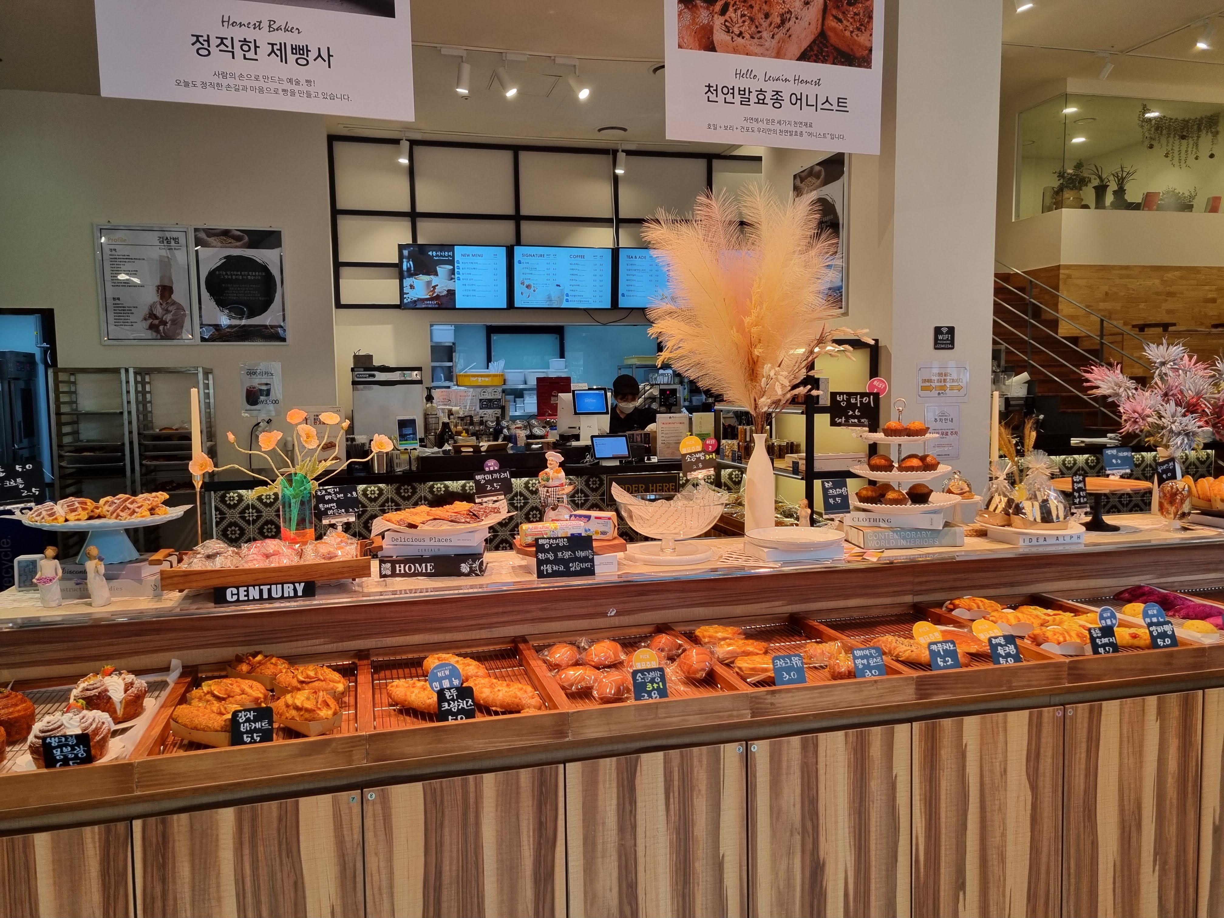 1층에는 주문과 빵을 살 수 있으며 들어가서 정면으로 우측에 계단식 좌삭이 마련되어 있다. 역시 사람은 한 우물을 한 30년은 해야 명장의 반열에 오를 수 있다.
