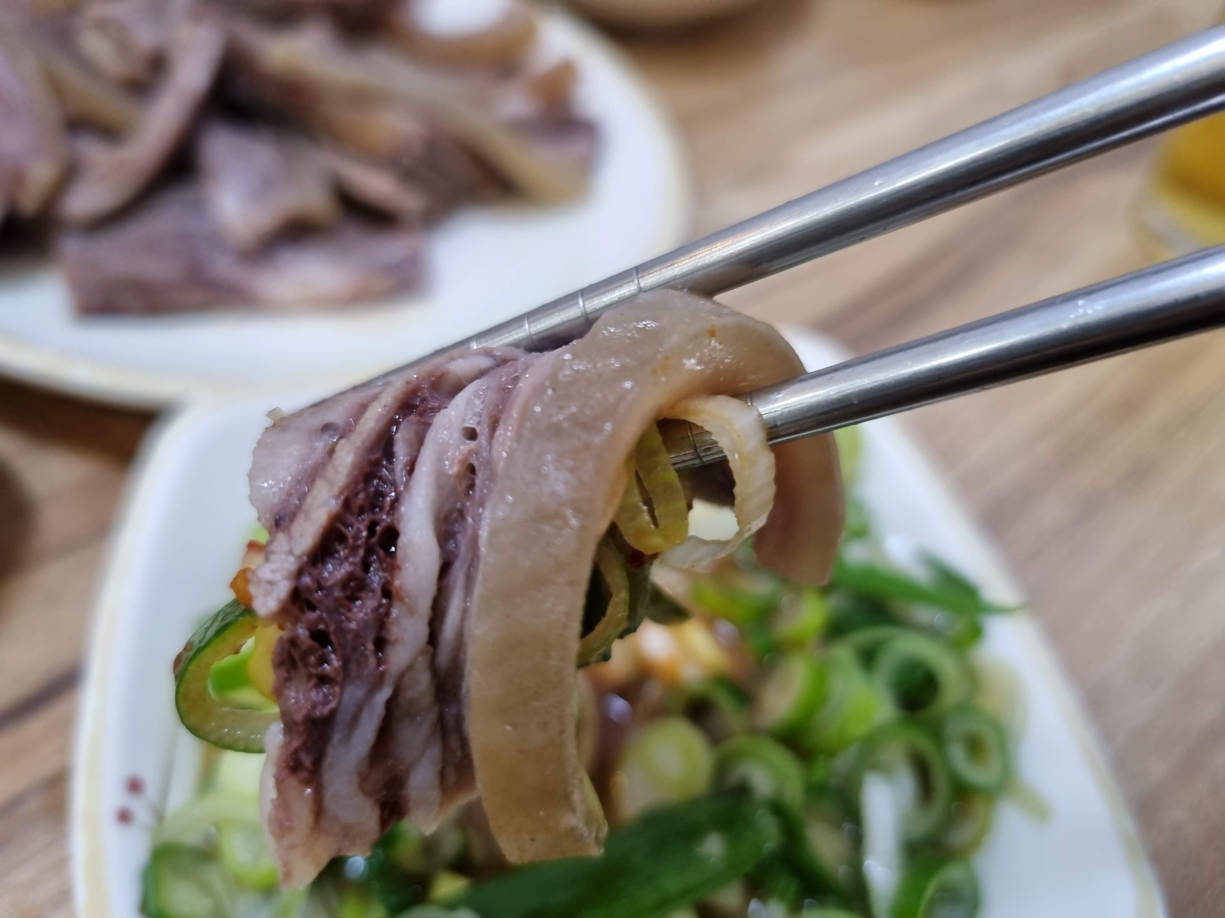 소머리국밥집 답다. 점심을 안먹고 왔더니 배고 몹시 고픈차에 수육이 한 저가 먼저 나왔다. 아이는 수육을 잘 먹지 않기에 수육은 온전히 내 차지가 될 거란 생각에 마음이 흐뭇했다. 수육 한 접시와 함께 나온 소스! 접시에 대파가 한가득 왜 나오나 했더니 다 그럴만한 이유가 있었다. 보기에도 야들야들한 수육 한 점을 소스에 찍어 먹고 본다! 캬! 이 감칠맛은 뭐지? 입에 착착 감기는 부드럽고 고소한 고기 육질에 달콤 새콤 알싸한 소스가 어우러져 먹는 이 맛! 정말 소주를 부르는 맛이다. 내 인생 수육이라고 해도 과언이 아니다.