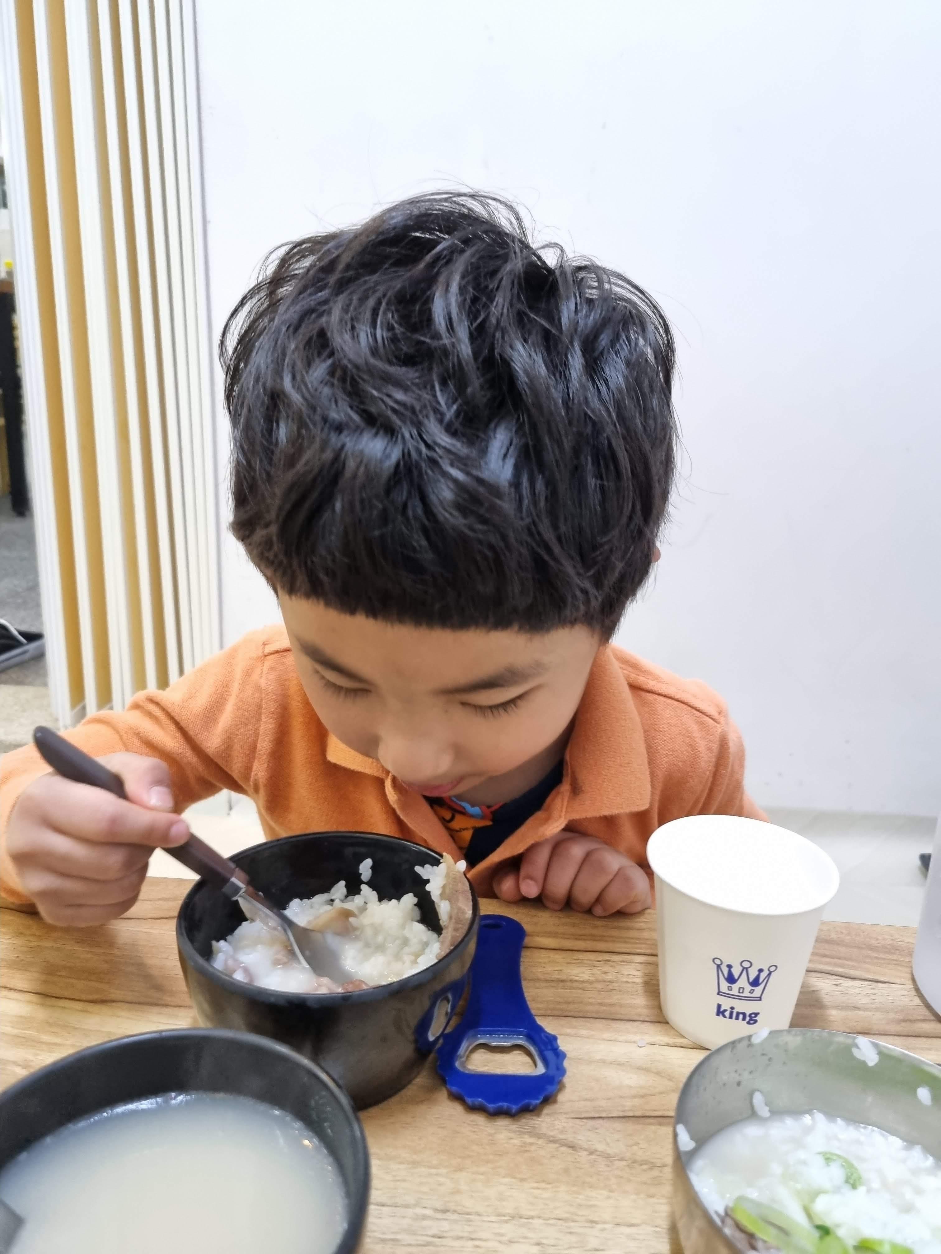 한 점 두 점 젓가락이 쉴 틈이 없다. 아내가 없어서 행복한지? 수육이 있어서 행복한지? 아마도 둘 다 인 것 같다. 수육 맛에 취해 있을 때쯤 국밥이 나왔다. 뽀얀 국물에 대파가 풍덩 빠져 있다. 아차 싶었다. 그래도 다행인 것은 국밥에 나올 때 아이를 위해서 준 밥그릇과 국자로 대파를 골라내고 국밥을 먹일 수가 있었다. 조금 지나니 아이 혼자서 국물을 국자로 떠서 혼자 밥을 말아 먹었다. 어찌나 기특하던지.