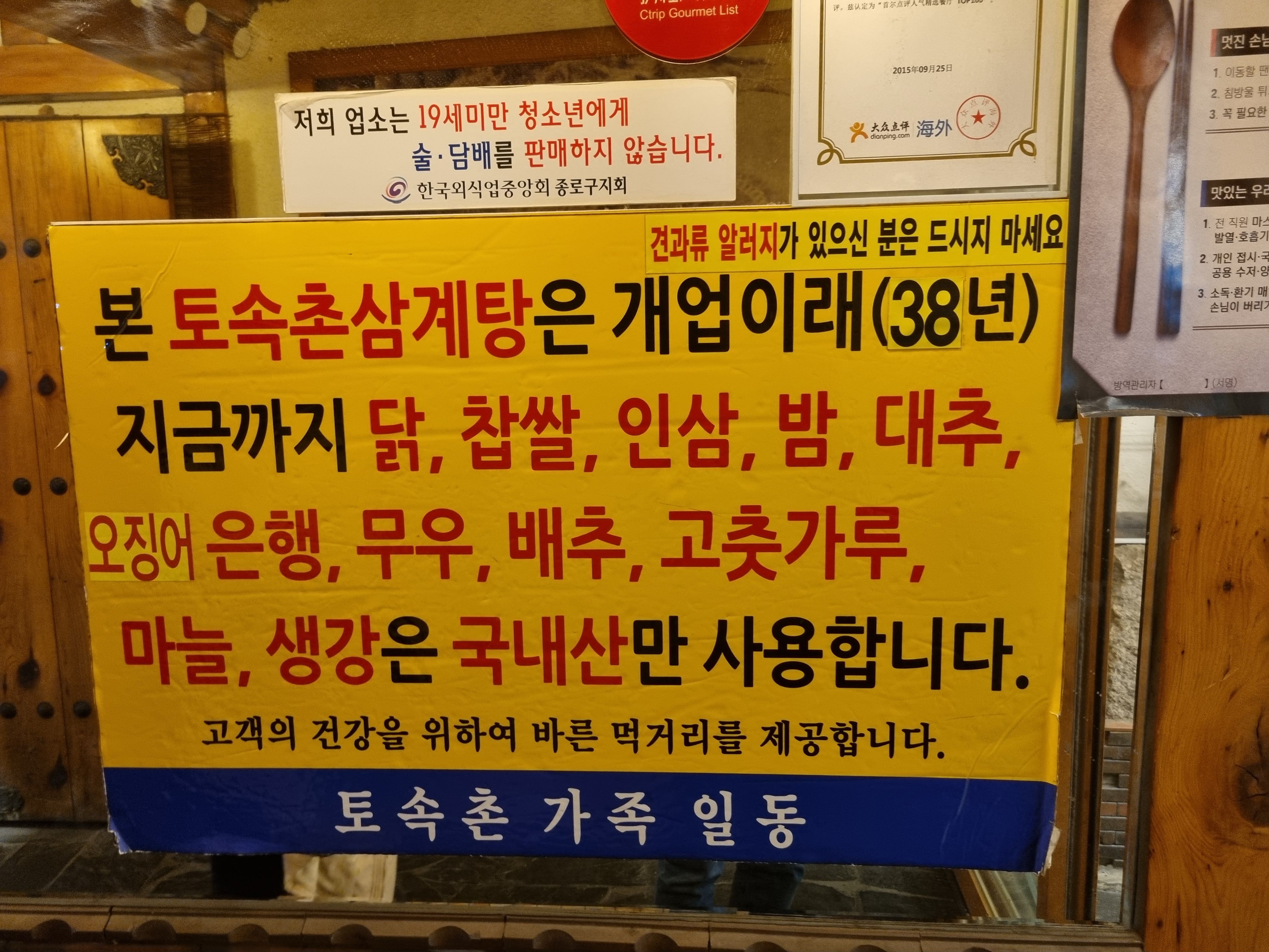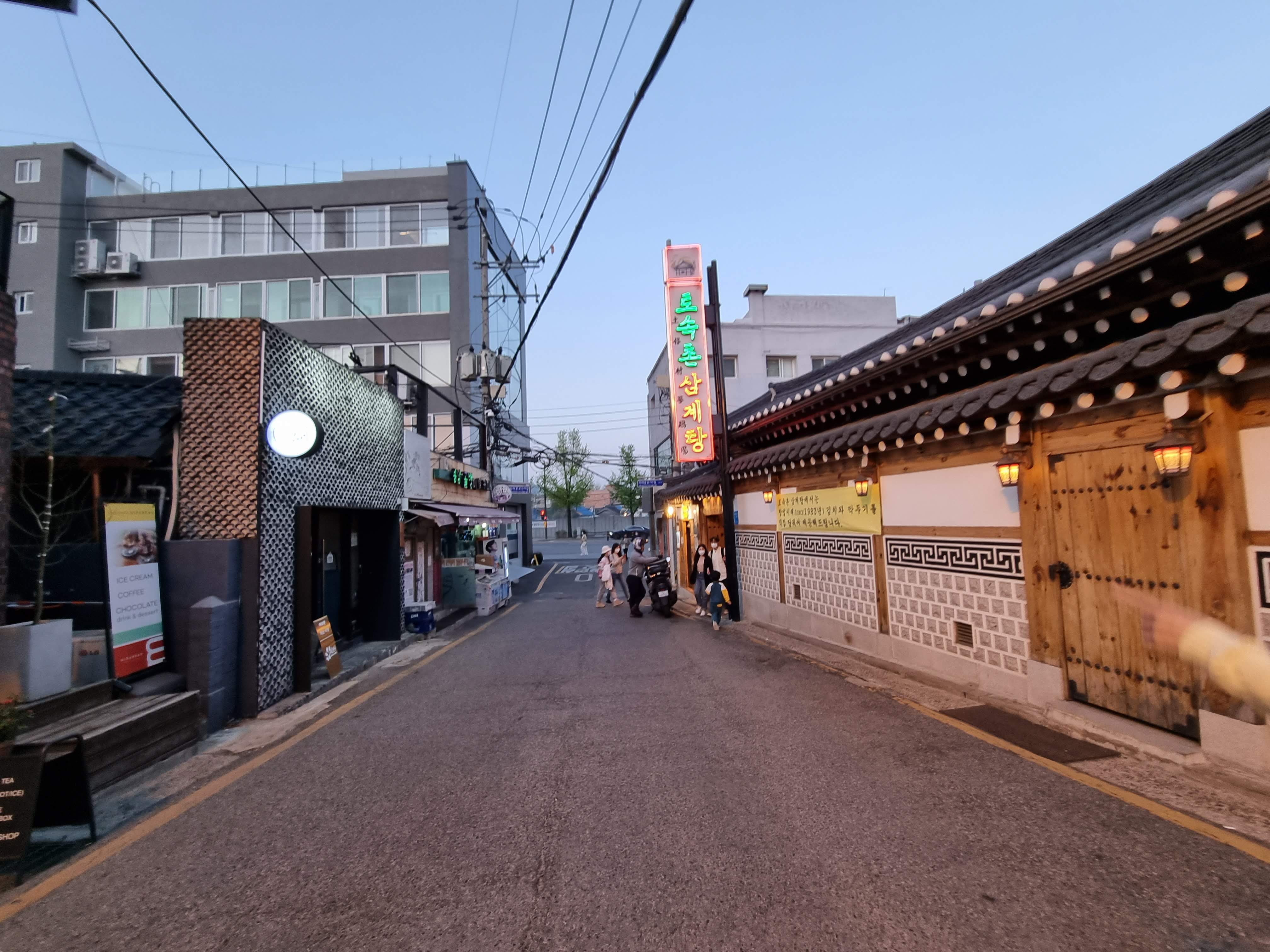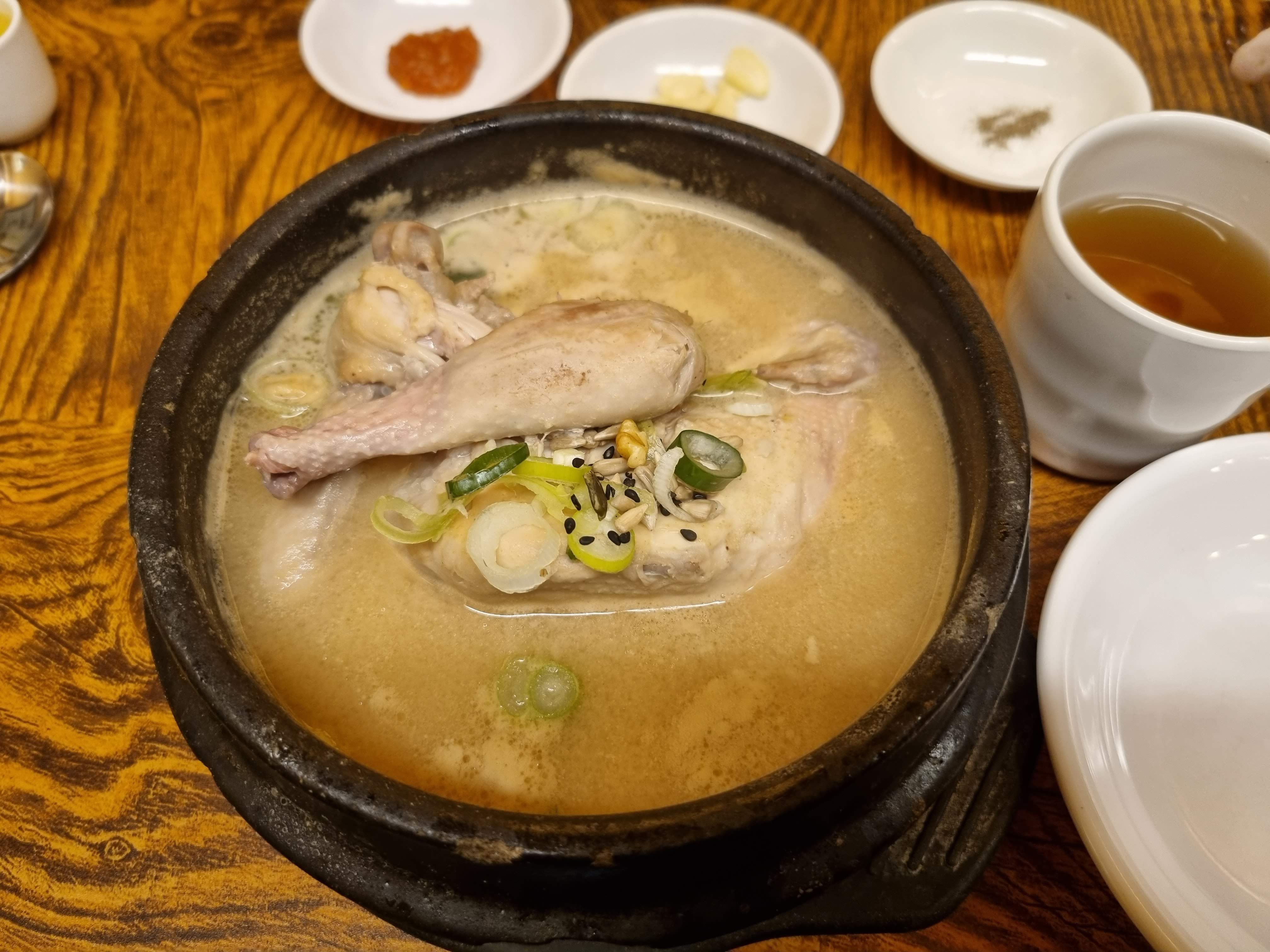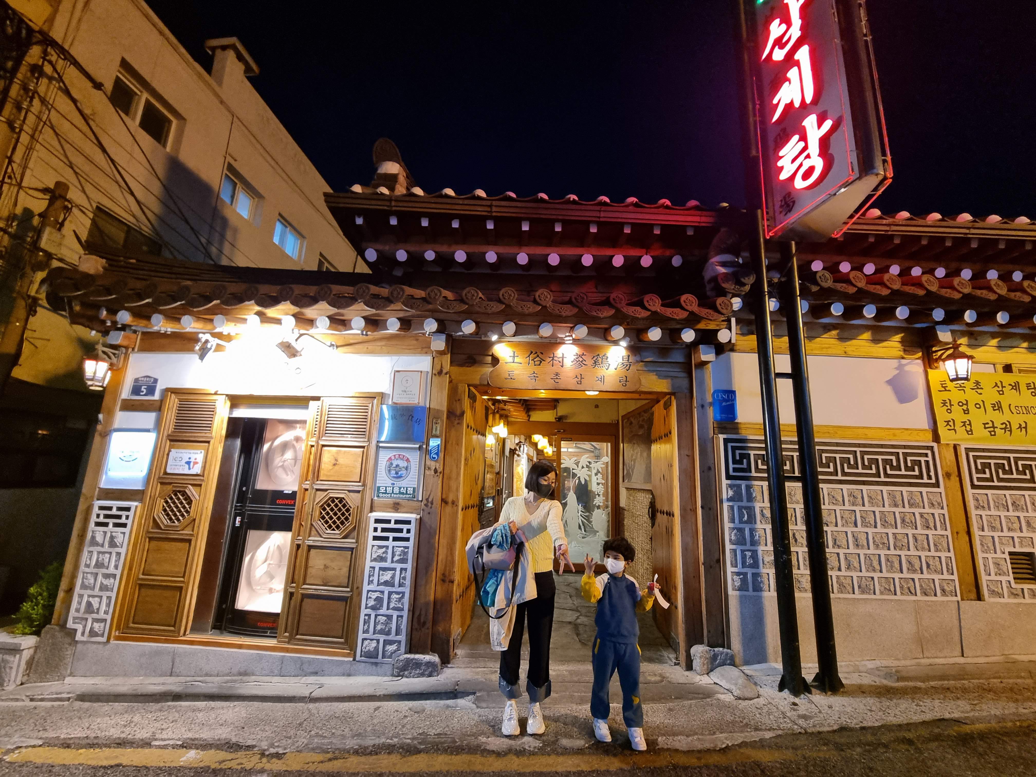 김치와 깍두기는 정말 맛있다. 아직 봄이라 그런지 저녁시간 토속촌이 한가하다. 평일 저녁이라 편하게 앉을 수 있었다. 그래도 안에 손님은 제법 많았다. 토속촌은 건물 외관에서부터 맛집의 향기가 난다. 서울 한복판에 기와지붕이 있는 한옥집이다. 가게 이름처럼 한국적인 식당이다. 맛도 메뉴도 그러하다. 안내를 받고 자리에 앉아 삼계탕 2인분과 해물파전을 주문했다. 아직 아이가 삼계탕 한 그릇을 다 먹지 못하기에 그렇게 주문을 했다. 언젠가는 나보다 더 먹을 것이다(ㅎㅎ).