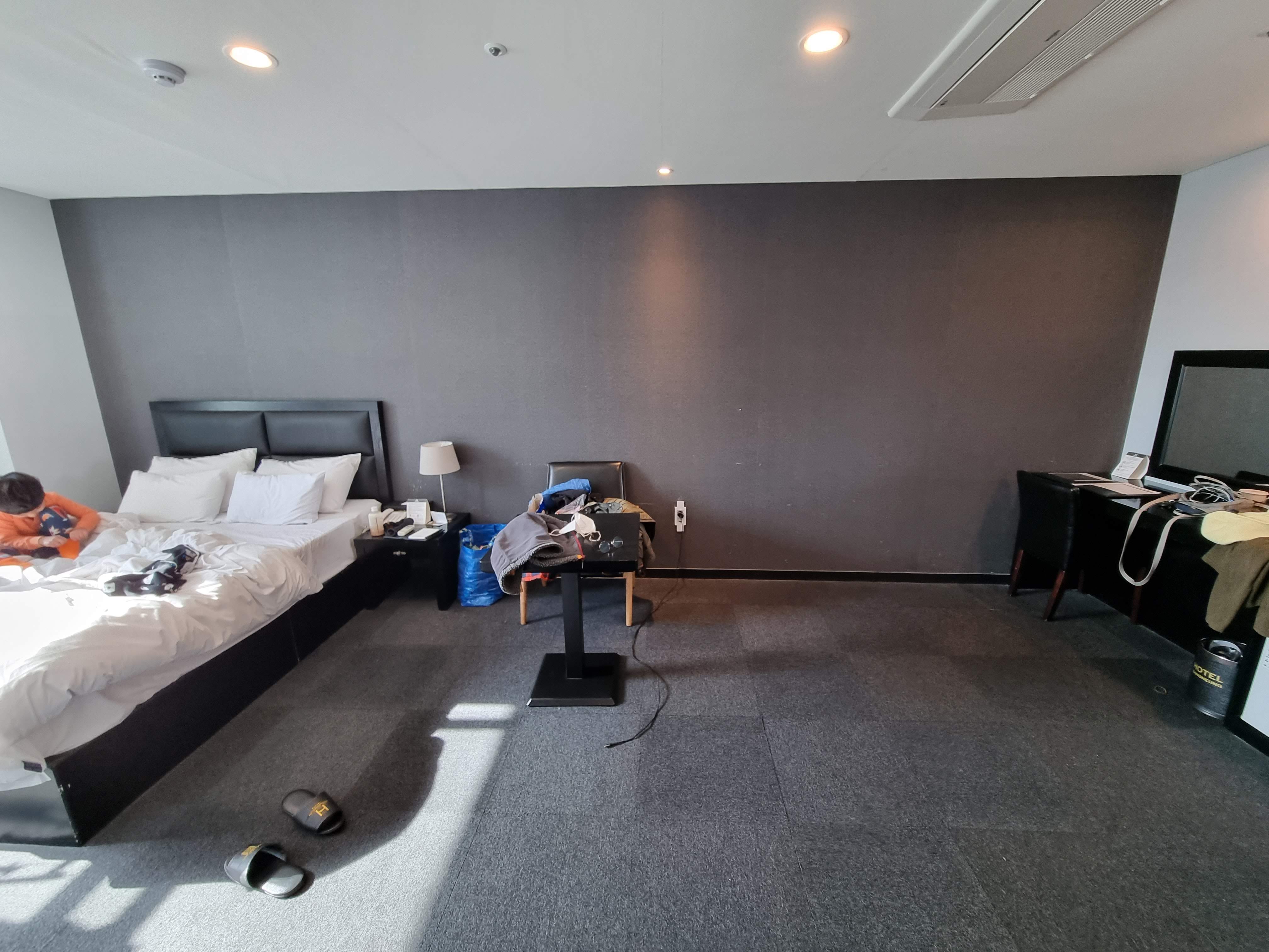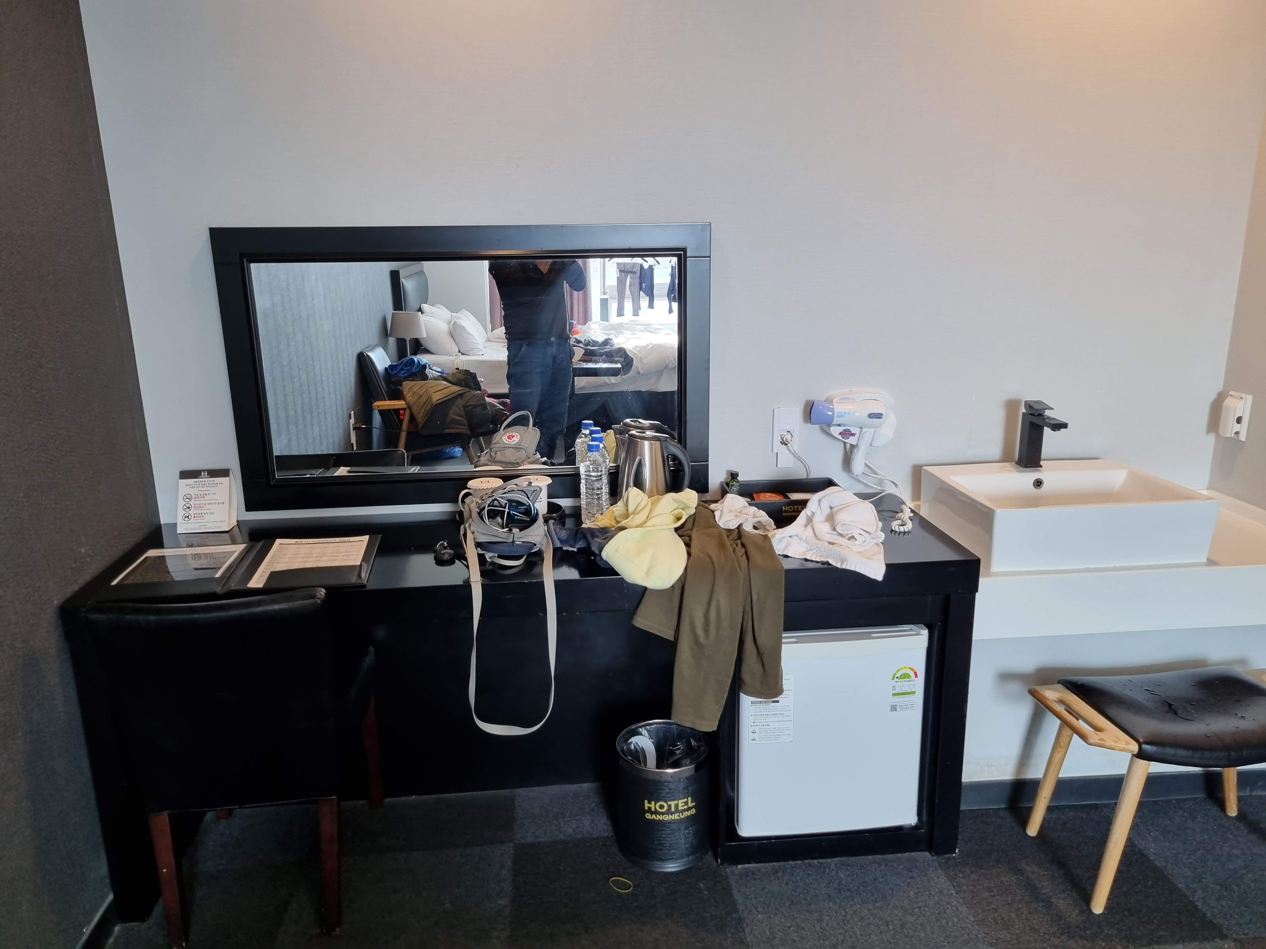 호텔 체크인을 하고 룸에 올라간다. 기억이 가물가물한데 7층에 배정을 받았다. 객실타입은 스탠더드 더블 룸이었다. 뭐 인테리어가 고급지고 그렇진 않다. 가격이 저렴하니 고급은 머릿속에서 지워야 한다. 첫 느낌은 엄청 넓다. 정말 넓다. 일반 특급호텔 스탠더드는 룸은 들어가자마자 욕실과 화장실이 있고 바로 앞에 침대가 있는 게 보통인데 요기는 들어가서 오른쪽으로 방향을 틀면 넓은 공간에 오른쪽에는 미니 냉장고와 화장대가 있고 중앙에 보조 테이블과 의자 그리고 더블 배드가 있었다. 그리고 이동이 가능한 행거형 옷걸이가 있어 편리했다. 아이는 호텔에만 오면 좋아한다. 침대에서도 뛰어놀 수가 있고 호텔에서 먹는 아침 조식에 한 껏 기대를 하기 때문이다(이번 강릉관광호텔에서도 그 설렘을 만족할 수 있을까?).