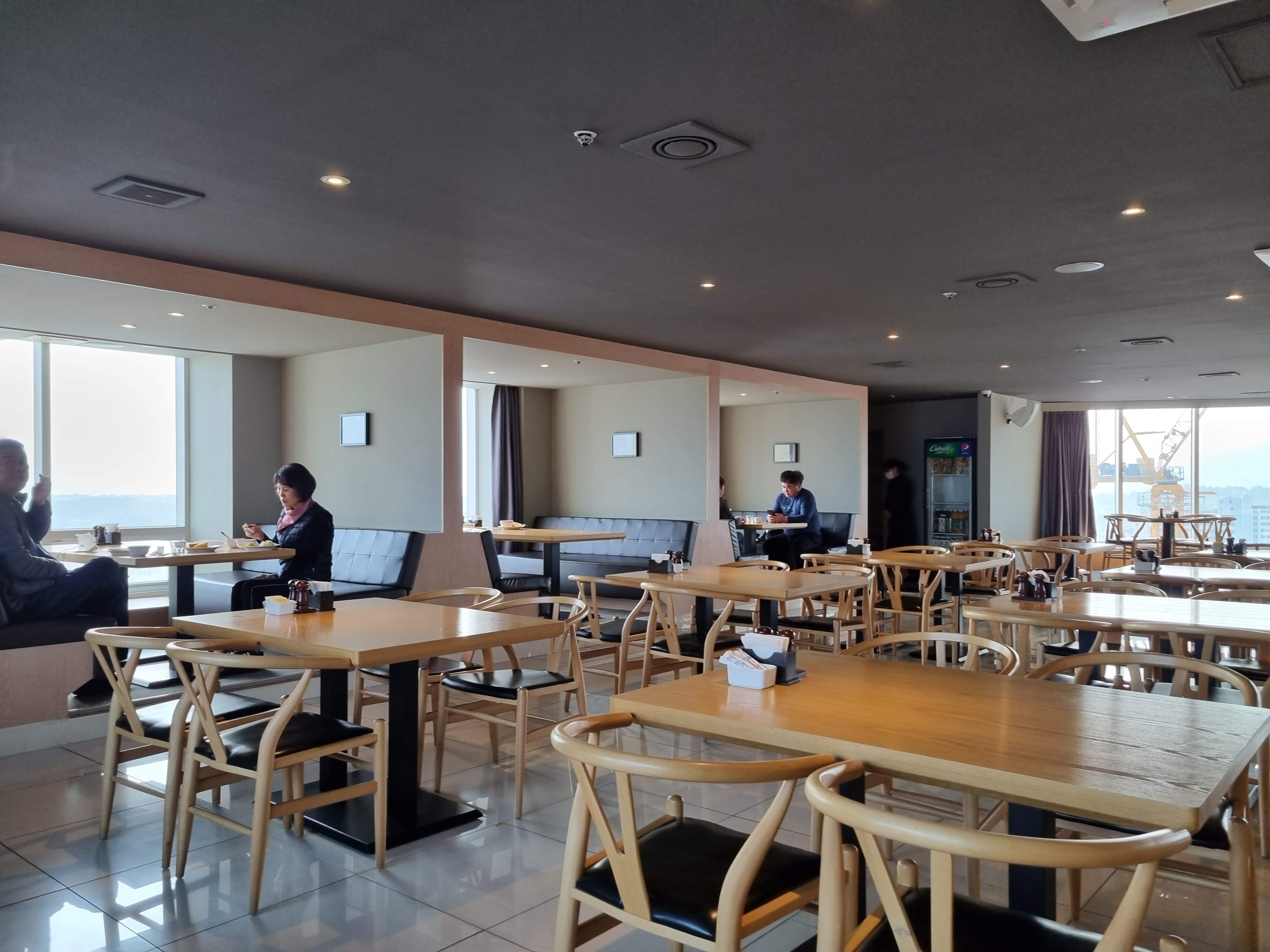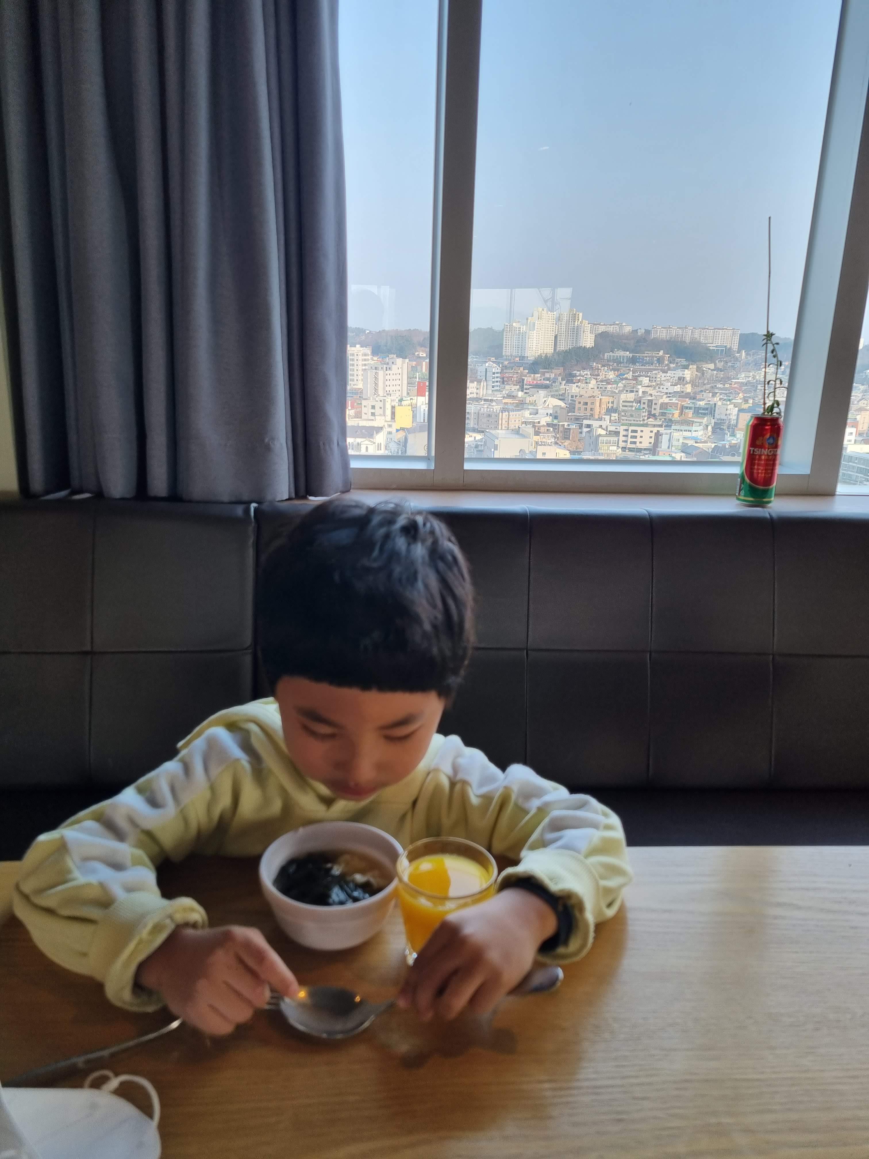 다음날 아이는 아침 조식을 먹으러 가자며 일찍 일어나 나를 깨운다. 조식 가격은 성인 15,000원, 청소년 8,000원이다. 호텔 체크인을 하면서 별도로 계산을 했다. 조식을 먹을 수 있는 곳은 호텔 15층에 마련된 스카이라운지다. 엘리베이터를 타고 올라가니 이미 창가 쪽 뷰가 나름 좋은 곳은 손님들이 앉아 있었다. 이제 조식을 먹을 시간. 아이는 주~~ 욱 둘러보더니 이내 실망한 표정이었다. 호텔 조식을 하면 음식 가짓수도 많고 아이용 식판에 아이가 먹고 싶어 하는 음식만 담아 주었던걸 먹었던 아이는 실망을 할 수밖에 없는 퀄리티였다. 둘이 합쳐 2만 원을 내고 정말 호텔 조식 같은 것을 기대하지는 않았지만 뭔가 많이 없어 보이는 아침 조식 수준이었다. 강릉을 먹거리인 순두부마저 없었다면 정말 실망을 했을 것이다. 대충 아침을 먹었다고 해야 맞을 것이다. 아침 조식을 먹으면서 이 돈이면 강을 맛집을 가서 사 먹는 게 차라리 더 낳을 뻔했다는 생각이 머릿속에서 지울 수가 없었다. 아이도 미역국에 밥을 먹는 둥 마는 둥 하고 아침 조식을 마치고 내려왔다. 그나마 볼 만한 것은 강릉시티뷰였다. ㅎㅎ