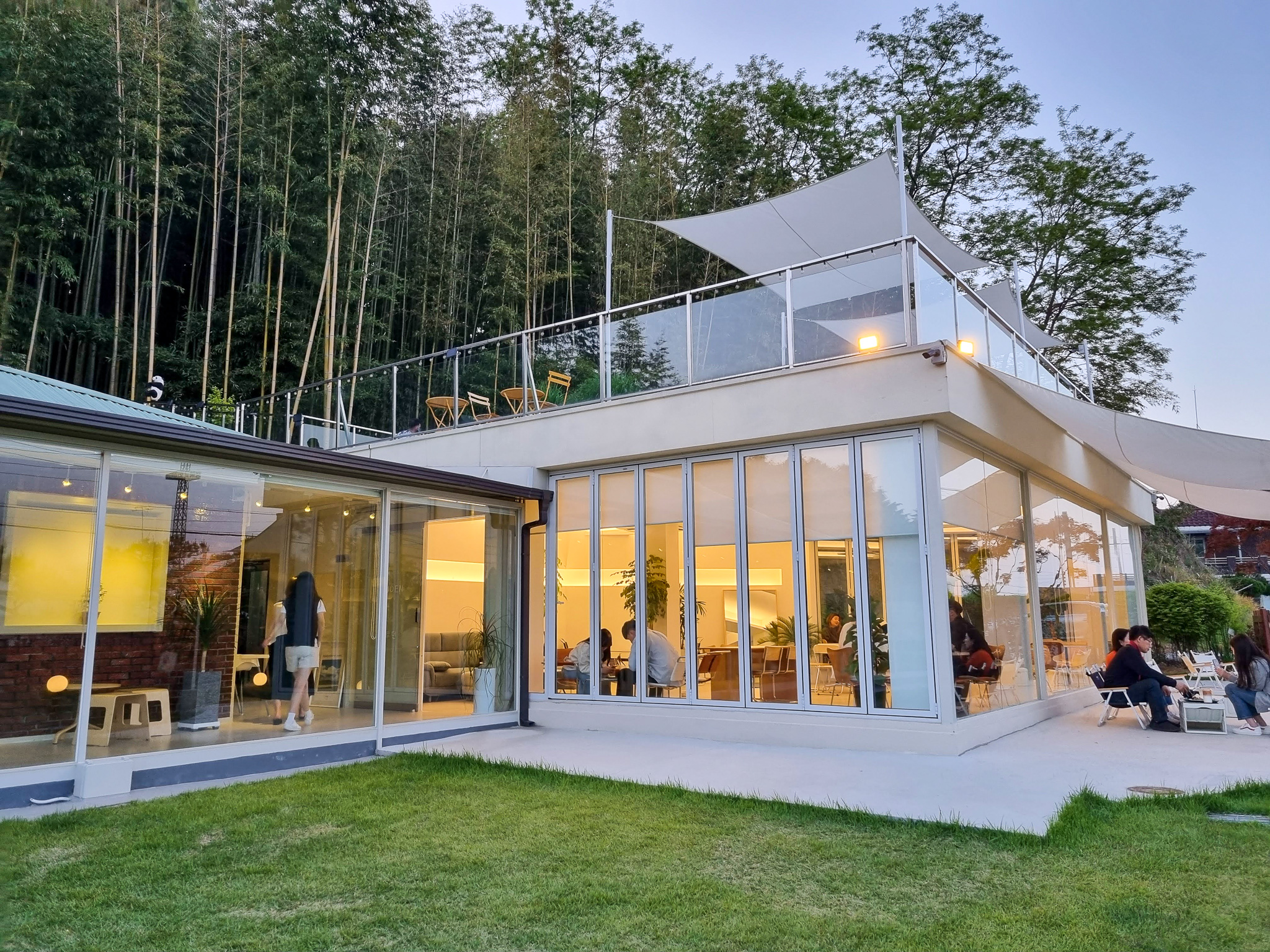 군산의 적산가옥은 아니어도 함석지붕의 벽돌집을 새롭게 리모델링 해서 카페를 만들었다. 집을 이루고 있는 외벽의 벽돌만 그대로 남기고 천정과 테라스 등의 공간의 새롭게 모델링을 했다. 카페의 뒤에는 너무도 곧게 뻗은 대나무들이 빽빽하게 들어서 있었다. 옛 것을 그대로 살리면서 공간을 새롭게 해석했다. 요즘 이런 인테리어 스타일을 많이 볼 수가 있다. 카페 주변으로 심어놓은 나무와 풀들까지 카페 조경이 심상치 않다. 카페와 조금 떨어진 별채 같은 건물 앞에 놓은 분재들도 저마도 모양새를 뽐내고 있다. 커튼 사이로 보이는 방 안에는 수석까지 보인다. 주인장의 직업이나 관심을 미루어 짐작할 수 있다.