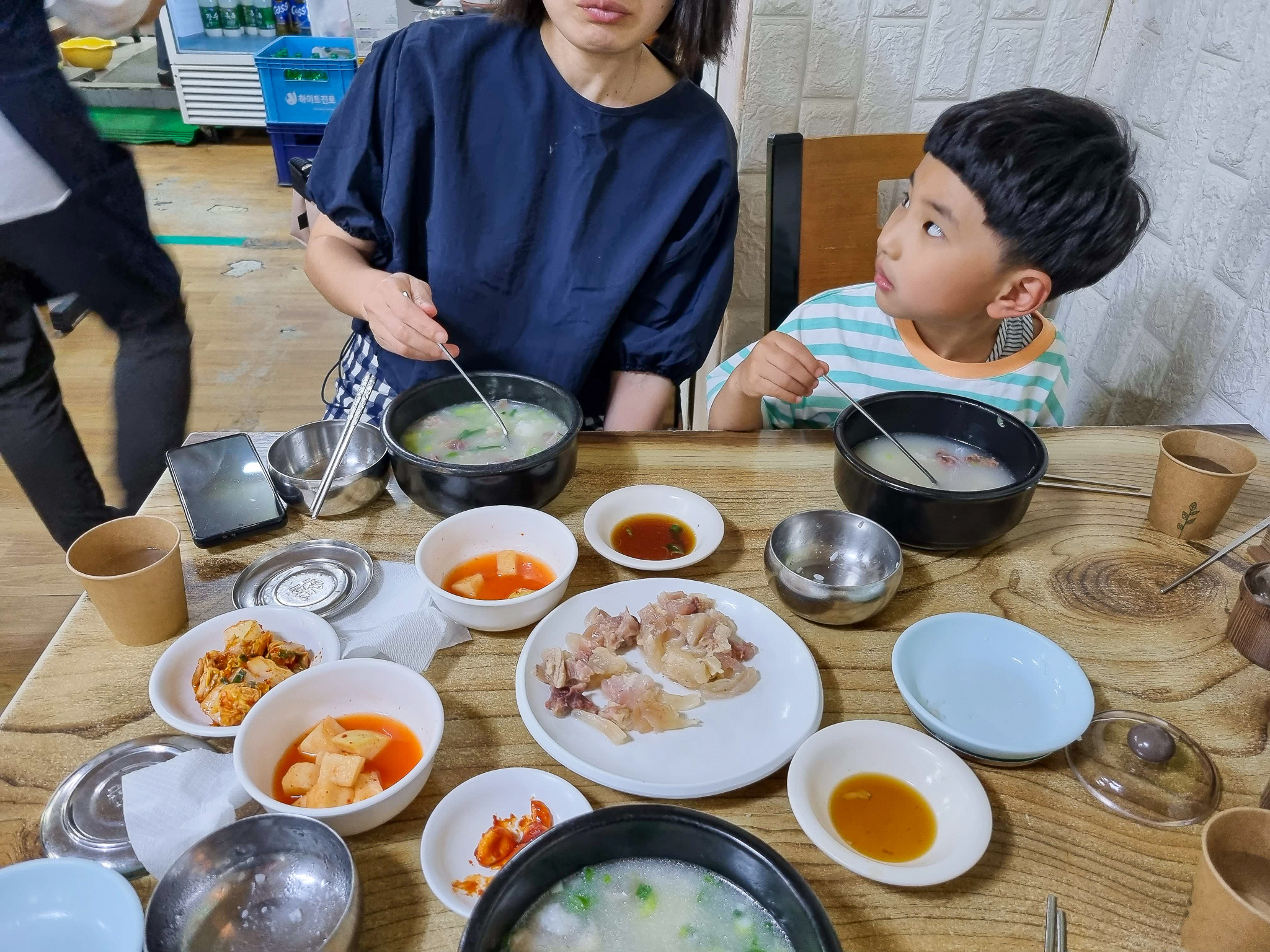 원래 그런 것인지 수육이 나온 지 한 참 지나도 탕이 안 나오길래 서빙하시는 이모님께 물어보니 수육을 다 드시고 갖다 준다고 해서 바로 달라고 했다. 그래서 나온 도가니탕 두 그릇. 아이가 있다고 공깃밥 하나를 서비스로 주셨다. 보통을 시켰지만 도가니탕 안에 꽤 고기가 많이 들어가 있었다. 다음에는 수육을 안 시켜도 될 정도였다. 국물은 뽀얗고 약간 걸쭉한 깊은 맛이 났다. 살짝 반찬이 탕의 맛을 못 쫓아가는 건 아닌가 하는 생각이 들긴 했지만 김치 깍두기도 많은 양념을 하지 않으면서도 깔끔한 맛을 내주었다. 개인적으로는 고춧가루 많이 들어간 경복궁의 토속촌 김치 깍두기를 좋아한다.