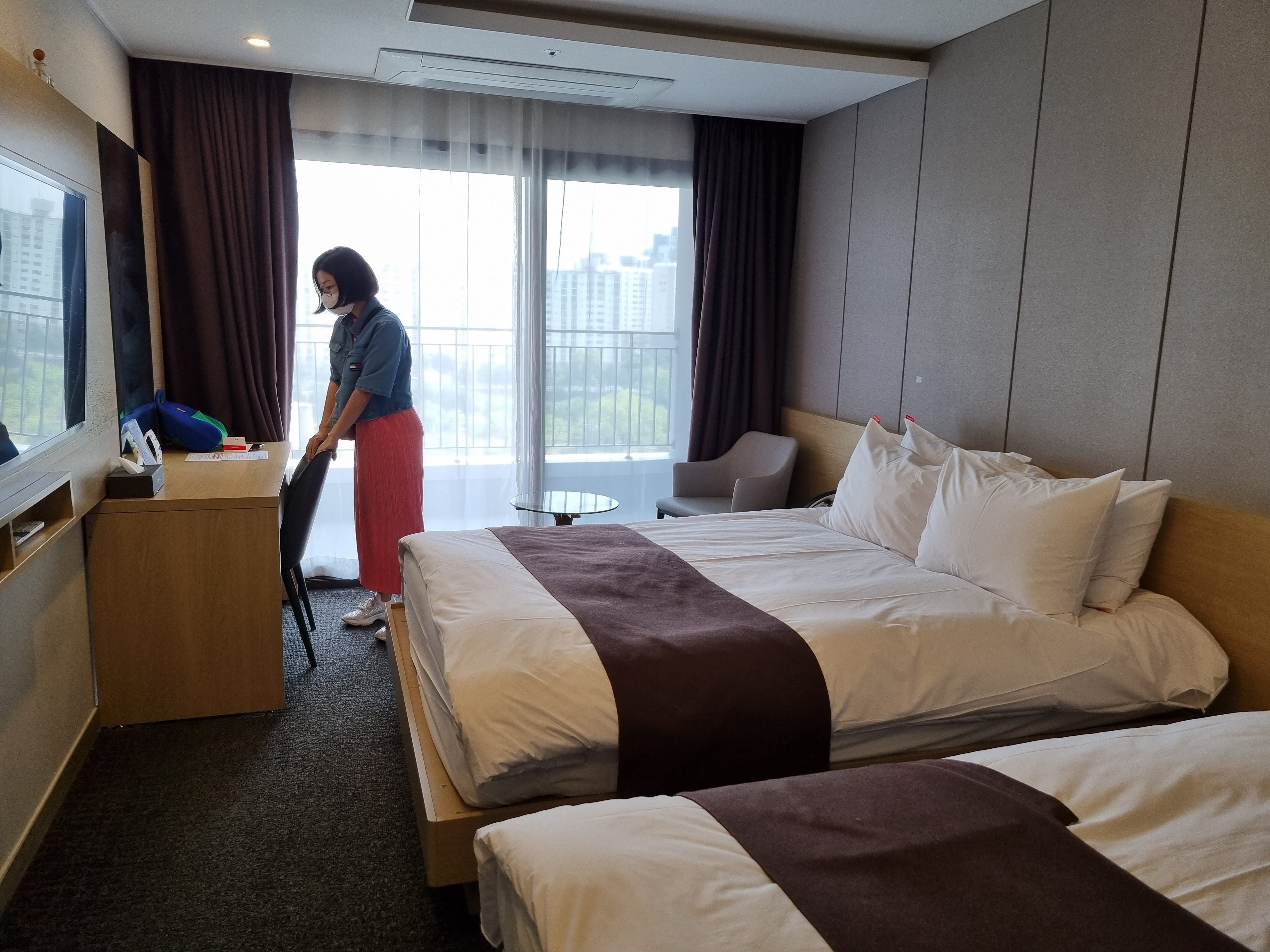 춘천역에서 내려 캐리어를 끌고 택시를 잡고 호텔로 향한다. 역에서 호텔까지는 약 1.6km로 택시로 5분 정도 택시비는 4.200원이 나왔다. 호텔 도착 시간은 오후 2시 30분이 좀 지난 시간이었는데 체크인을 할 수 있었다. 체크인을 하고 객실은 919호를 배정받았다. 객실 타입은 스탠다드 트윈이다. 뷰는 공지천이 살짝 보이는 시티뷰다. 뭐 나름 나쁘지 않았다. 객실은 오픈한 지 얼마 안 돼서 그런지 침대나 객실 상태 등이 깨끗하고 청결했다. 우리 가족 예약은 주말 예약이었지만 차를 가져오지 않은 조건의 친환경 패키지로 예약을 해서 나름 저렴하게 3인 가족 10만 5천 원에 예약을 했었다. 가격은 개인마다 시기마다 프로모션마다 다르기 때문에 참고만 하기 바란다.
