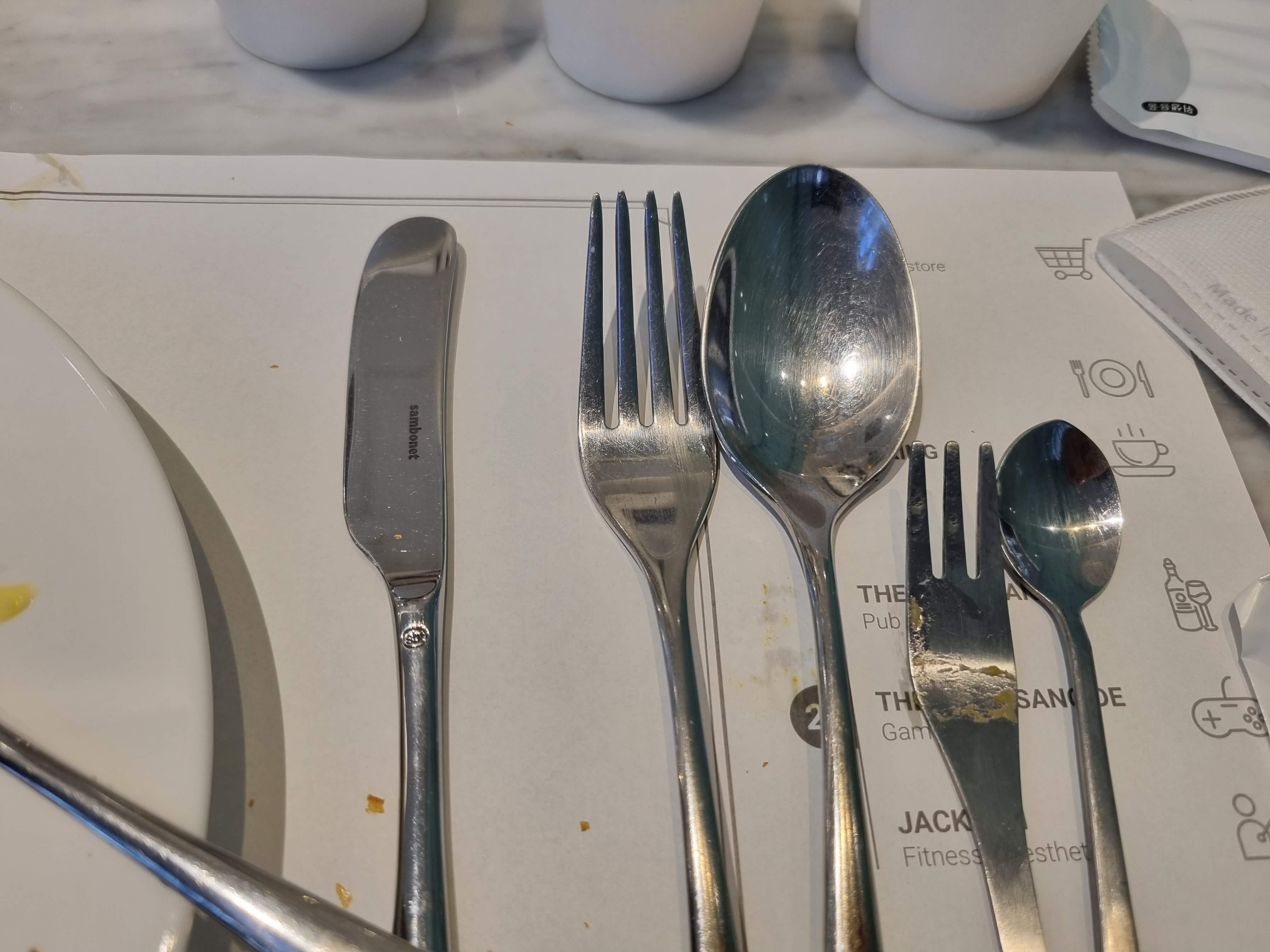 - 아이들이 사용하는 포크와 수저 이야기인데 내 아이가 6살인데 뷔페에서 제공하는 포크와 수저는 과일 찍어 먹는 포크와 티 스푼 수준의 정말 작은 기물이었었다. 아이도 먹다고 너무 작아서 성인용 포크와 수저로 먹었다. 중간 정도의 포크와 수저를 준비해 주셨으면 좋겠다.