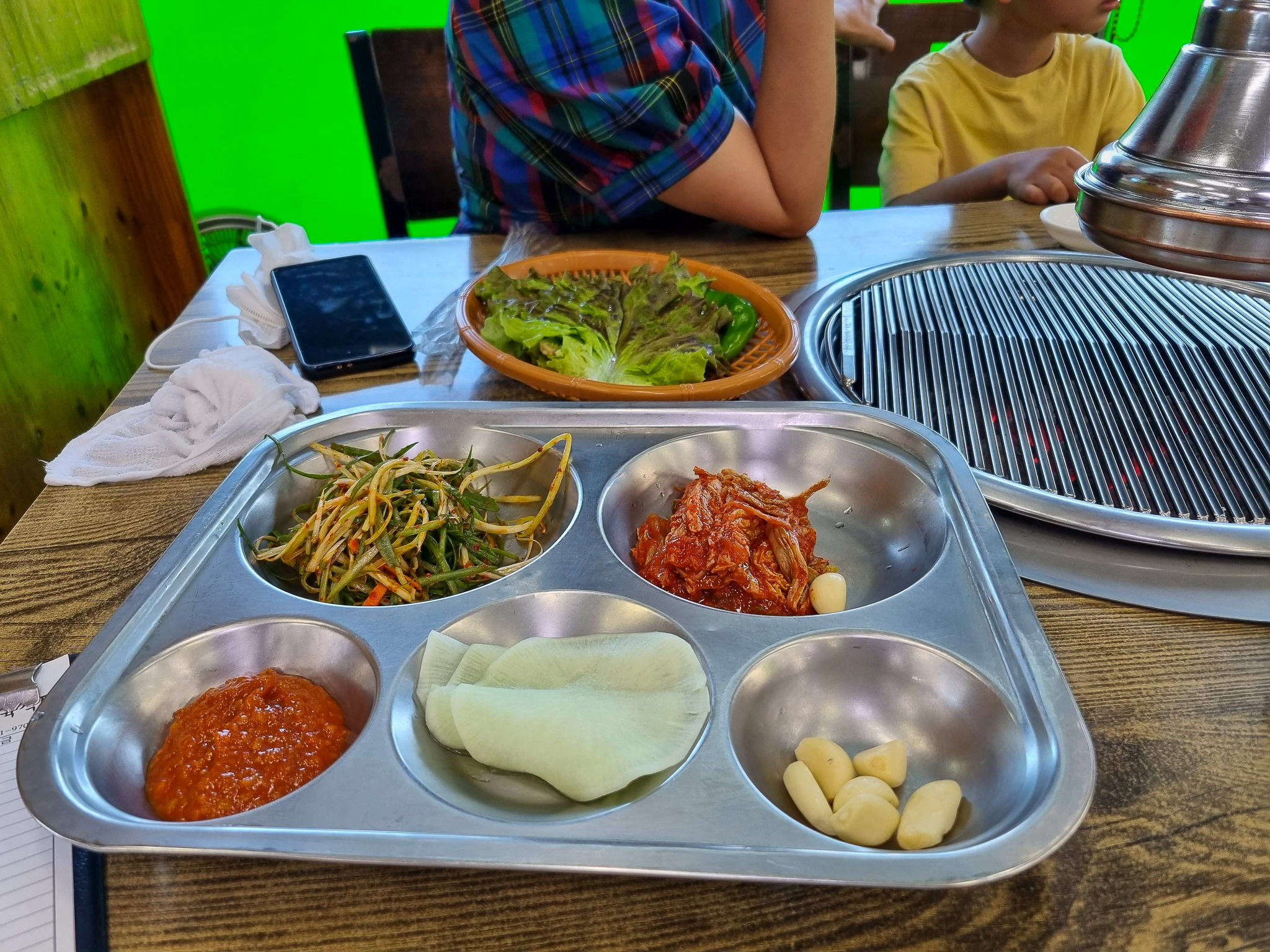 우선, 처음이라 메뉴를 둘러보았다. 소고기와 돼지고기가 각 부위별로 가격이 표기되어있다. 근데 여기는 600g 기준이었다. 오랜만에 소고기도 먹을 겸 해서 여사장님이 추천해주시는 업진살을 주문했다. 처음에 업진살을 먹고 돼지고기를 더 시킬 계획이었다. 주문을 하자 숯불이 들어오고 반찬들이 나오기 시작했다. 반찬은 스테인리스 식판에 담겨 나왔다. 옛날 급식 먹을 때 생각도 나고 군대 식판도 생각이 나는 감성적인 식기였다.