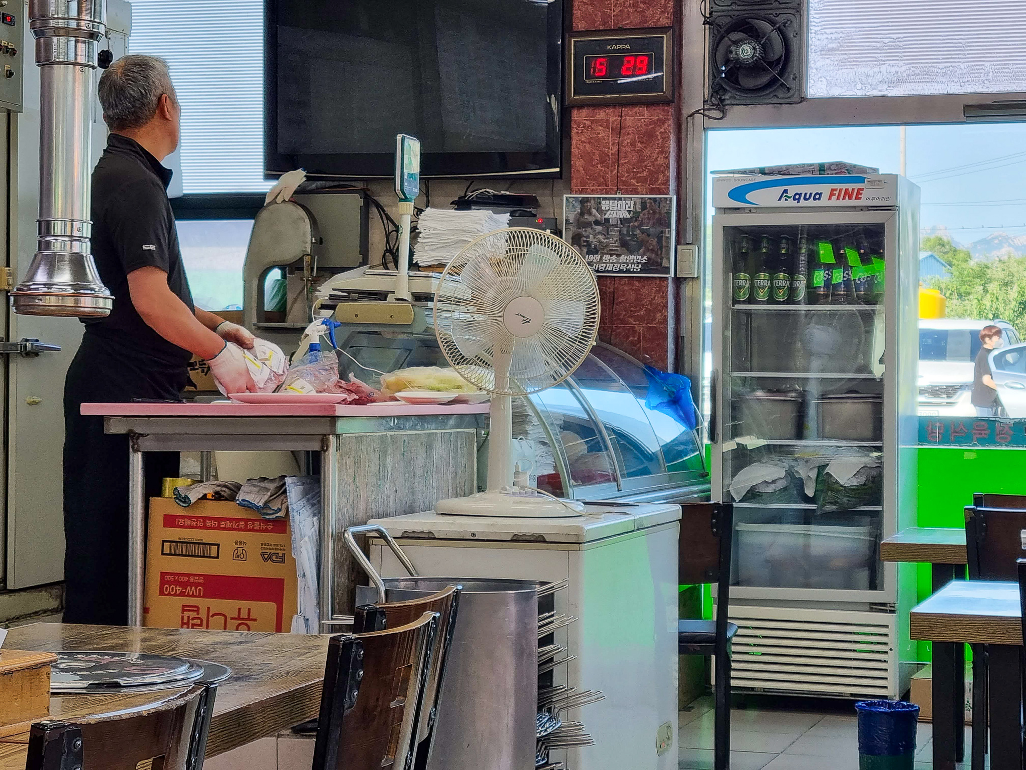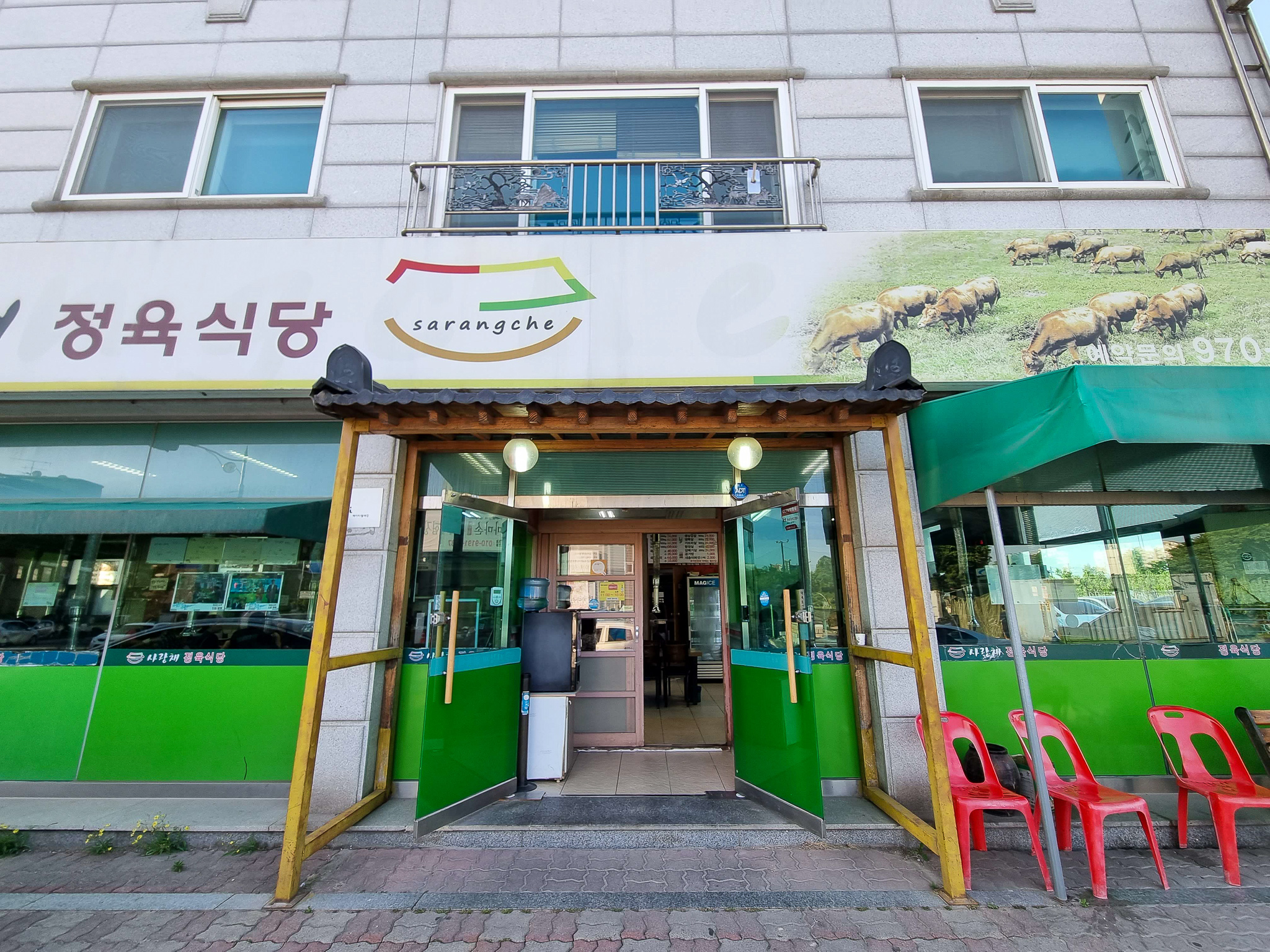 어제 쉬는 날을 맞아 텃밭에서 물을 주고 텃밭 터줏대감 어른으로부터 옥수수 재배에 대한 노하우도 배우고 나서 '사랑채 정육식당'으로 향했다. 텃밭에서 아주 가까운 곳으로 나는 므흣한 상상에 나래를 펼치고 있었다. 동네라서 와이프에서 운전을 맡기고 나는 소주 한 잔을 할 계획이었다. 주차장을 식당 바로 옆에 넓은 공간이 있다. 저녁시간이 되어서 그런지 이미 주차장을 거의 다 차 있었다. 주차를 하고 나서 아내가 자리 잡은 카운터 옆 자리에 앉았다.