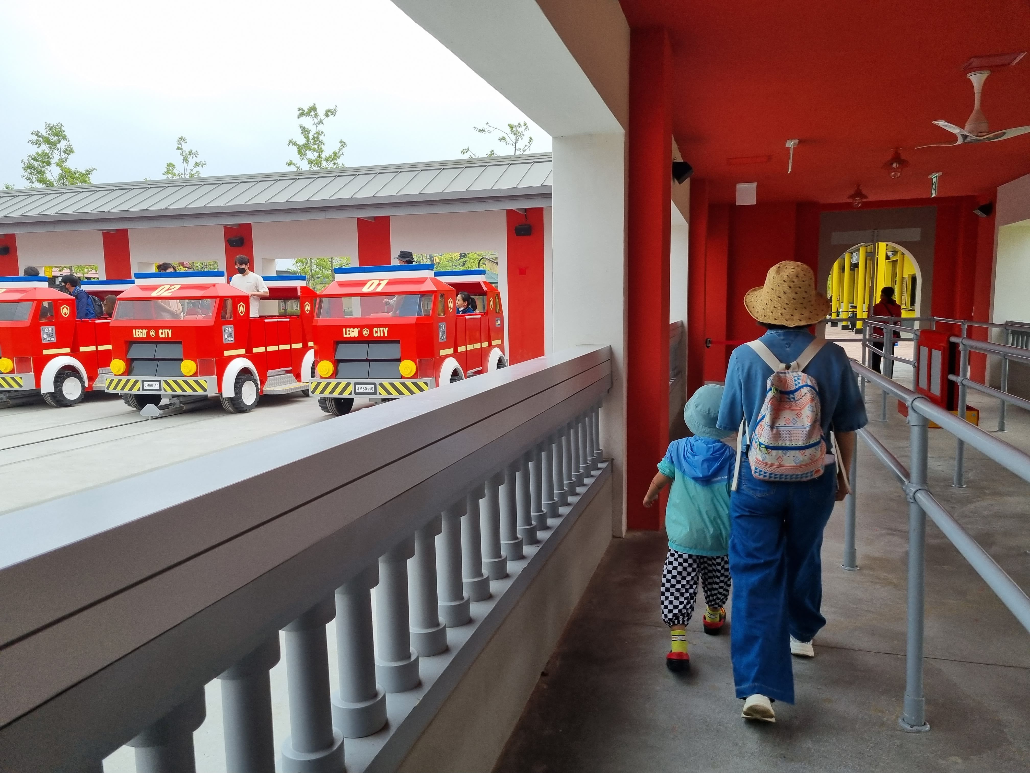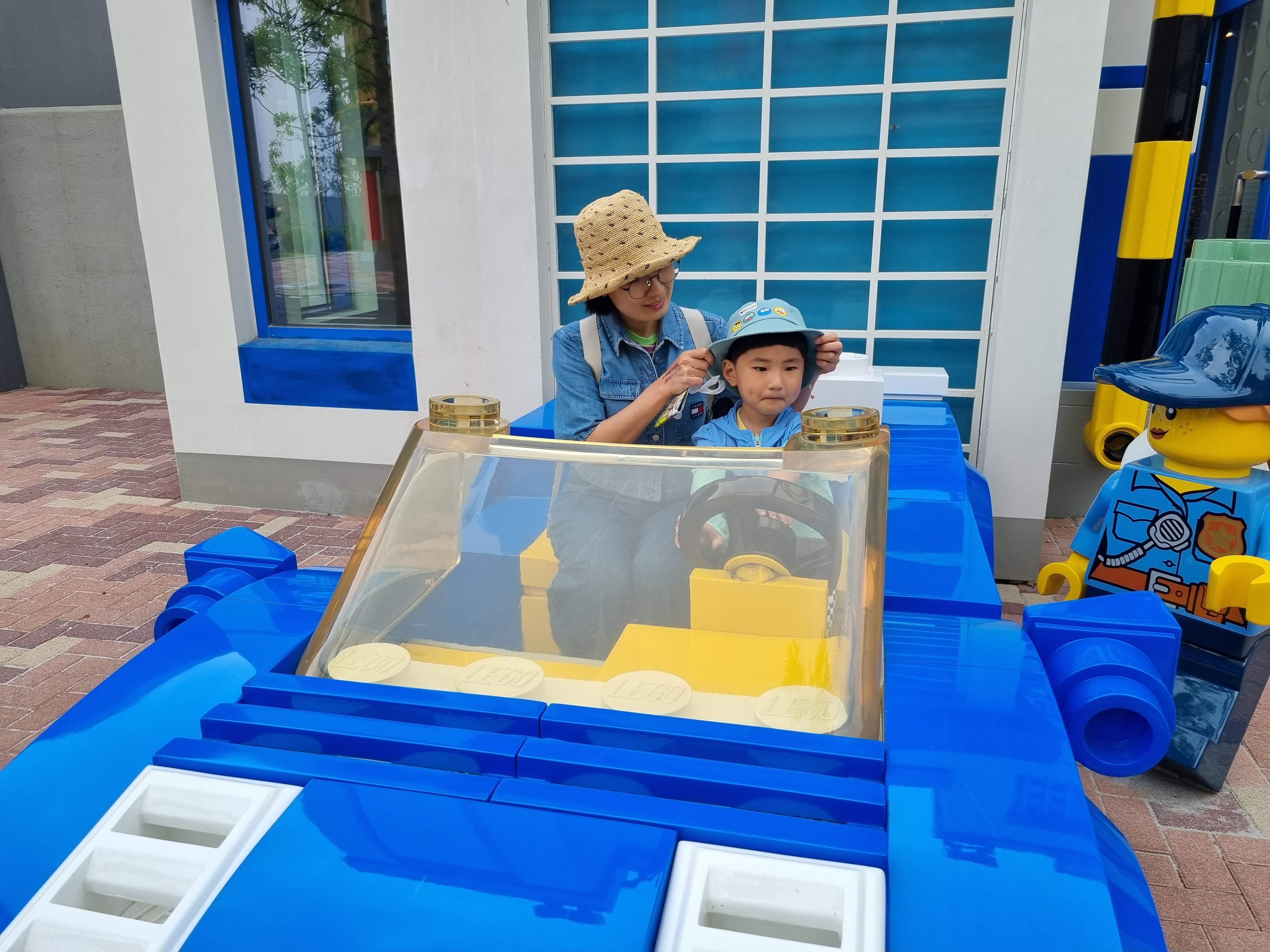 주니어는 싱겁다. 드라이빙 스쿨을 마치고 산책을 하듯 레고 시티를 즐긴다. 아직 아침 시간이라 햇볕이 따갑지는 않았다. 웨이브 레이서는 지나치고 시티 경찰서에서 사진을 찍었다. 레고랜드는 가는 곳마다 레고로 만들어진 캐릭터며 모형들이 있어 사진을 찍기에도 좋고 앉아보기도 해서 심심할 틈이 없다. 그 뒤를 이어 '파이어 아카데미'에 도착.