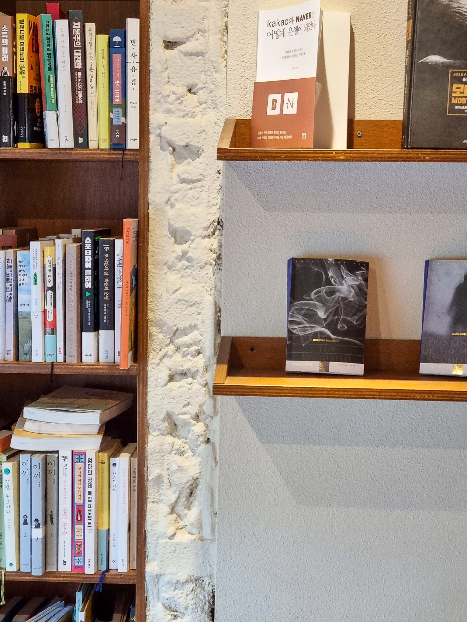 골목쪽에서 들어가는 입구나. 간판을 보면 골목쪽에서는 한글로 대로변 쪽에서는 영어로 간판을 만들었다. 건물은 전체적으로 리모델링을 한 것 같다. 외벽은 적벽돌로 포근하게 감쌌고 들어가는 입구는 우드로 되어있었다. 안에 들어가니 규모는 상상했던 것보다 작아서 약간 놀랐다. 우측으로는 커피를 주문하고 만드는 바가 있었고 홀 중간과 왼쪽과 안쪽 벽에는 책들로 구성이 되어 있었다. 입구에 들어서서 바로 좌측으로 당인리 책발전소에 나름 유명하다는 족자 형태의 베스트셀러 목록이 눈에 들어왔다(내가 읽은 책이 아무것도 없다니 ㅜㅜ). 그냥 구경만 하면서 둘러보다 나올 생각이었는데 2층에 앉아 있으려면 무언가 시켜야 될 것 같은 분위기에 압도되어 평소에 먹던 아이스라테를 주문하고 2층으로 올라갔다.