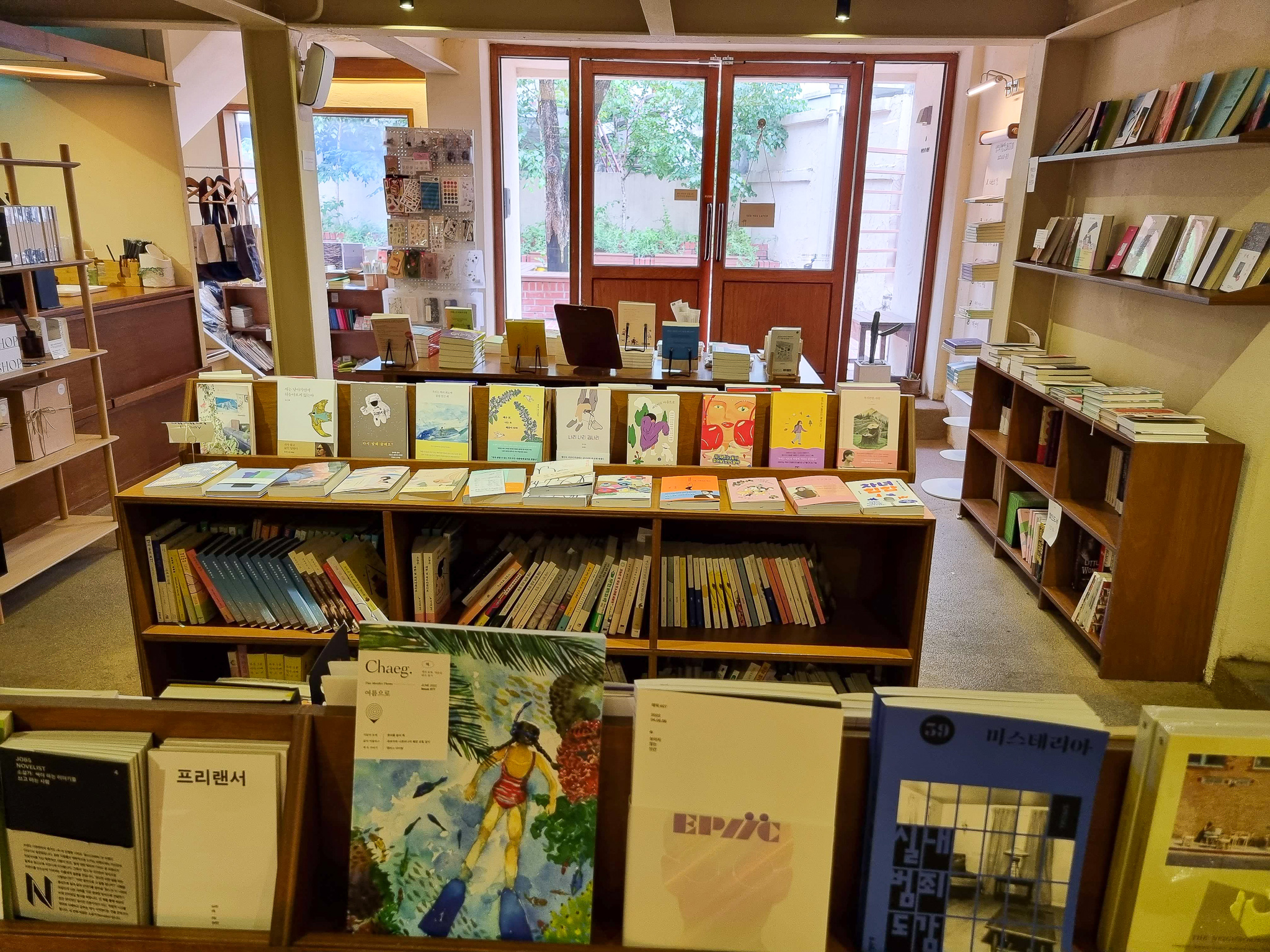 우드 블라인드가 잘 어울렸던 카페. 프레임 공사를 했구나. 전체적인 분위기는 우드톤의 포근한 느낌이었다. 왠지 가을과 겨울에 더 잘 어울린 것 같은 따뜻한 분위기였다. 30여분이 지났을 무렵 오랜만에 합정동에 나온 나로서는 더 앉아있을 수 없었다. 카페 분위기가 안 좋아서가 아니라 더 가볼 곳이 많아서 마음이 바빴기 때문이다. 마지막으로 기념품이나 책을 사서 나가려고 하던 마음을 용케 달래서 빈손으로 나갈 수 있었다. 마당에 있는 감나무와 자작나무가 가을이 되면 더 포근할 것 같았다.