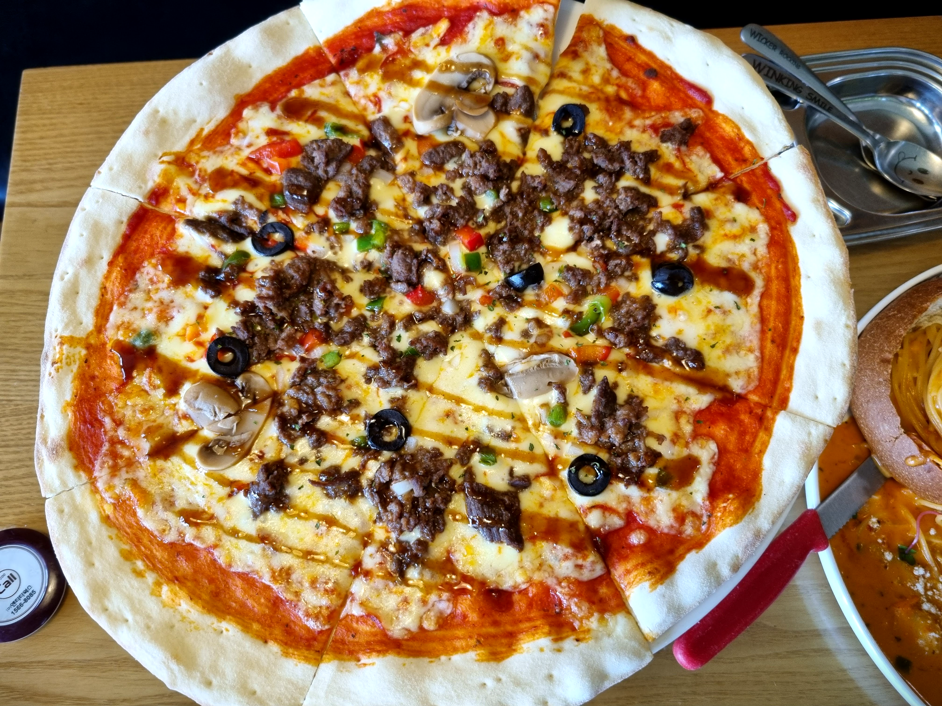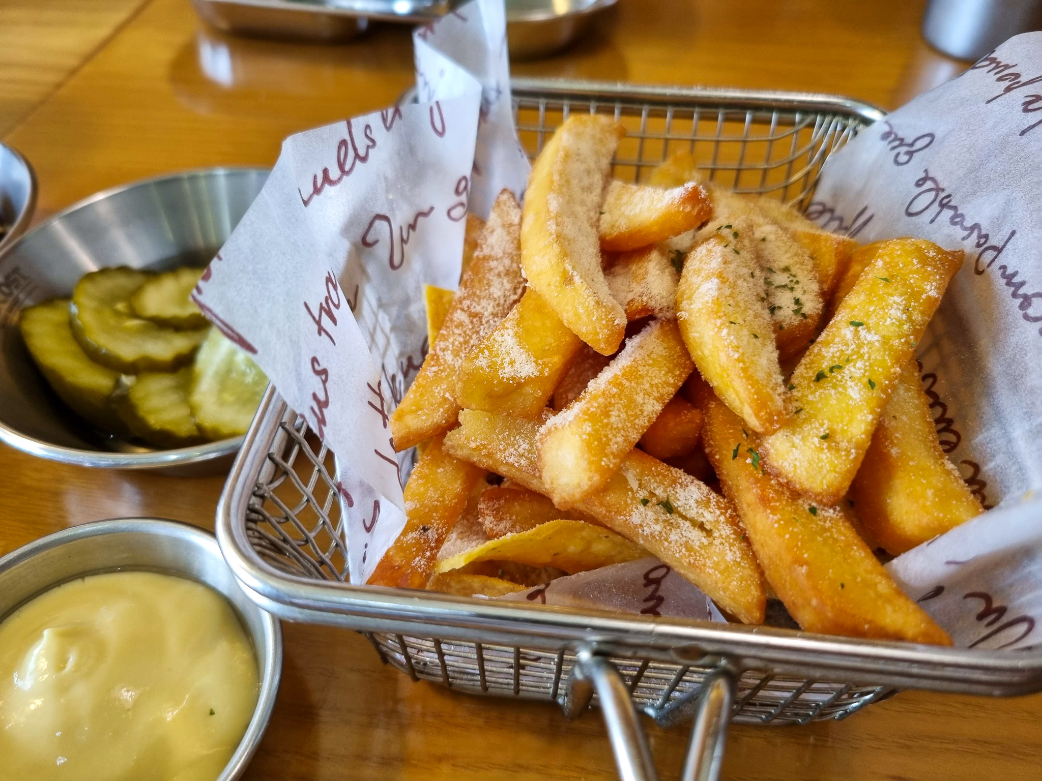 입구 바로 오른쪽에 있는 놀이방. 오락기계는 무료다. 나름 페밀리 레스토랑에 다녀봐서 그런지 익숙한 인테리어다. 들어가자마자 바로 오른편에 아이 놀이방이 있다. 유아동기의 아이가 있는 부모라면 식사 약속 잡을 때 놀이방이 있는 식당 예약을 선호한다. 라라코스트는 그런 점에서 일단 이점이 있다. 날씨는 무척 더웠지만 홀의 온도는 시원했다. 창가 자리 근처 넓은 자리를 잡고 주문을 한다. 익숙한지 와이프가 성인 3명과 아이 3명의 먹을 음식을 미리 주문한다. 와이프 친구가 10분 정도 후에 온다고 했는데 홀에 손님이 별로 없어서인지 주문한 음식은 채 10분이 안돼서 나오기 시작했다. 순간 여기가 패스트푸드점인가 할 정도였다. '빠네로제 파스타'가 나오고 '벨지안 포테이토', '불고기 피자', 탄수화물을 안 먹는 나를 위한 '모짜렐라 샐러드', 그리고 아이들을 위한 '수제 포크커틀렛'까지 순식간에 음식이 차례차례 나왔다.