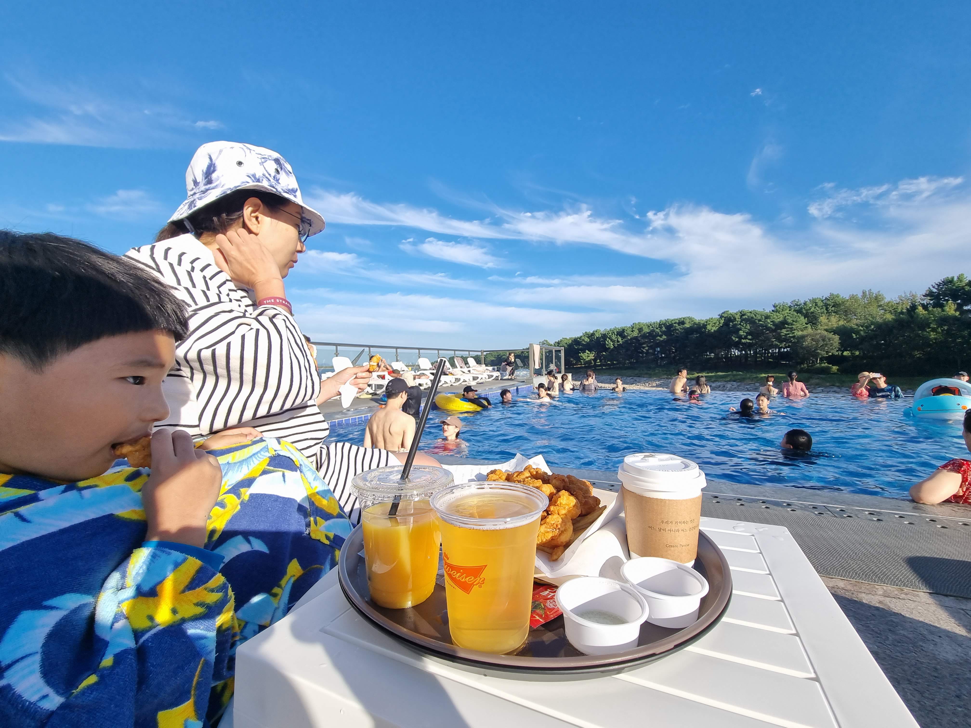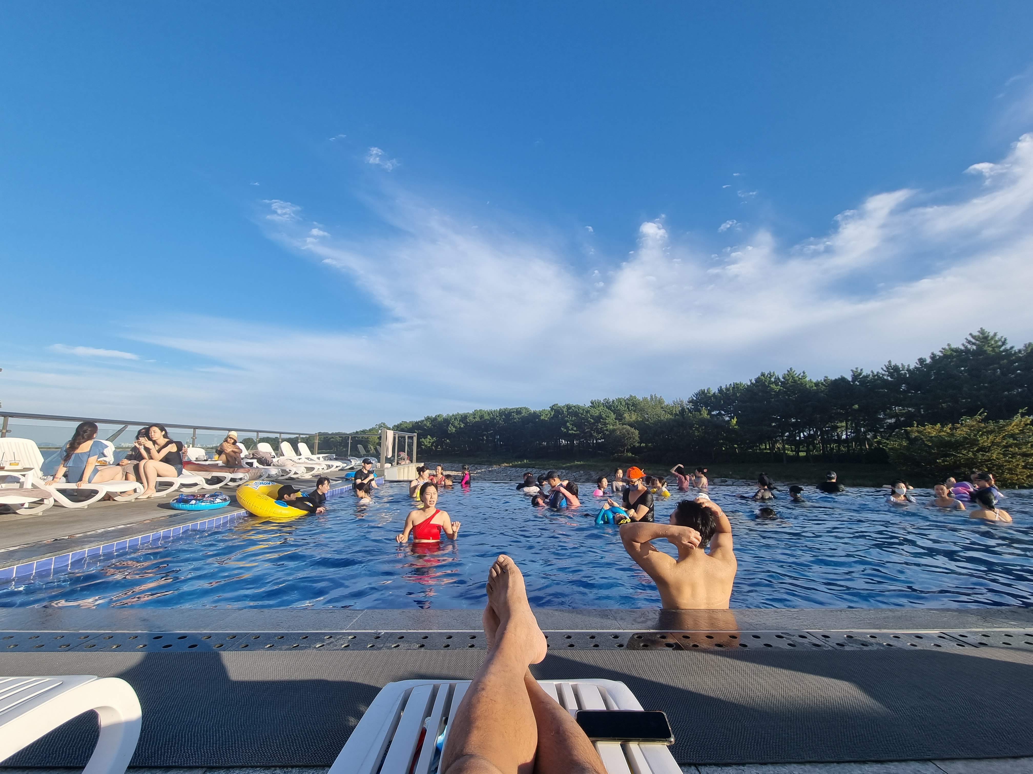 호텔 풀은 수온이 중요한데 기본 가장 큰 풀도 무척 따뜻했다. 온천물과 같은 온도는 아니었지만 기본 가장 큰 풀이 수온이 정말 따뜻하고 기분 좋을 만큼 온도가 딱 좋았다. 온천물과 같은 높은 온도의 풀도 있으니 걱정하지 말지어다. 3개 정도의 풀이 있어 가족이 사용하기에 좋았다. 하지만, 이날은 사람들이 오후 3시 이후 너무도 많았다. ㅎㅎ. 다들 나같이 일요일에 가면 한가하게 이용할 줄 알고 예약을 한 것인지 의심의 눈초리로 처다 볼 수밖에 없었다. 인티니티 풀에서 보는 광경도 너무 좋았다. 억새와 조용한 해안가와 송림은 흡사 동해안 경치 좋은 포구 같은 그림을 그려냈다. 간간히 먹는 맥주와 스낵은 좀 비싸지만 이해할 수 있었다.