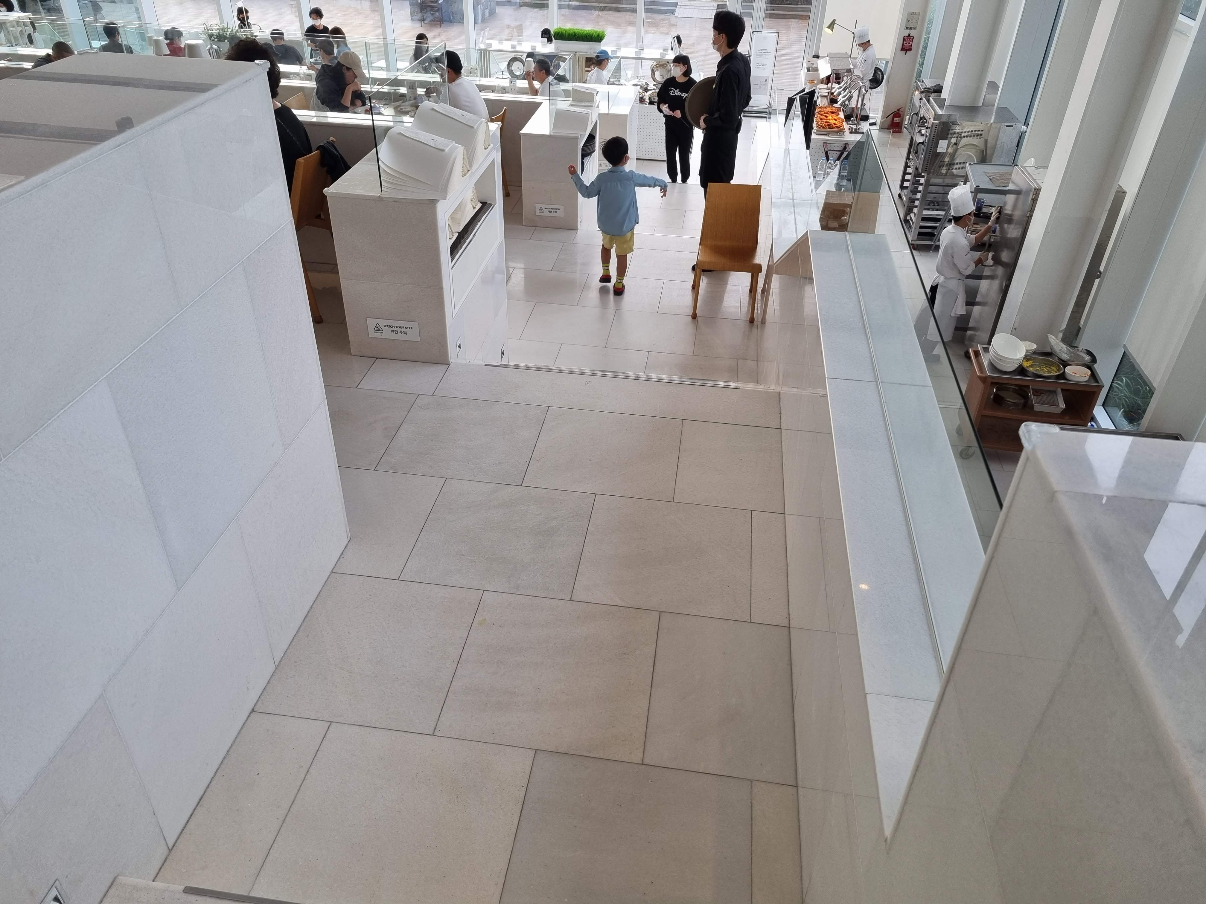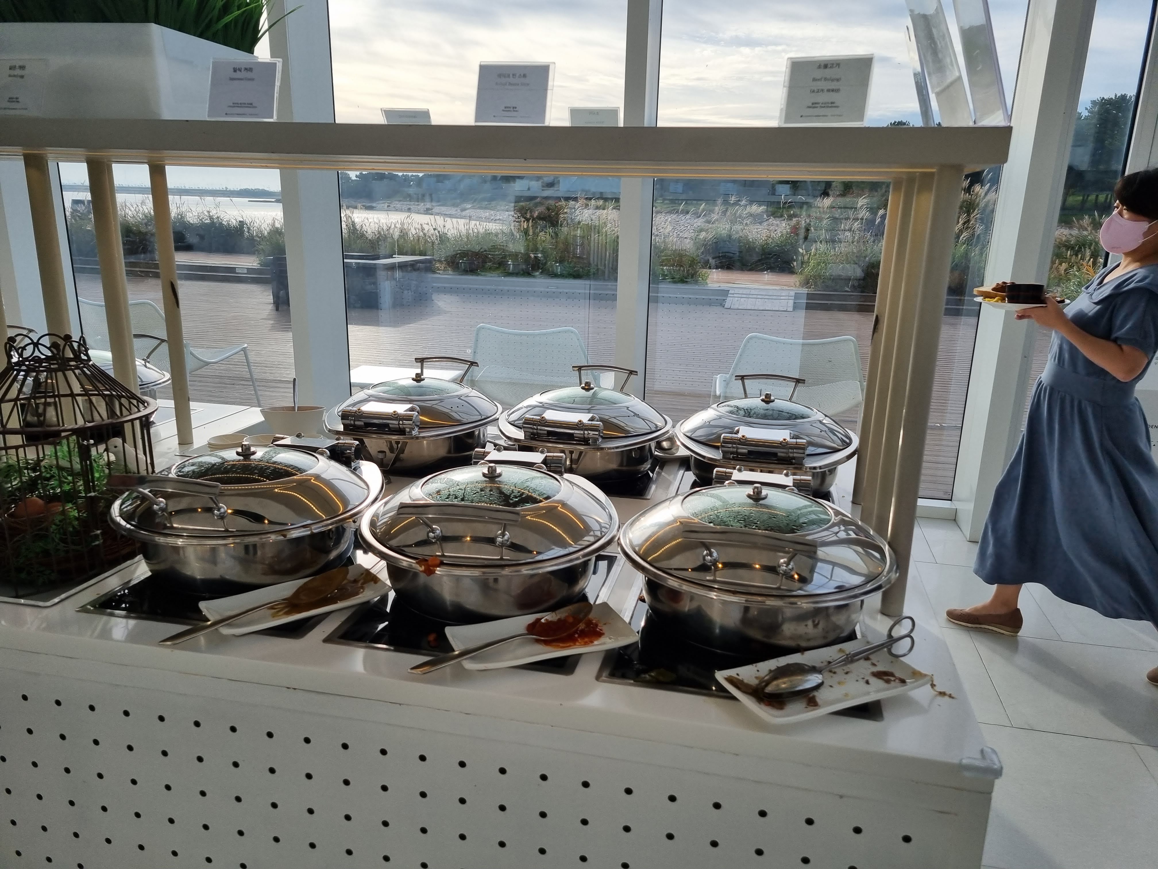 호텔 조식은 나름 내가 생각하는 기준이 있다. 음식의 종류나 맛의 퀄리티가 내 기준에 따라 평가가 달라진다. 네스트 호텔은 음식의 종류에 있어서는 다양하지 않고 심플하다고 해야 더 어울리고 음식에 무게감을 주는 호텔은 아니었다. 지역특성을 고려한 메뉴도 전혀 없다. 즉석코너는 오믈렛 이외에는 별 먹을 것이 없었다. 디저트나 베이커리 또한 정말 기본적인 것만 있었다. 다만 통창으로 보이는 뷰가 멋이었는데 시간이 좀 지나 아침 9시가 넘어서니 블라인드가 내려와 풍경을 가려 버렸다. 그리고 제일 큰 단점은 테이블 동선이 너무너무 안 좋고 음식을 담기 위해 가장 높은 곳에 앉은 우리 가족은 3층 높이에서 계단으로 내려가야 했다. 성인도 위험하지만 아이들 같은 경우에는 음식을 딜리버리 하기가 너무 힘들었다. 그리고 룸 규모에 비해 좌석수가 너무 적어서 웨이팅 시간이 길었다.