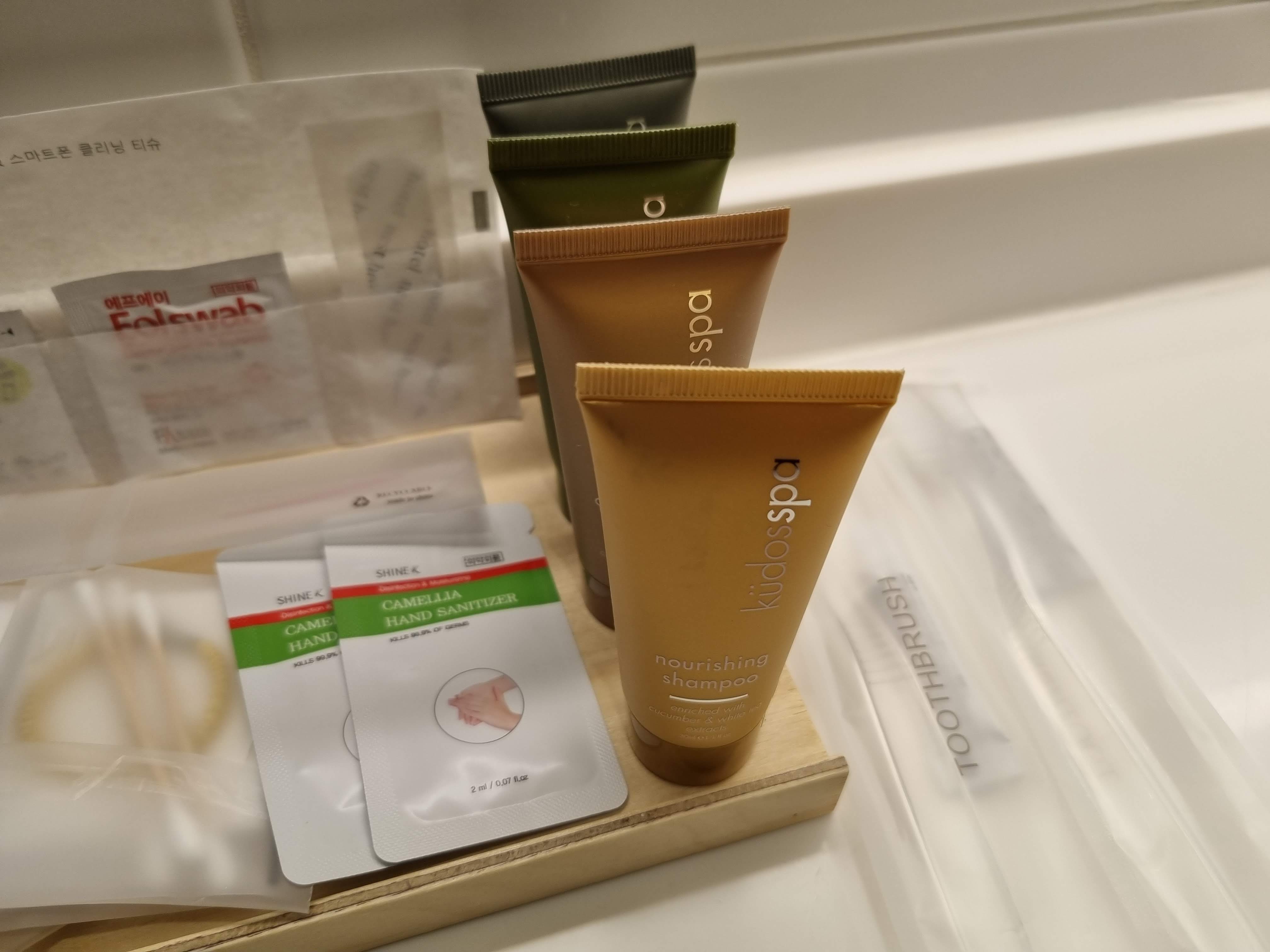 오션뷰를 요청해서 룸키를 받았는데 5층이라서 조금 실망했다. 와이프는 체크인할 때 높은 층으로 달하고 이야기하지 왜 안 했냐며 나에게 또 잔소리를 했다. ㅜㅜ 너 높은 층은 더 비싼 객실이겠거니 하고 넘어갔다. 룸은 깨끗하고 관리가 잘 된 것처럼 보였다. 하지만, 3 가족이 함께 자기 위해서는 트윈 침대를 붙여야만 가능했다. 싱글 침대 2개가 따로따로 썼으면 아이는 잘 곳이 없었다. 조명이나 화장실 책상 등은 깔끔하게 관리되고 있었다. 침대를 옮길 때 카펫 바닥에서 슬리퍼가 나오긴 했지만 크게 신경 쓰지는 않았다.
