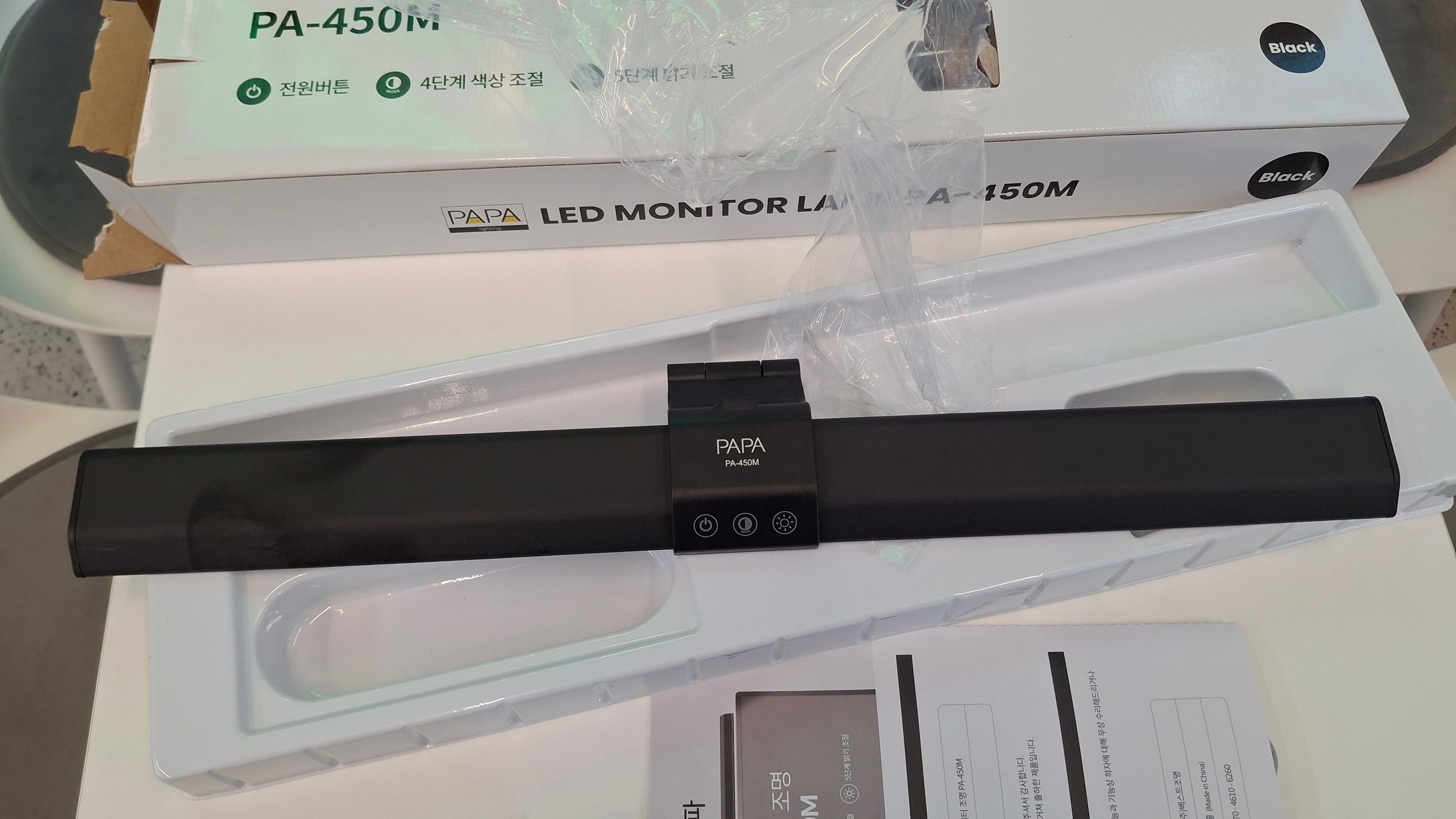 -450파파 LED 모니터 조명이다. 4단계 색상 조절과 5단계 밝기 조절이 된다. 전원은 USB 타입니다. 모니터 뒤에 꽂아 주면 된다.