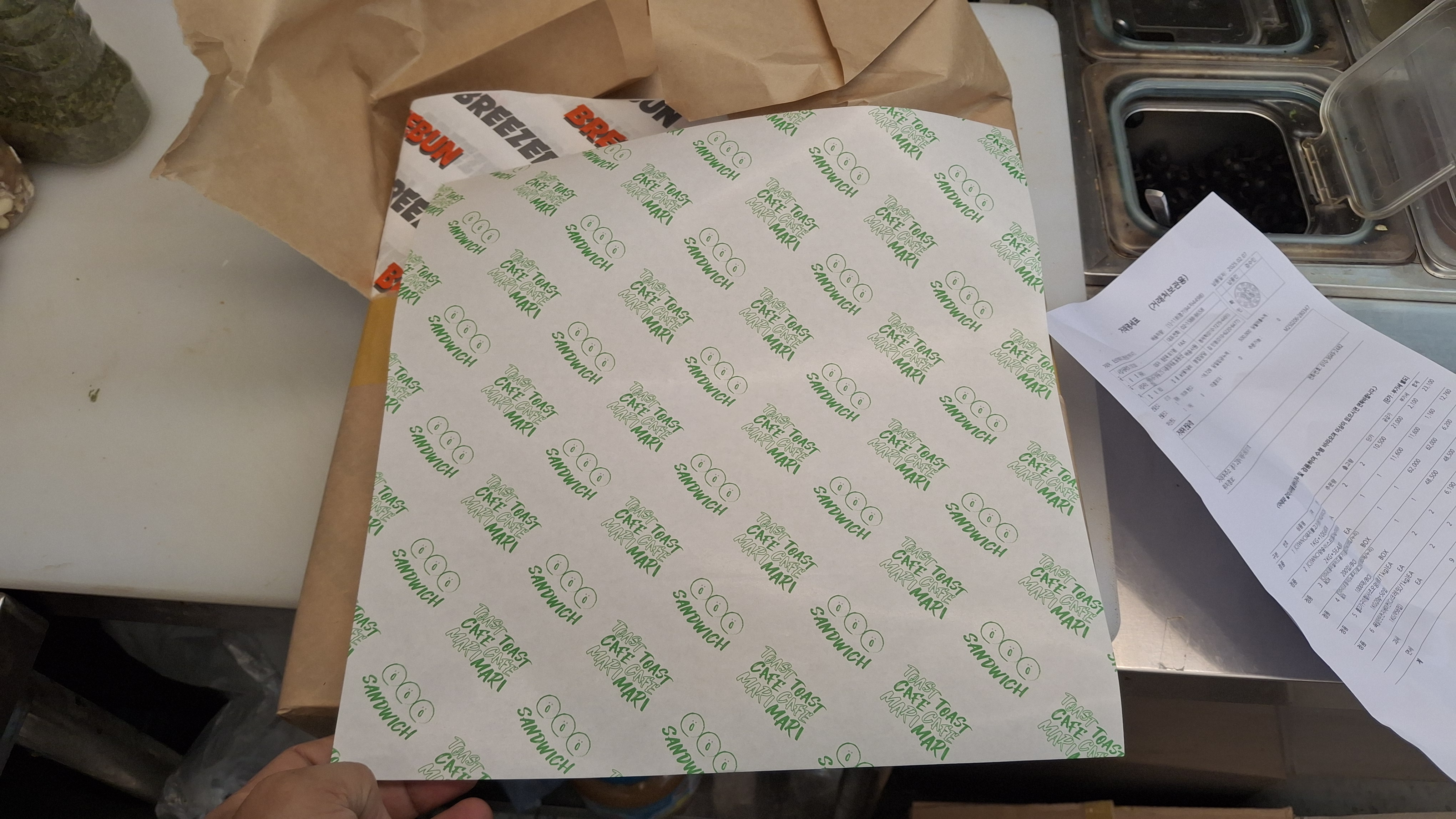 샌드위치를 싸는 노루지다. 마리는 초록색... 어제 주문해 오늘 새벽에 들어온 주문 물품들을 정리한다. 다른 주문 건은 잘 왔는데 샌드위치를 포장하는 노루지가 잘못 왔다. 우리 카페 것이 아닌 다를 브랜드 것(브리즈번??)이 왔다. 올해만 벌써 3번째 오배송이다. 오배송이 있는 날이면 하루 일진이 별로 좋지 않다. 마리 프랜차이즈는 동원홈푸드를 사용한다. 상담원에게 메신저로 오배송을 알리지 너무 죄송하다며 오후에 택배로 보내준다고 한다.
