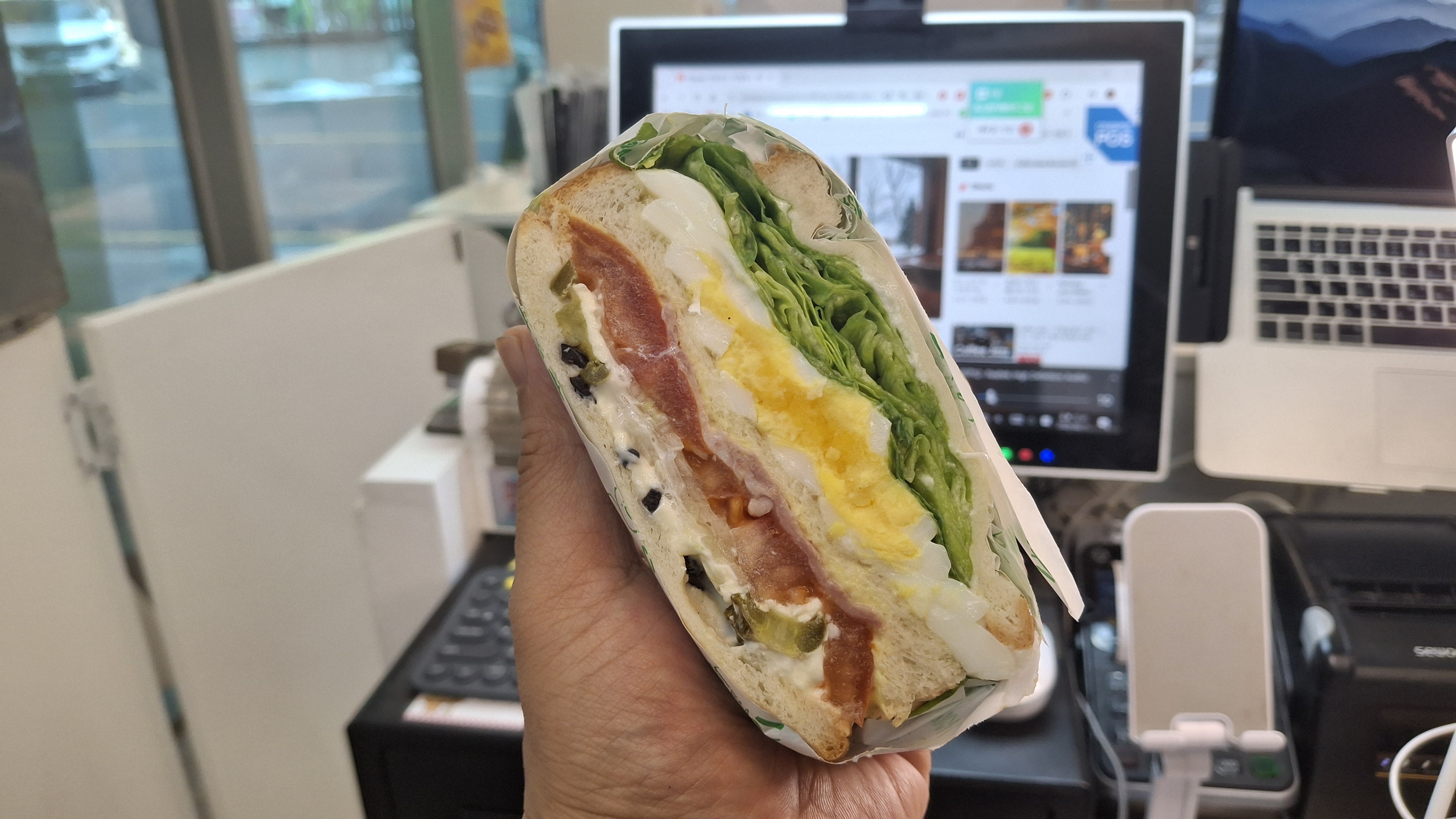 BLT 샌드위치. 샌드위치 중에서 가장 맛있고 많이 나가는 아이. 가끔식 오전 9시 넘어서 오는 남녀 손님이 계신다. 커피 2잔과 바질 치즈 토스트 콤보를 시키시는 분들이다. 회사에 다니는 분들은 아닌 것 같다. 옷을 편하게 입고 오시는 걸 보면 부부인지 연인인지 회사 동료인지 알 수는 없다. 항상 예의 바르시고 깔끔하게 드시고 조용히 이야기 나누다 가는 는 분들이다. 커피머신 밑 냉장고 문을 여니 어제 오더를 잘 못 보고 만든 BLT 샌드위치가 있다. BLT는 베이컨, 양상추, 토마토 가 들어가는 가장 기본적이면서도 맛이 보장되는 샌드위치다. 오전 10시 넘어서자 출출해서 반쪽을 먹었는데 커피와 함께 하니 맛이 훌륭하다. 내가 만들었어도 맛있게 먹었다. 남은 반쪽은 오후에 먹을 예정이다.