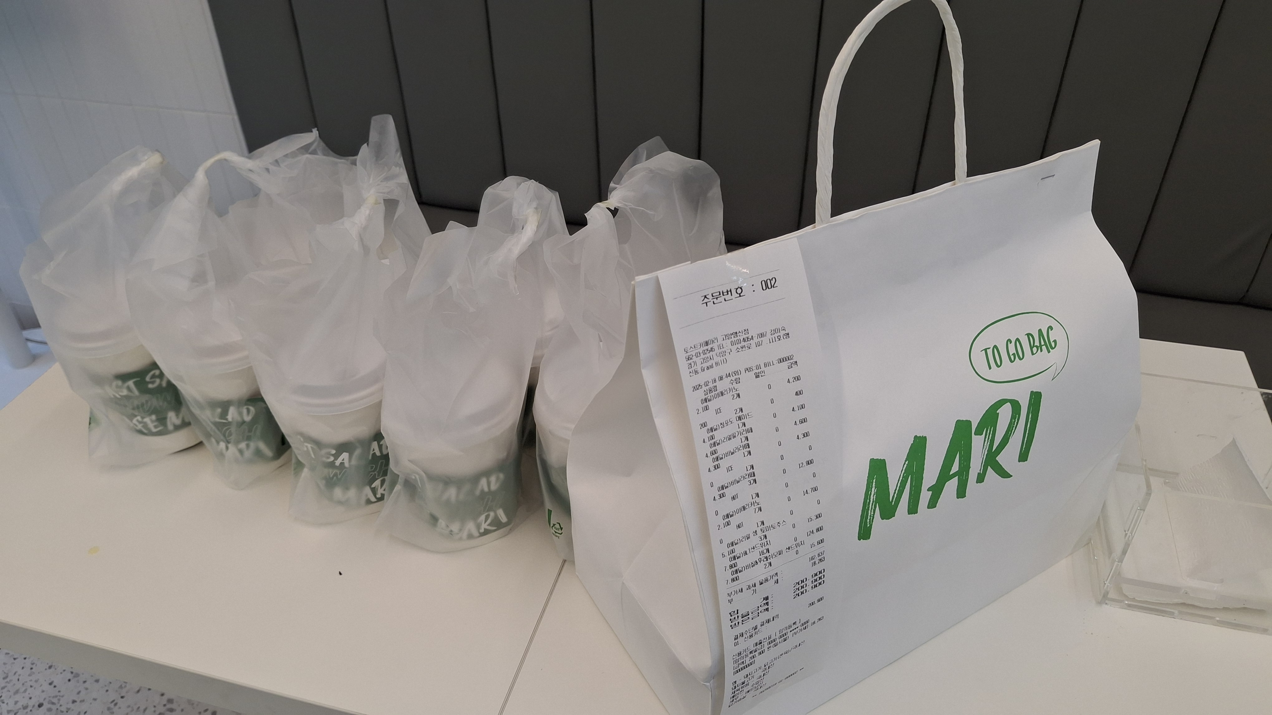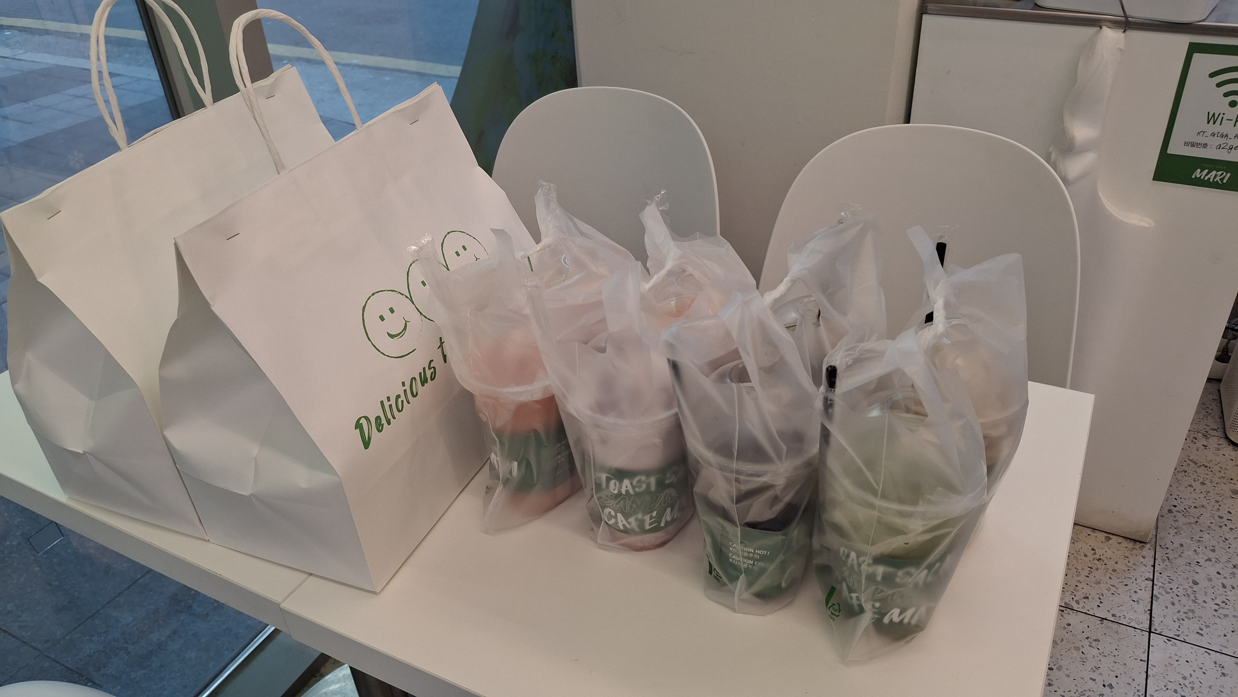 따뜻한 음료와 샌드위치지. 음료는 배달중 흘르지 않게 모두 실링 포장을 한다. BLT 샌드위치 16개 와 바질 샌드위치 2개 그리고 음료 커피포함 토마토주스, 에이드등 총 18잔이다. 코끼리 유치원 주문 건인데 항상 샌드위치와 음료를 함께 시킨다. 직접 보지는 못했지만 나중에는 인사를 하러 직접 배달을 해볼까 한다. 샌드위치를 거의 다 만들었을 무렵 손님이 들어온다. 보아하니 처음 온 손님이다. 키오스크가 문 옆에 있다는 것을 모른 채 카운터로 주문하려다 안내 문구를 보고 키오스트로 향한다. 메뉴 몇 개를 주문하고 시간이 얼마나 걸리냐고 물어본다. " 밀박스 2개 토스트 콤보 2개면 15분 정도 걸립니다. " 하니 급하다는 이야기를 한다. 그러면 만들어져 있는 샌드위치는 어떠냐고 하니 그게 좋겠다 하면서 5개만 달라고 한다. 잽싸게 포장을 해서 주고 나서 다시 샌드위치 5개를 만들기 시작했다(오늘 매출이 기대된다).
