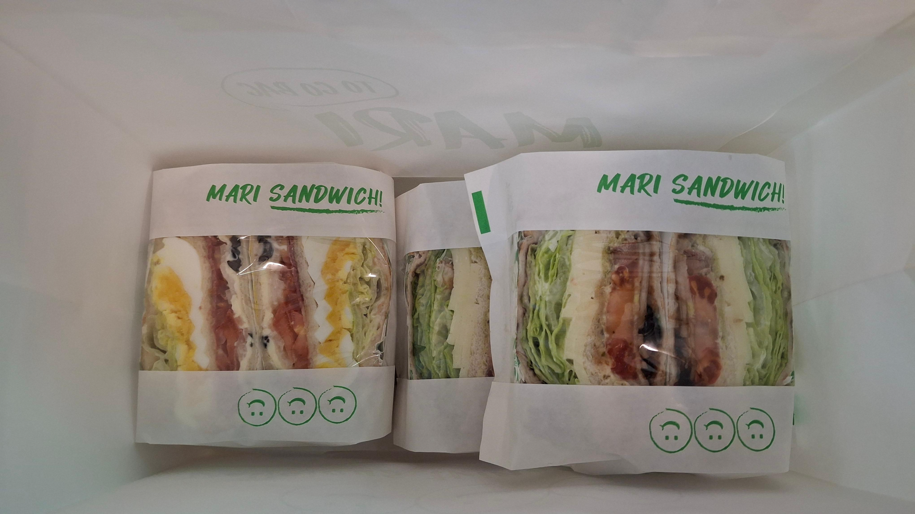 마리 샌드위치는 창 포장지에 포장을 한다. 왼쪽이 BLT 샌드위치. 오른쪽이 바질 후레쉬 모짜 샌드위치다.