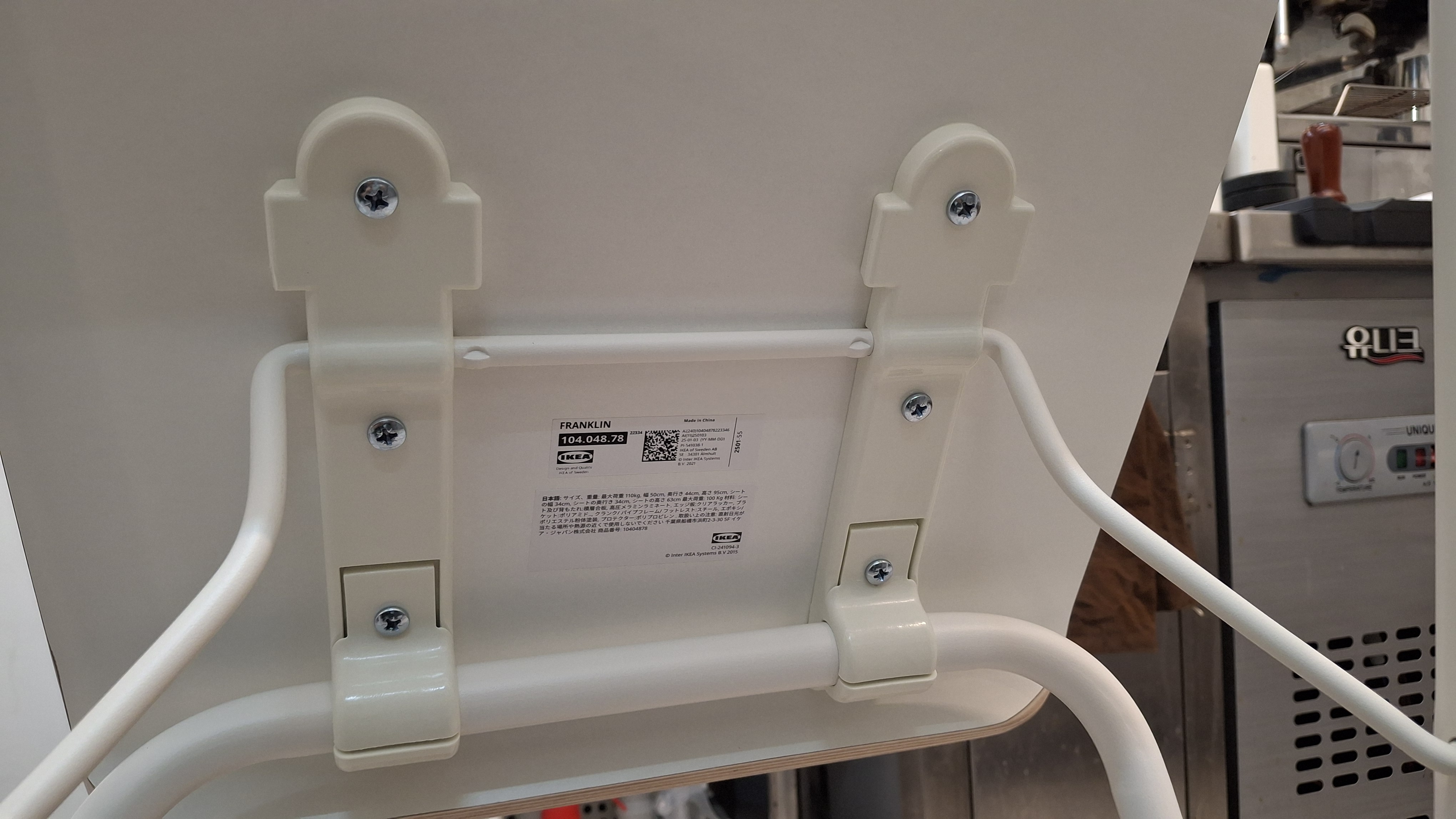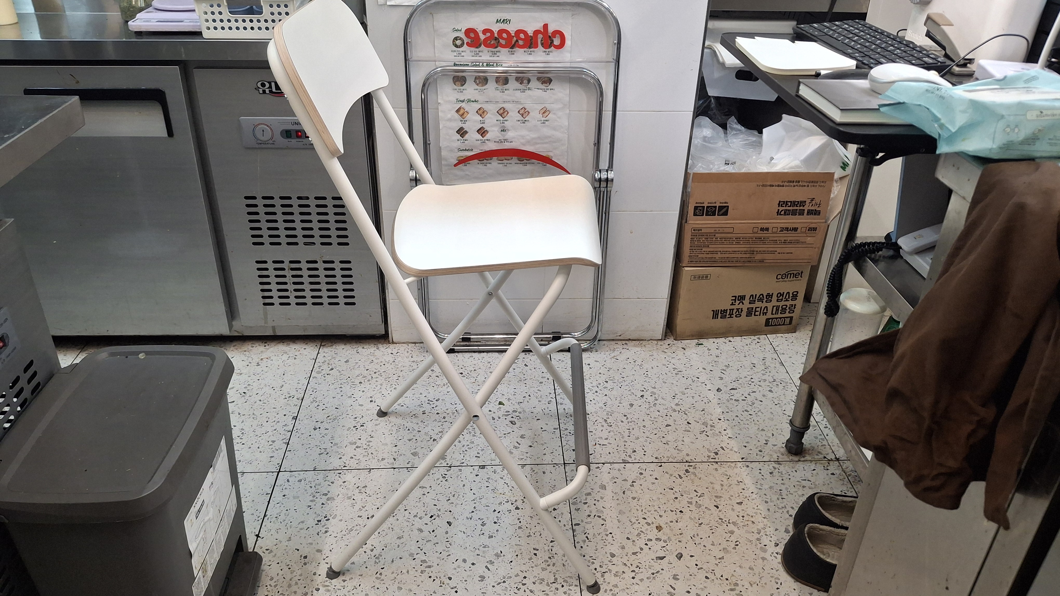 높이 63cm, 플라스틱 다리받침이 있어 언정적이며 부드럽고 바닥에 자국을 남기지 않는다. 카운터 앞에 프랑클린을 두고 앉아보았다. 온라인에서 본 것 보다는 의자 앉는 부분이 상당히 넓었다. 허리 받침도 편안하고 무엇보다도 의자 높이가 63cm로 앉았을 때 편안한 느낌을 주었다. 내 키가 175인데 높지도 낮지도 않았다. 이제는 손님을 맞이하기 전에 좀 더 편안한 자세로 앉아 있다가 손님을 만날 수 있게 되었다. 색상은 화이트와 블랙이 있는데 나는 화이트로 골랐다. 또 하나의 장점은 접어서 부피를 줄일 수 있다는 것이다.