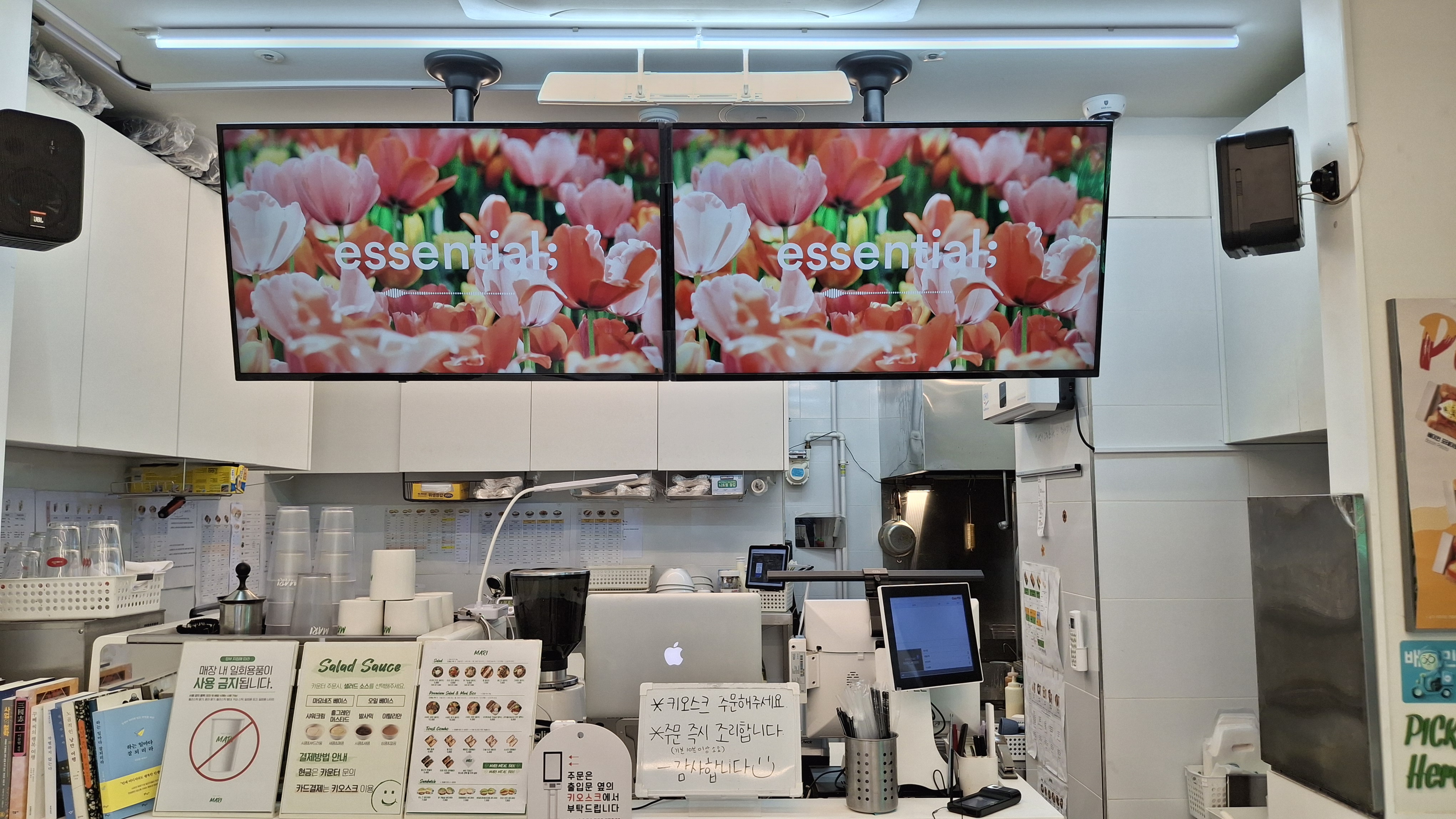 외부입력 버튼으로 본사에서 보내주는 HDMI 1 과 내 맥북에서 보내는 출력을 보여주는 HDMI 3 번갈아 가며 화면을 변경시킬 수 있다. 오늘 키오스크 옆에 있는 삼성 32인치 스마트 모니터와 천장에 달려있는 모니터 2대를 같은 화면으로 출력해서 매장 분위기를 화사하게 봄 내음 물씬 나는 음악과 영상으로 꾸며 보았다. 트렌드 있는 매장의 모니터 화면은 에센셜이 국룰 아니더냐? ㅋ