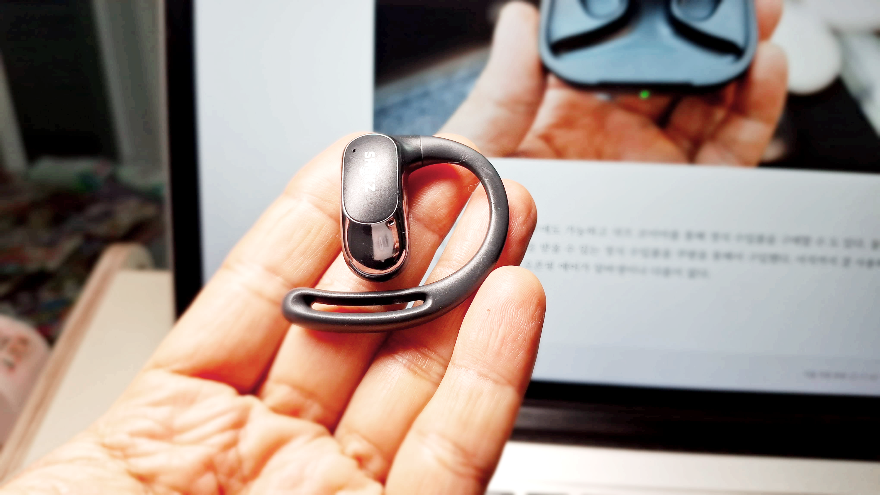 샥즈 오픈핏 에어는 작년 8월 중 구매했는데 지금까지도 너무 잘 쓰고 있다. 일단 무게가 8.7g으로 무척 가볍다. 착용감도 편해서 귀에 장시간 끼고 있어도 걸리적 거림이 없다. 집에서 잠자기 전 이어폰을 사용하다가 착용하고 잠이 든 적은 한두 번이 아니다. 통화 수화음도 훌륭하다. 이어폰을 끼고 있어도 상대방이 말하는 것을 잘 들을 수 있다는 것도 장점이다. 매장에서 일할 땐 노이즈캔슬링 기능은 필요가 없다.