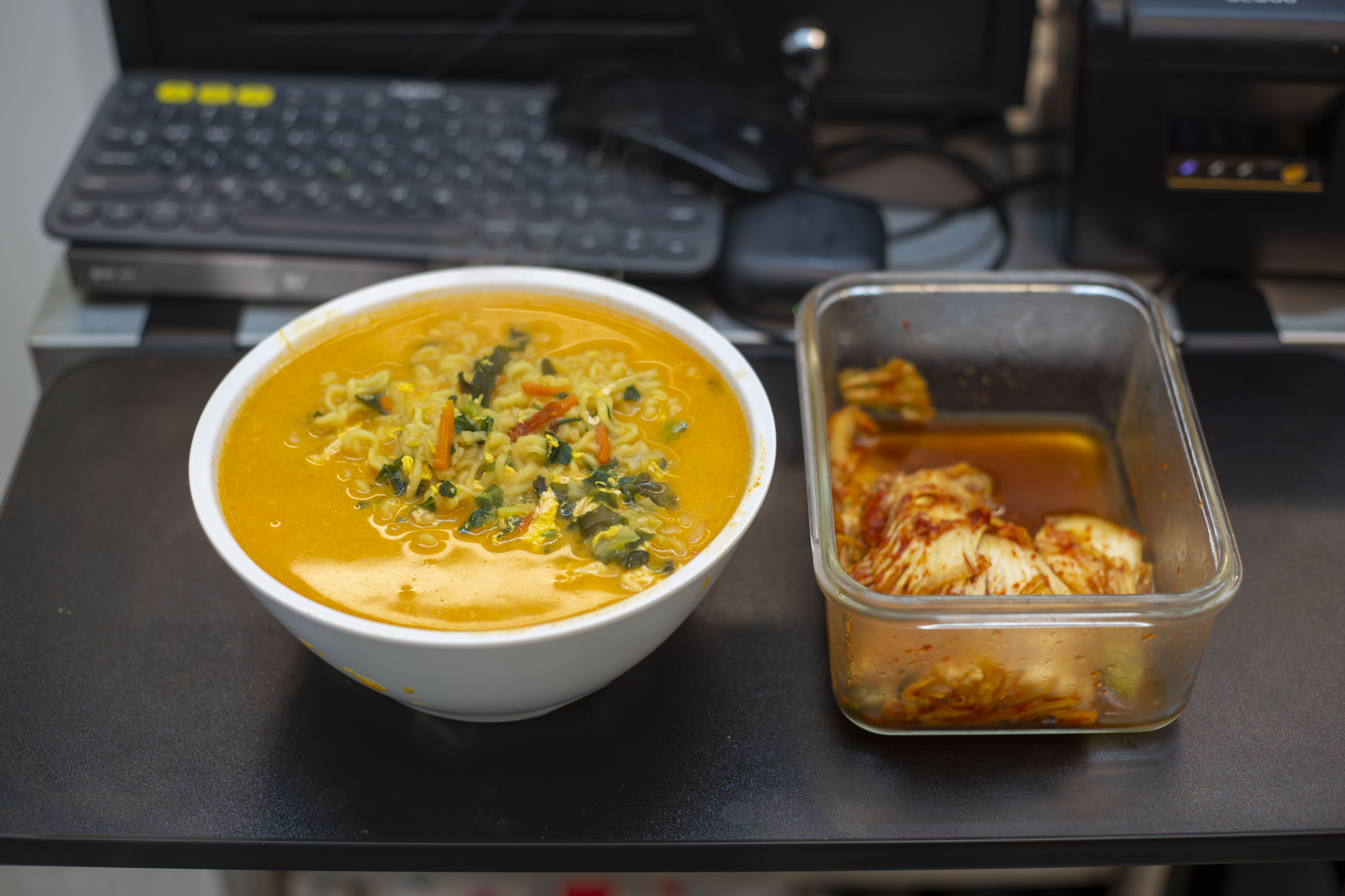 노브랜드에서 구매한 팔도 해물라면.. 맛이 나쁘지 않다. 아내표. 겉절이 2시가 넘어서 점심을 먹었다. 오늘은 라면 2 봉지. 라면이 몸에 좋지도 않지만 혼자 있으면 이것저것 해서 차려 먹기도 그렇고 매장 메뉴를 먹기도 이젠 마땅치 않다. 노브랜드에서 사 온 팔도 해물라면이 3개 있어서 2개를 끊였다. 장사하면 좋은 점이 샌 화구에서 라면을 금방 끓여 먹는다는 것이다. ㅋ.
