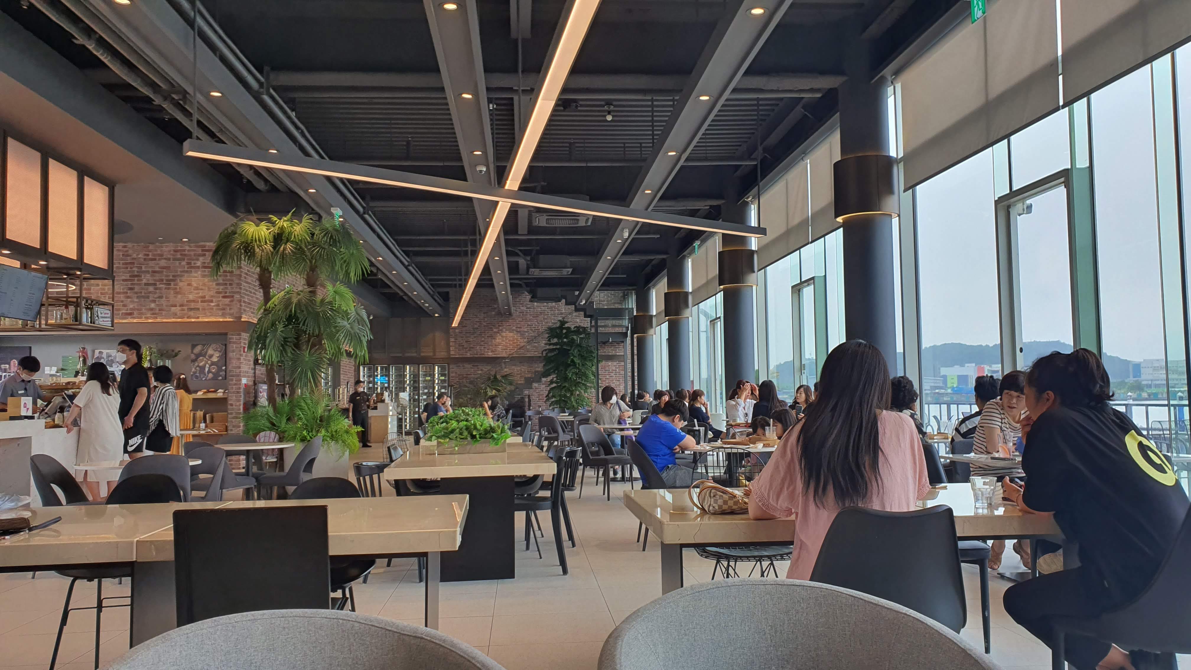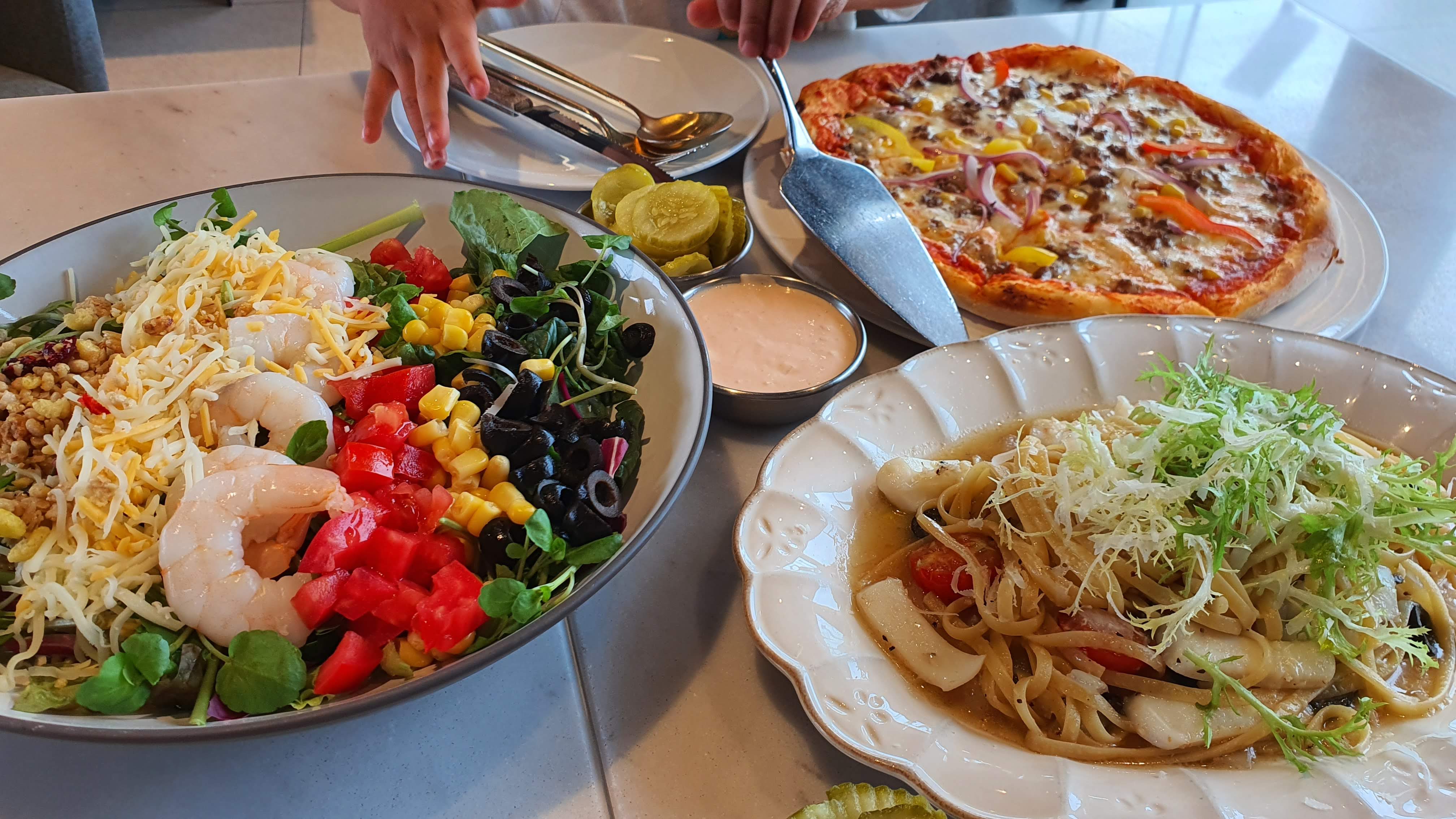 런치메뉴와 베이커리 카페는 셀프 서비스로 운영 됨. 오늘은 콤비네이션 피자와 쉬림프 샐러드, 알리오 올리오 파스타를 시켰다. 가격은 4만 5천 원. 음료 1개와 하이네켄 드래프트 맥주 1잔을 같이 시켰다. 음료 가격은 1만 3천 원이다. 가격은 조금 비싸다고 할 수 있지만 맛과 양도 부족하지 않고 분위기도 좋아서 개인적으로는 가성비가 나쁘지 않다고 생각한다. (아무튼 런치식사는 나왔다는 진동벨이 울리면 바테이블에 가서 직접 가져와야 된다) 사람들이 몰려서 주문을 했는데도 음식이 나오는 시간은 그렇게 오래 걸리지 않았다. 음식을 직접 가져와야 한다는 것이 조금 기분이 상했지만 그렇게 나쁘지도 않았다. 포크 나이프와 오이피클, 물, 냅킨, 물티슈 모두 셀프이니 참고하시길 바란다(런치 시간에만 셀프서비스다).