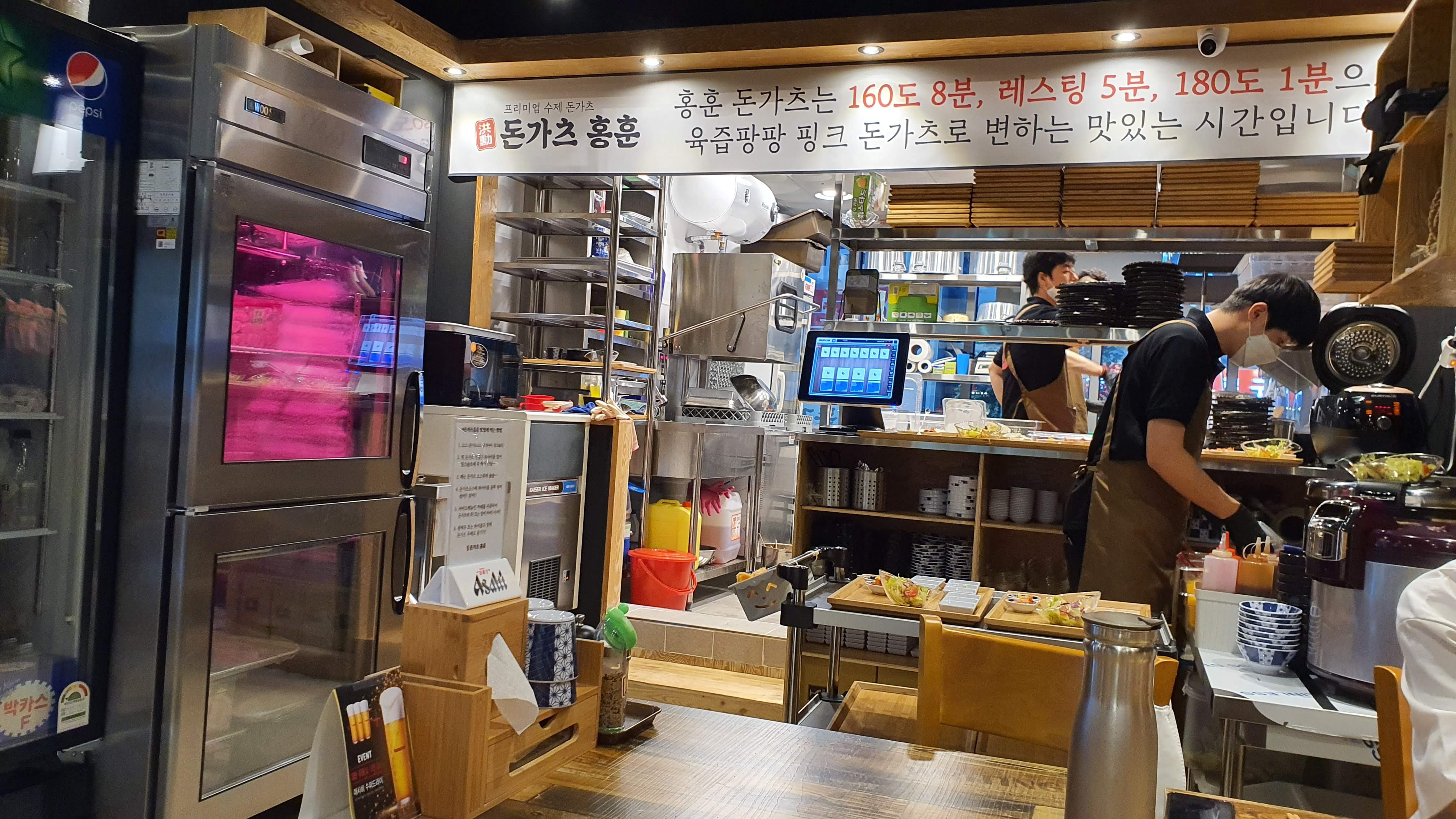 2층으로 올라겨면 정문이 나온다. 영업시간은 오전 11시부터 저녁 9시까지 당분간 매주 수요일 정기 휴무일. '돈가츠 홍훈' 처음 들어본 돈가스 전문점이다. 검색을 해보아도 그 어디에도 찾아볼 수 없다. 처음 사업을 시작하셨다면 정말 잘 되시기를 기원해본다. CGV 빌딩 2층에는 투썸플레이스가 있고 '돈가츠 홍훈'만 오픈이 되었다. 이전에도 한창 공사를 하더니 8월 초에 오픈을 했다. 백종원의 골목식당 초대박 맛집으로 거듭난 포방터 돈가스 집인 '연돈'과 같은 일본식 돈가스 전문점이다. 집 근처에도 돈가스 맛집 있기를 기대해보면서 들어갔다. 평일 금요일 저녁시간이었는데 테이블에 4팀 정도가 있었다.