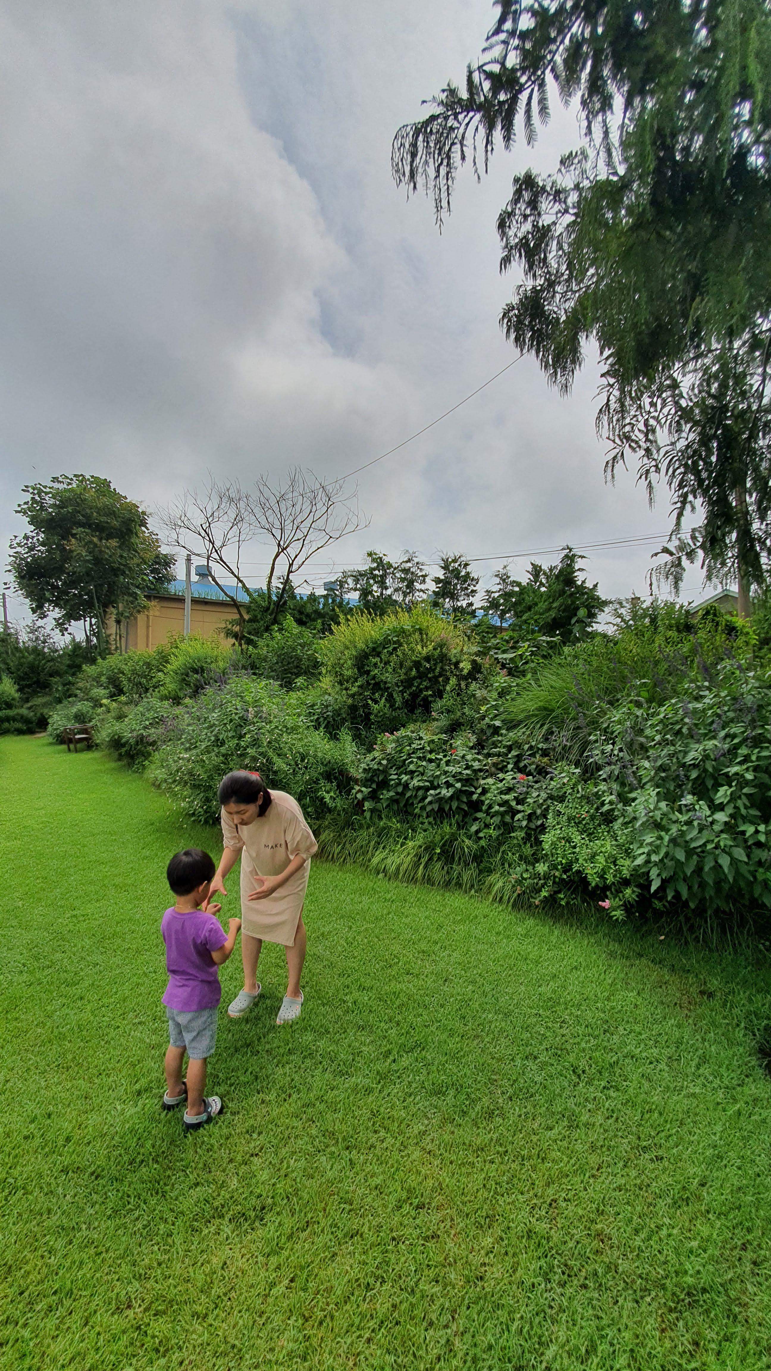 카페 내부 커피를 시키기는 했지만 처음부터 이곳은 정원에 더 관심이 마음이 갔었다. 테이블에는 식사를 하는 젊은 부부와 중년부부 테이블과 여고 동생창 있듯한 분들 중년의 친구분들 또한 우리와 같은 부모님을 모시고 온 가족분들들처럼 다양한 연령대의 사람들이 있었다. 테이블의 공간구조와 인테리어는 개인적으로 뭔가 20% 정도 부족한 느낌이었다. 텅 빈 공간을 채우기가 만만치 않았으리라 생각된다. 라떼 세잔과 하늘이를 위한 아이스크림 한 개를 시켰는데 이만 구천 원 이 나왔다떼(커피값은 사실 좀 비싸다. 정원 입장료가 포함이 된것 같다ㅎㅎ). 사실 커피가 나오기 전부터 정원을 둘러보기 바빴다. 다행히 비가 그쳐 하늘이는 정원을 뛰어놀 수 있었다. 잘 가꾸어진 잔디를 밟기가 미안할 정도였다. 넓은 잔디밭 주변으로 테이블이 놓여 있었고 예전 정미소의 후문 쪽에는 아름드리 메타쉐콰이어 나무가 서있어 한적한 시골 길가를 연상케 해주었다. 그 뒤로 장항선이 있어 군산역에서 대야역으로 가는 기차가 지나다녔다. 하늘이는 기차가 지나갈때마나 카페 후문에 있는 철문에서 기차 보는 재미에 푹 빠져 눈을 떼지 못했다. 아내와 이곳저곳을 산책하며 한여름 정원에 핀 꽃들을 만끽할 수 있었다. 수국이 탐스럽게 피어올랐고 석류나무에는 석류가 주렁주렁 열였다. 너무도 이쁘고 다양한 꽃들이 탐스럽게 핀 정원은 보는 이도 마음이 부자가 된 것 같은 느낌이었다. 비가 그치니 어느새 잠자리들이 날아다니고 꿀벌들이 이 꽃 저 꽃을 옮겨 다니며 열심히 일을 하고 있다.