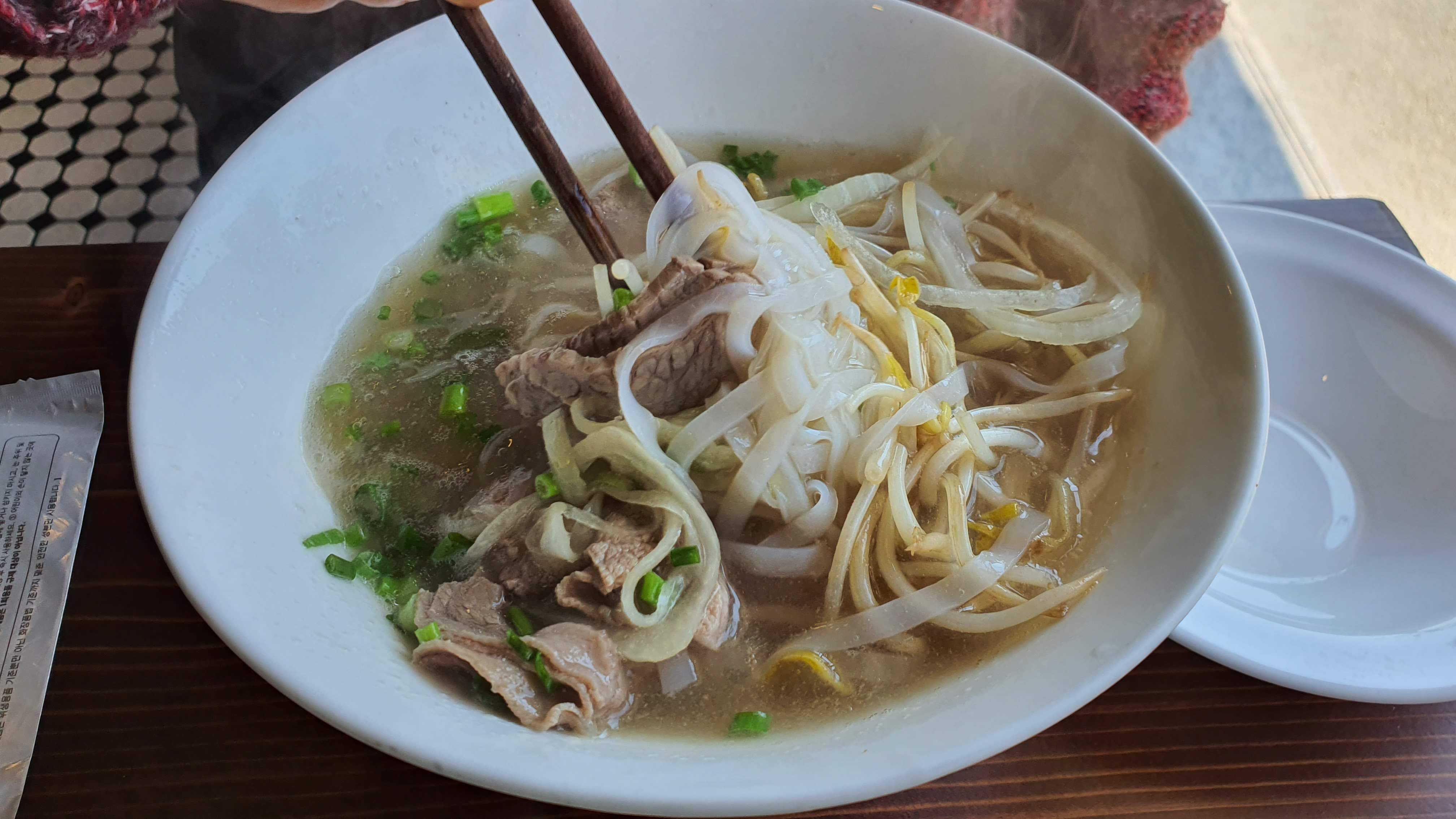 반미띳 7,000원. 사이공 맥주는 처음 먹어 보는데 맛이 나쁘지 않았다. 이제는 나이가 들어서인지 식사를 할 때 반주를 하게 된다. 더운 여름이라 시원한 맥주 한 모금은 사막에서 오아시스를 만난 것 같은 기쁨을 나에게 안겨준다. 30대까지만 하더라도 반주는 상상조차 하지 않았었는데 나이를 먹다 보니 술의 참 맛을 알아가는 것 같아 나쁘지 않다. 처음 술을 마셨을 때는 술 냄새만 맡아도 취했었던 나였는데 세월의 무상함을 느껴본다. 사이공 맥주 한 모금 짜조 한 입. 음... 너무 맛있다. 튀김요리가 맛이 없을 수 있겠느냐마는 맥주와 궁합이 아주 잘 맡는다. 하늘이도 이제는 컸다고 음식의 양이 많아졌다. 예전에는 쌀국수 하나 시켜서 하늘이와 와이프가 함께 먹어도 충분했었는데 이제는 하늘이가 먹는 양이 있어 한 그릇으로 나눠먹기에는 부족함을 느끼는 아내다. 면만 추가가 되냐고 물으니 안된다는 단호한 답변이 돌아왔다. ㅎㅎ.