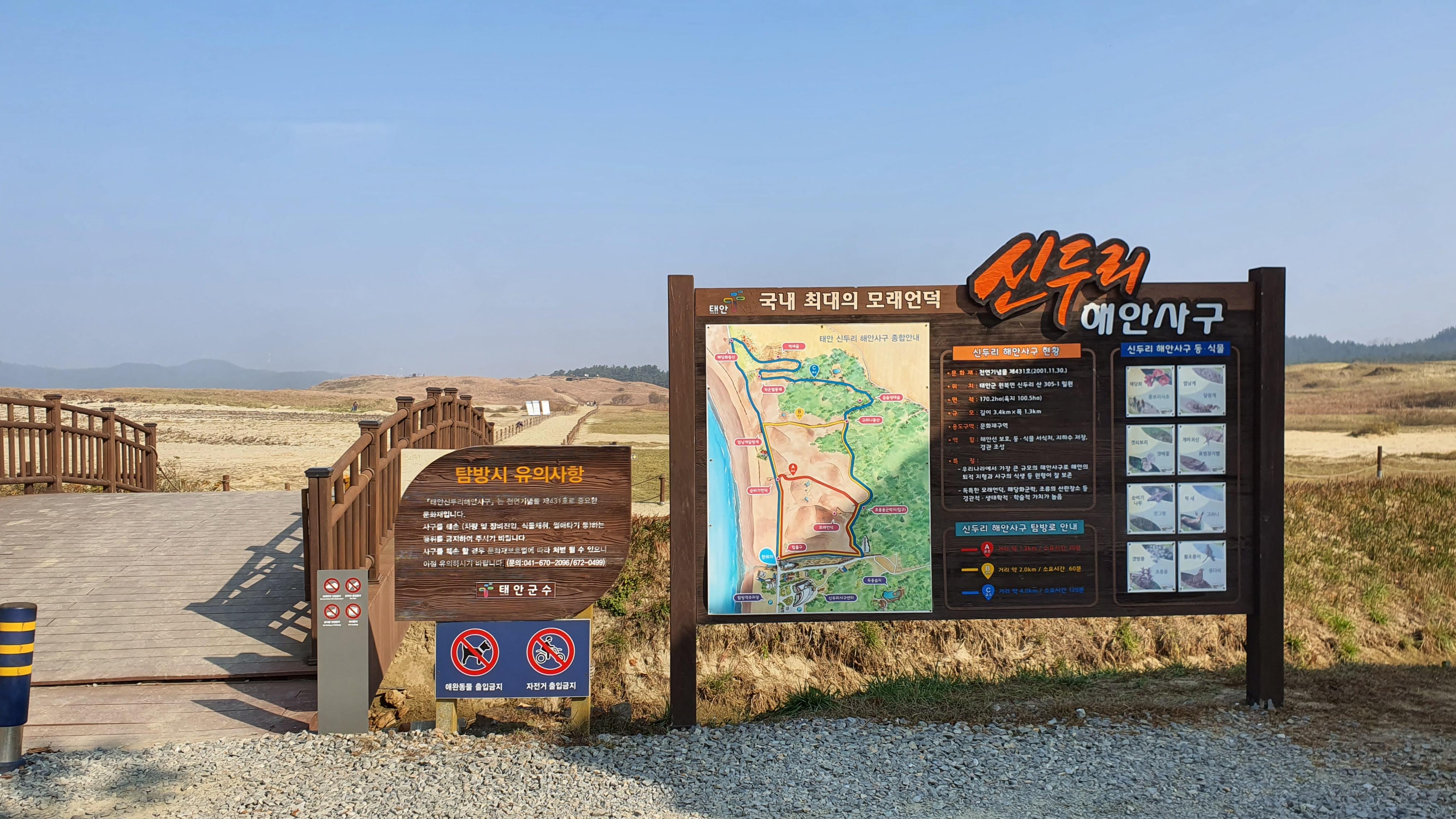 정말 아름다운 이곳. 2001년 이 되어서야 천연기념물로 보존이 되었다는 것이 못내 아쉽다. 우리나라는 좀 좋은 곳은 펜션이다 음식점이다 상업시설이 들어서있어 눈살이 찌푸려 지는 곳이 너무 많은것이 사실이다. 우리 가족이 태안여행을 계획하면서 마지막 여행지로 선택한 곳은 '신두리 해안사구'였다. 와이프가 태안 검색을 하다가 우리나라에 사구가 있어? 하면서 보았던 곳이 '신두리 해안사구'다. 우리나라 모래언덕이 있어봤자 뭐! 별거 있겠어하고 찾아갔던 곳이 이 곳이다.