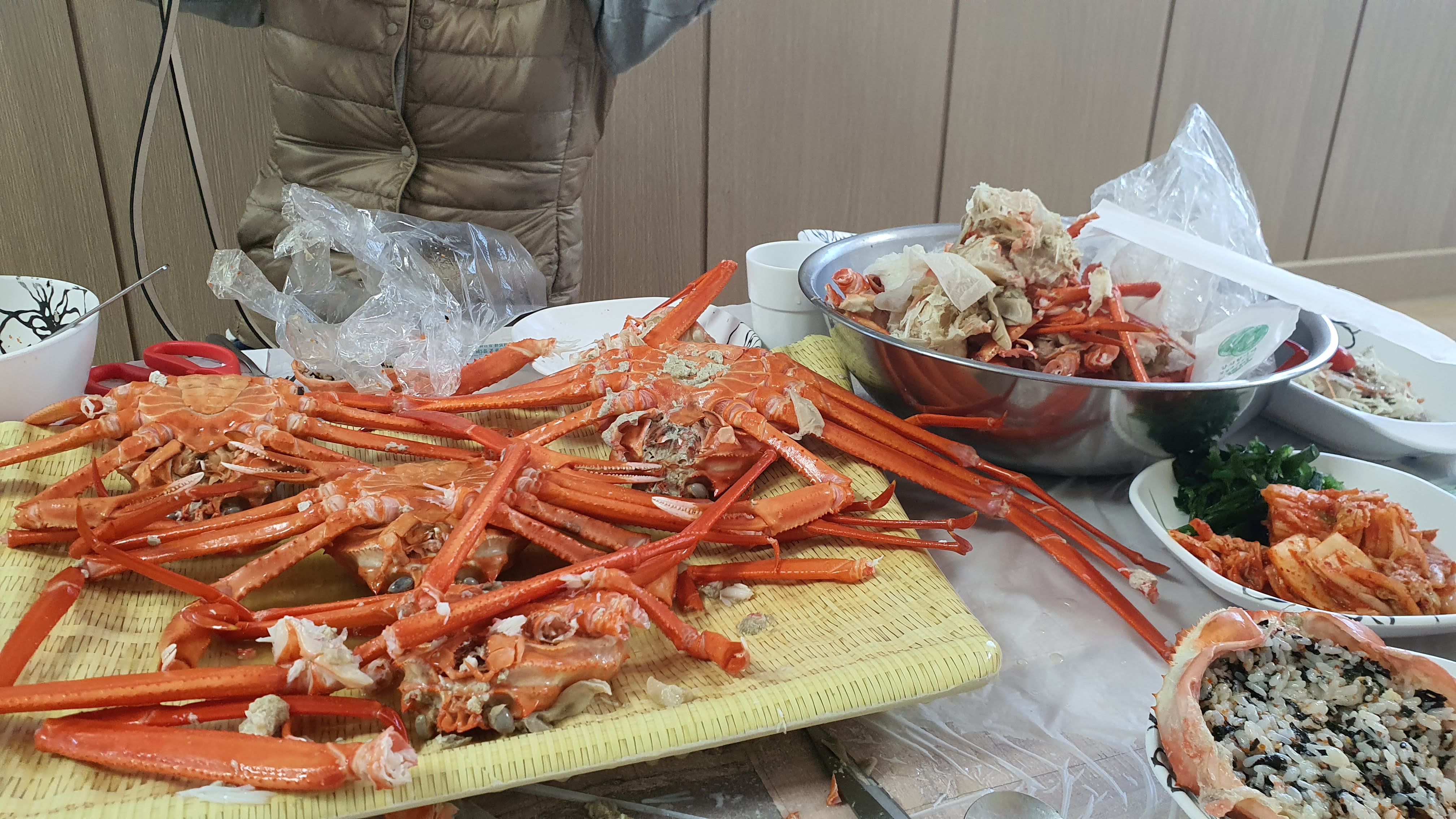 포장을 해가는 사람이 많나보다. ㅜㅜ 게딱지밥과 게라면도 일품이다. 우리가 찾아간 날이 화요일로 평일이라서 그런지 사람들이 많지는 않았지만 그런데로 홍게를 무한리필로 먹고 싶은 마음에 찾아온 분들이 꽤 있었다. 일단 홍게를 무한리필로 먹으려면 성인은 1인당 35,000원이다. 2인 갔을 때도 7만 원, 4인 가족이 가면 14만 원이다. 일단 가격은 착하다. 우리 가족은 아이가 있어 좌식 테이블로 안내를 받아 들어가는데 옆 옆 테이블에서 커플이 수북이 쌓아놓은 게딱지며 게껍질이 수북이 쌓여 있었고 계속 너무도 맛있게 먹는 표정에 마음이 일단 놓였다. 대게 집에서 흔히 볼 수 있는 스끼다시는 많이 없다. 김치와 샐러드 등 기본적인 것들이 나오고 밑반찬으로 마음껏 갖다 먹을 수 있게 셀프 스테이션이 마련되어 있다.
