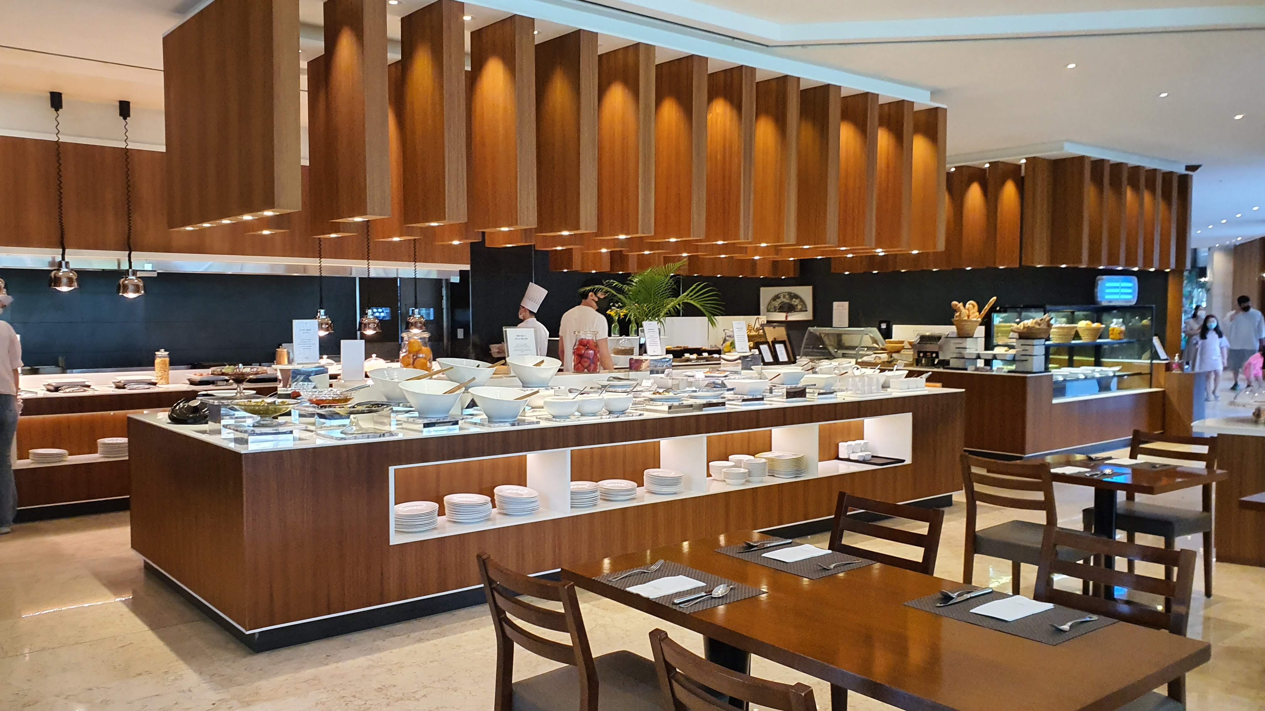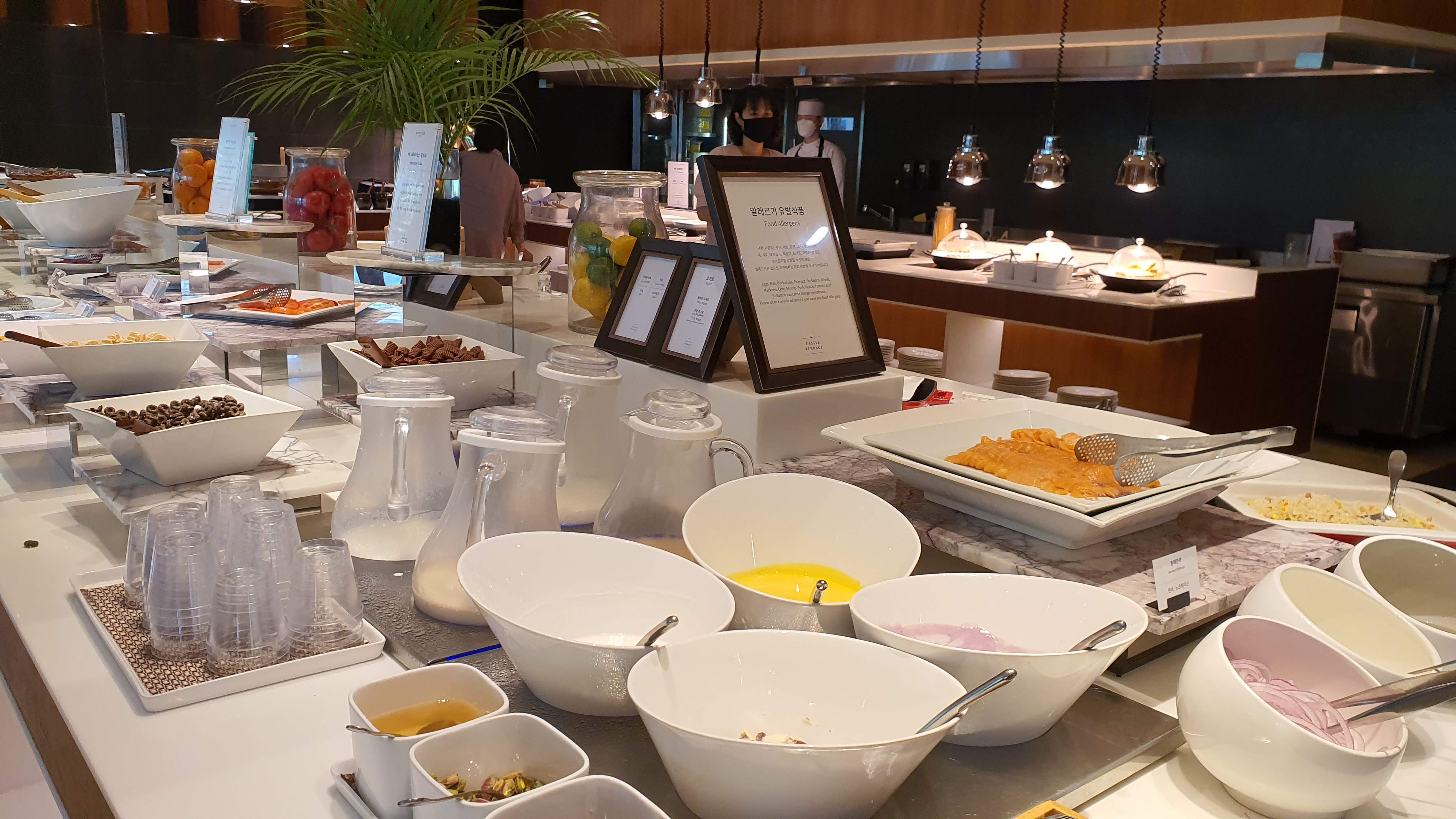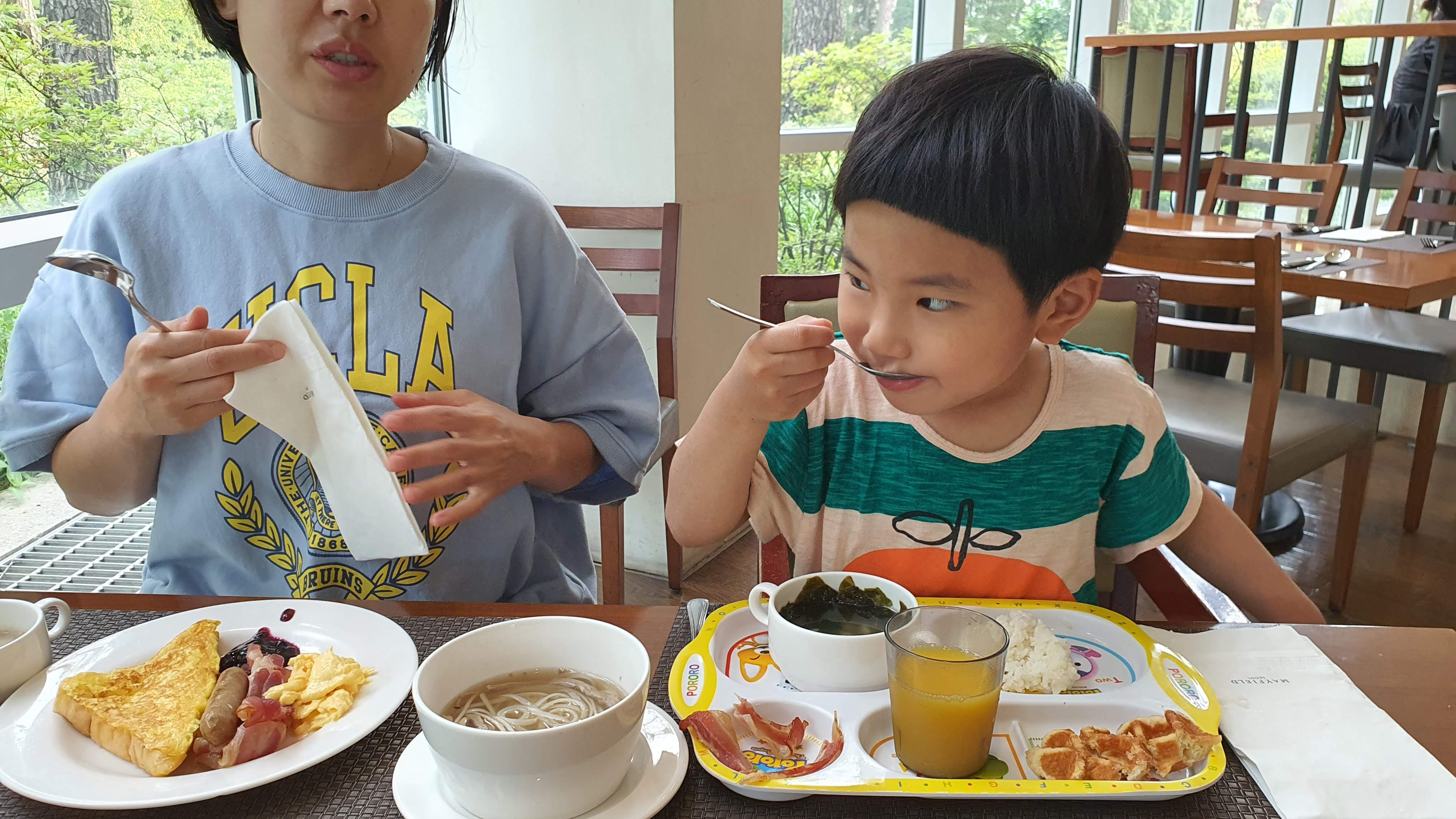 다음날 아침 5시부터 눈을 뜬 나는 아침 8시가 되기를 손꼽아 기다리고 있었다. 호캉스의 꽃은 내가 생각하기엔 호텔 조식이 아닌가 싶다. 저녁 뷔페처럼 무거운 음식이 아닌 그래도 꽤 잘 차려진 아침 뷔페에는 내가 먹기에 맛있는 음식들이 많이 있다. 그래서 나는 호텔 아침 뷔페를 좋아한다. '아침을 저녁처럼 먹으라'는 격언이 생각나기도 하는 오늘이다. 와이프와 하늘이가 준비를 마치고 호텔 본관에 있는 캐슬 테라스로 향했다. 아직 8시밖에(?) 안돼서 인지 식당 안에는 사람들이 많지 않다. 월요일 아침이라는 것이 믿기질 않는다. 토요일 아침과도 같은 설렘이다. 메이필드 본관 앞 정원이 잘 보이는 창가에 자리를 앉았다. 몸이 먼저 반응을 한다. 임에 침이 고이기 시작한다. 하늘이 손을 잡고 주욱 들러보았는데 음식이 나쁘지 않다. 한식, 양식, 중식 코스로 다양하게 준비가 되어있고 샐러드바가 잘 갖추어져 있는 것이 돈보였다. 코로나로 인해 1회용 비닐장갑을 끼고 난 후에게 음식을 담을 수가 있었다(나름 철저하게 감시하고 있었다). 프렌치토스트에 스크램블과 케첩까지 처음은 아메리칸 블랙퍼스트로 시작한다. 그 이후 연어를 메인으로 내 위가 허락하는 한 마음껏 음식을 즐겼다. 하늘이도 오랜만에 호텔 조식을 먹어서 그런지 미역국에 밥을 말아 크로와상을 반찬(?) 삼아 할머니가 해주신 미역국처럼 맛있다면 잘 먹었다. 와이프도 칭찬을 잘하지 않은 성격인데 호텔 조식이 나름 괜찮다며 맛있는 음식을 열거하기도 했다.