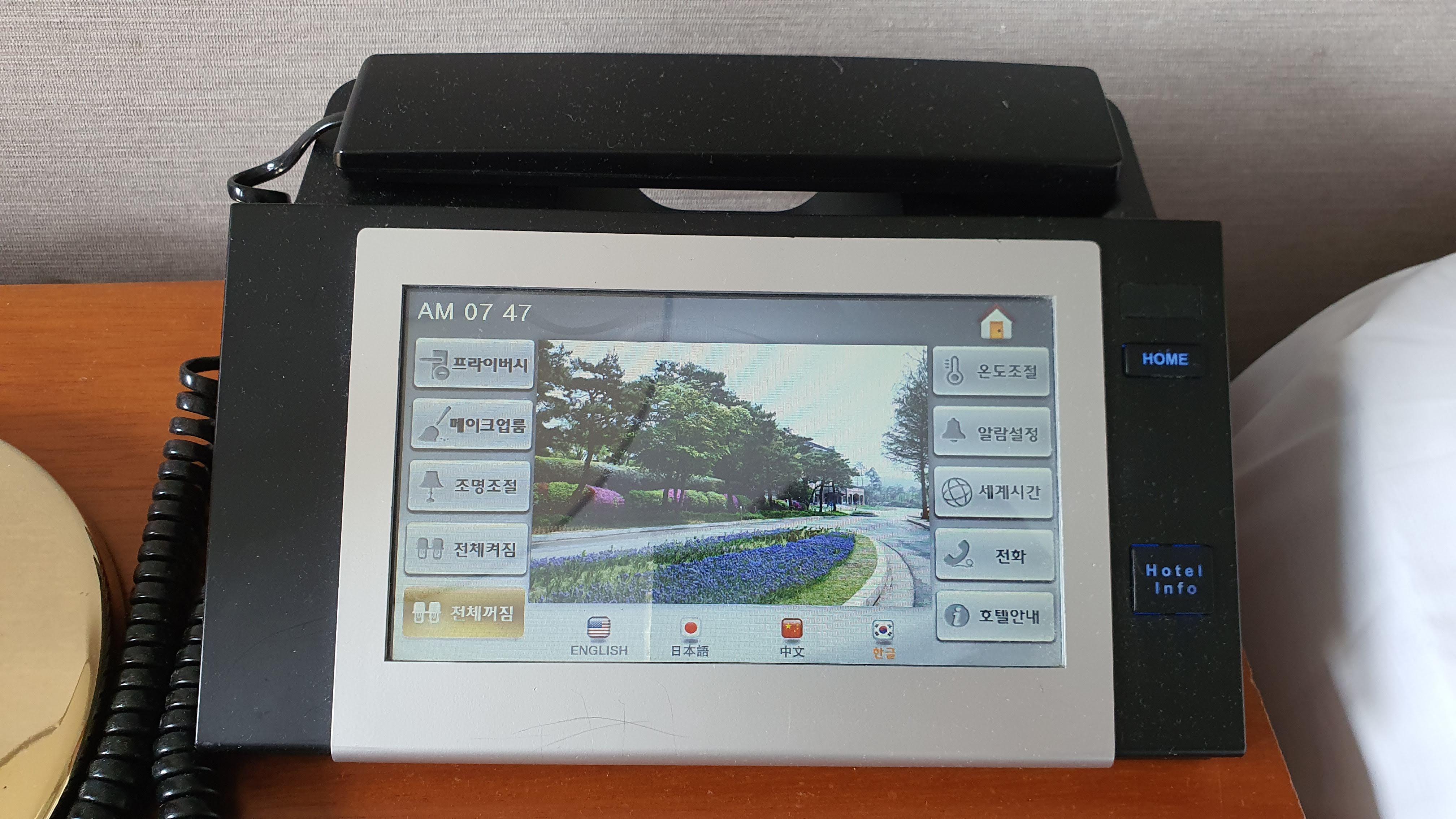 양 침대 사이 탁자에 놓은 중앙 컨트롤러?? LCD 모더터로 되어있더 티치 방식으로 침대에서 모든것을 할 수 있게 되어있다. 나름 편한 듯.