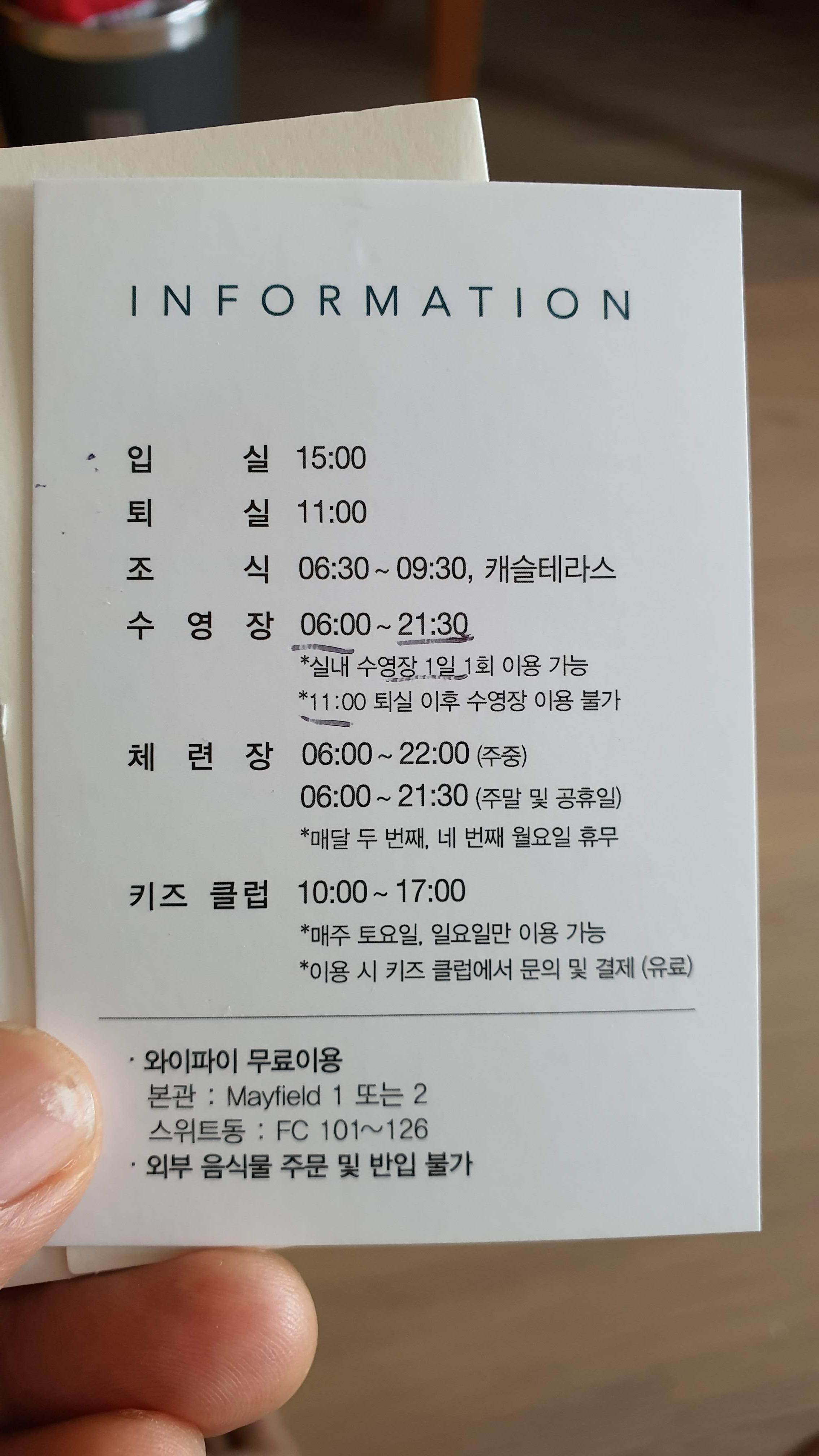 수영장은 1일 1회만 사용가능하다. 그래서 퇴실하는날도 한 번 더 이용할 수 있는데 오전 11시까지만 이용이 가능하다. 배정을 받은 객실은 321호. 슈페리어 트윈룸이다. 더블침대 1개. 싱글 침대 1개가 있는 전형적인 호텔 객실이다. 오픈한 지 약 20년이 되는 호텔이라 그런지 객실의 가구나 인테리어 소품들은 세월의 흔적을 안고 있었다. 하지만 나쁘지 않은 오래됨이다. 일단 하루에 1번밖에 이용 못하는 수영장을 가기 위해 호텔 본관을 나섰다. 수영장은 메이필드 스위트와 피트니스 클럽이 있는 건물 1층에 위치하고 있다. 코로나로 인해 엄격한 출입통제가 이루어졌으며 다른 곳과는 달리 수영장을 이용하는 모든 사람들이 수영모를 꼭 써야 하는 것이 다소(?) 불편했다. 야외 수영장(7월과 8월에 한시적으로 운영하는 야외풀이 있긴 하다)이 없는 실내 수영장이라 캡이나 서핑용 모자는 착용이 안되었다. 수영장은 4개 정도의 레인이 있는 메인풀과 유아용 풀과 그 중간 정도 높이의 풀 총 3개가 있다. 수영장은 촬영이 금지되어 사진이 없다. 오후 늦게부터는 평일에도 사람들이 많아서 유아용 풀은 만원사례였다.