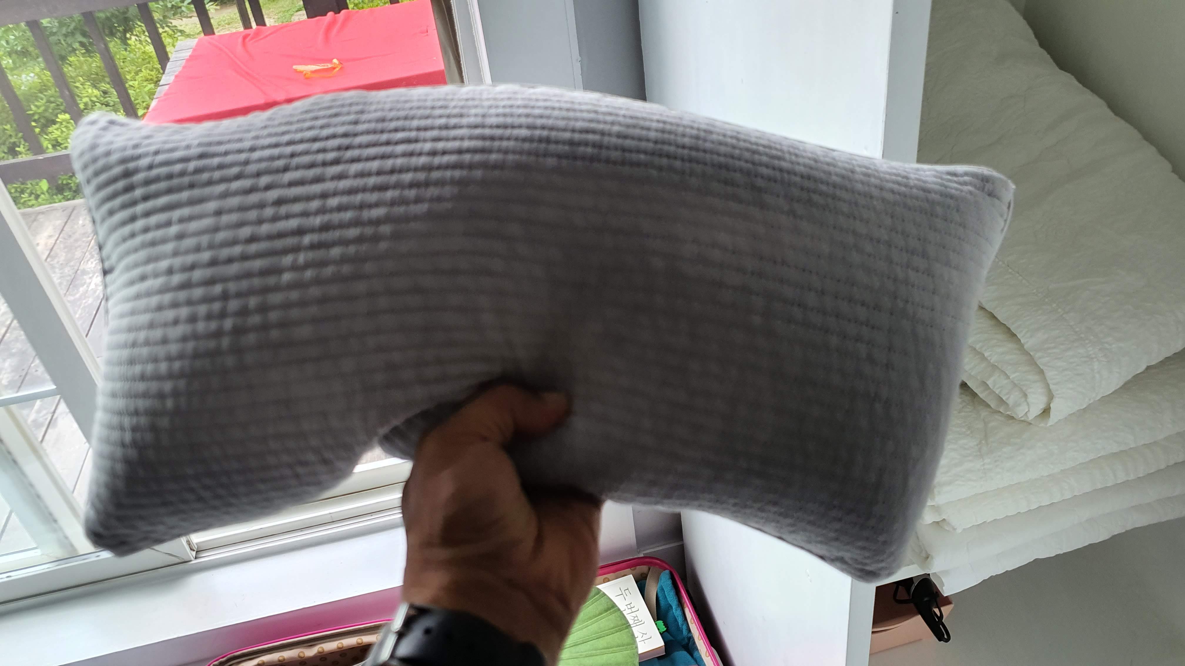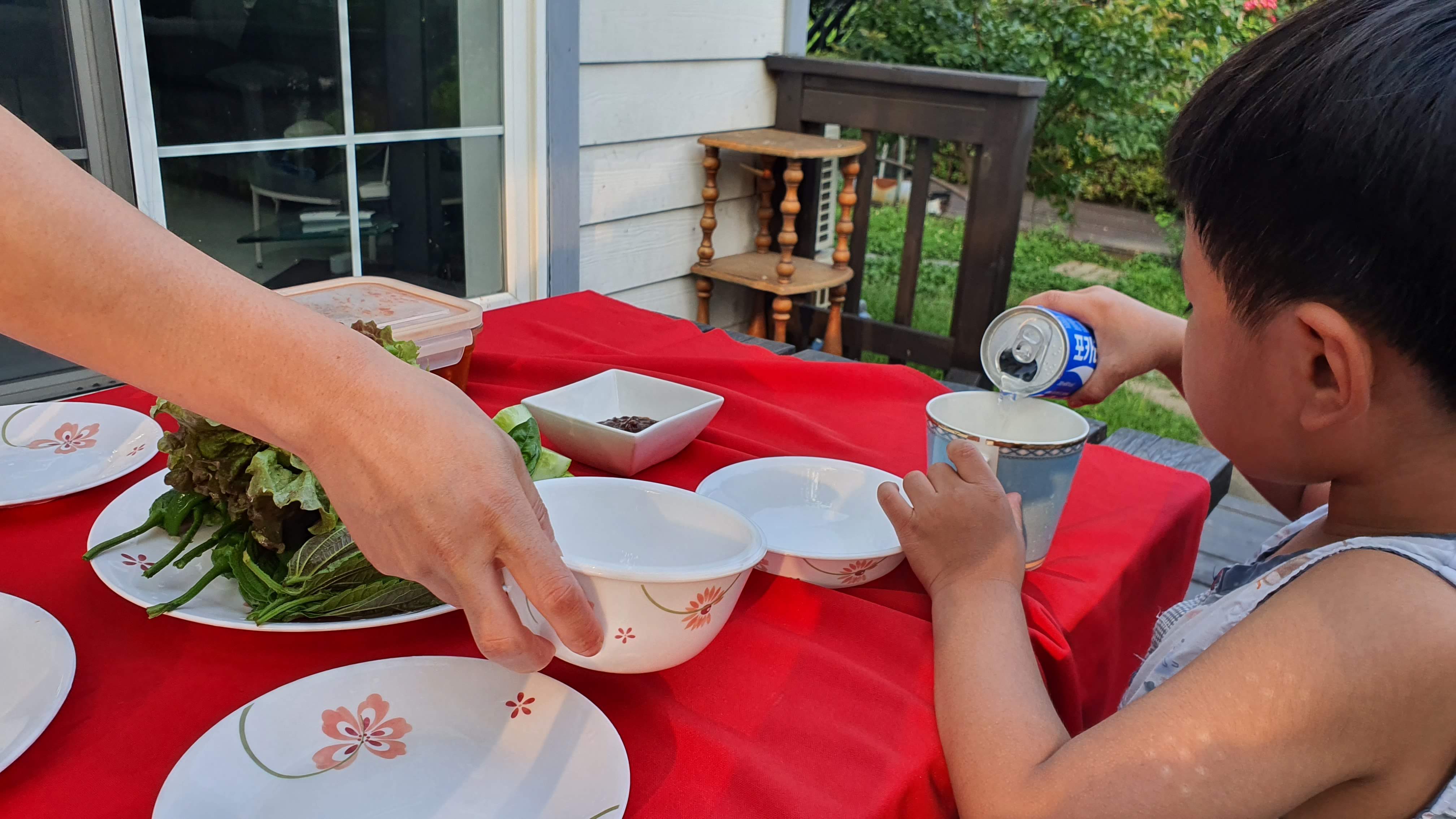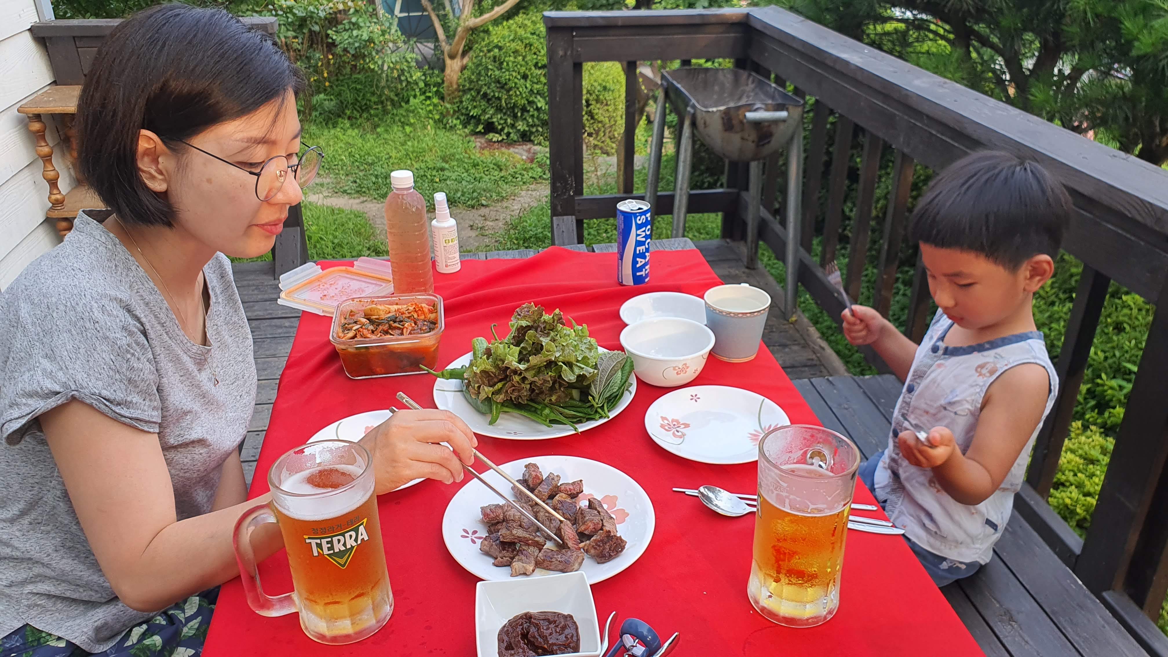 나는 쿠션베개 보다는 메밀베개와 같이 도톰하고 무르지 않은 베개를 좋아하는데 펜션에 딱... 굿 잠 잤습니다. ㅎㅎ 아무튼 펜션으로 들어와 샤워를 한 후 객실 밖에 있는 테라스에서 고기를 구워 먹었다. 나무 테이블에 빨간 테이블보를 둘르니 너무도 근사해 보인다. 오늘 길에 들려서 산 농협산 투뿔 소고기를 구워 먹으니 꿀맛이다. 맥주는 들꽃카페에서 500m 한 잔에 2천 원씩 먹을 수 있어 더없이 편리하다. 산중에서 먹는 생맥주라니...ㅎㅎ 호사가 따로 없다.
