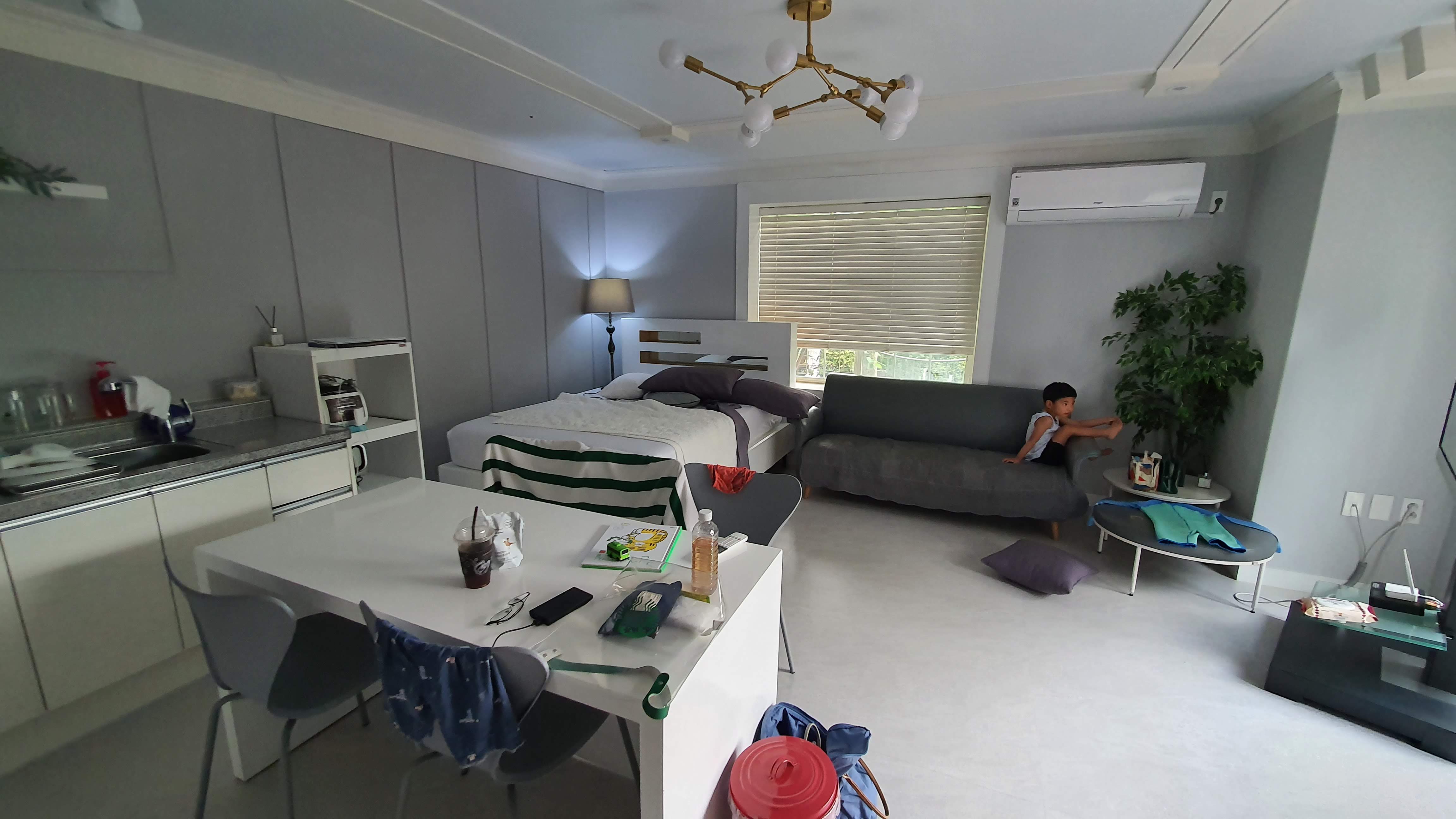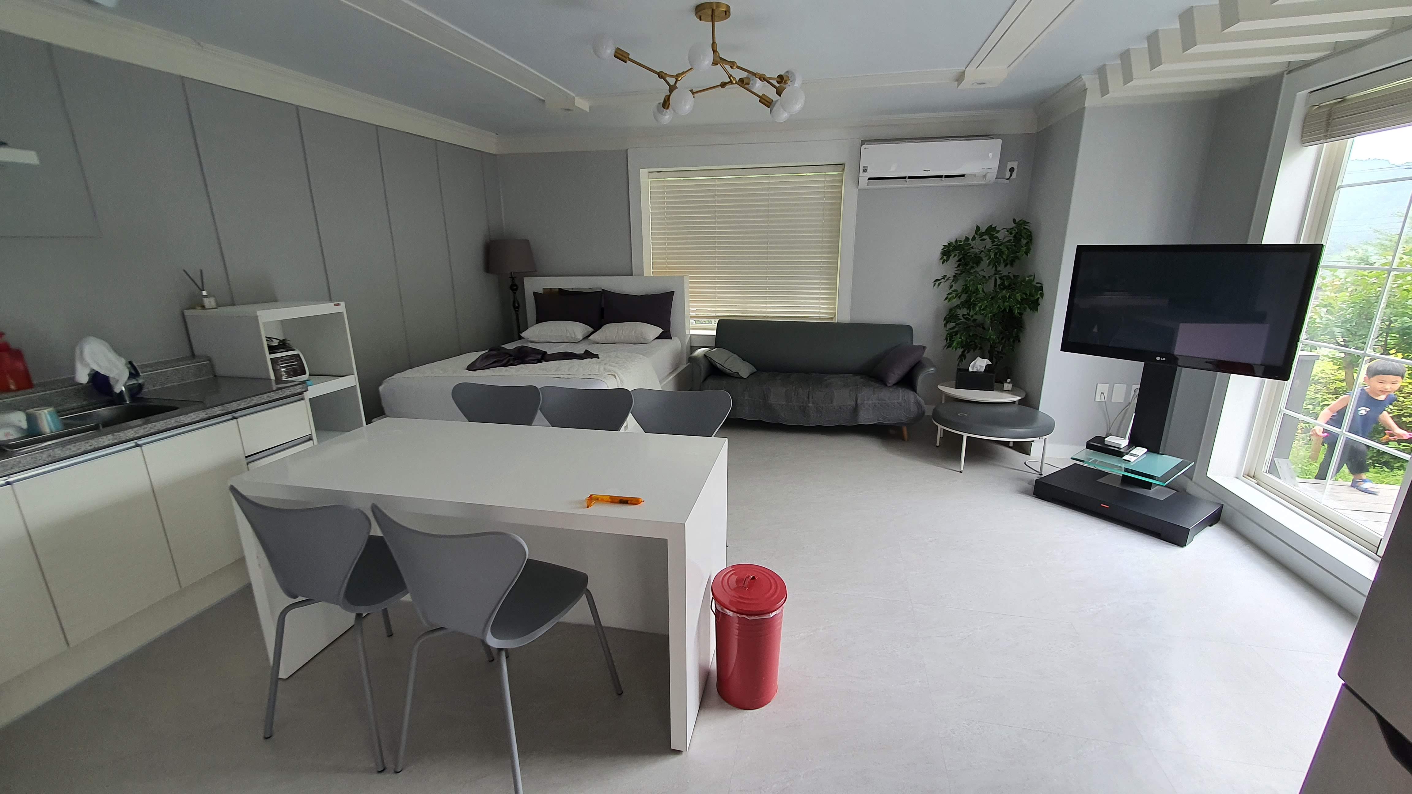 계곡옆에 있는 둥지그네! 이곳에서 시원하게 계곡 물소리 들어며 잠을 청하고 싶다. 계곡옆 둥지그네 수영을 마치고 허기진 배를 채우기 위해 다시 펜션으로 돌아왔다. 오늘 밤 우리가족이 묵을 객실 이름은 '산딸기' 다. 옛날 칙칙한 펜션 인테리어를 생각했다면 큰 오산이다. 화이트풍의 깨끗함과 모던함이 있는 곳이다. 아마도 인테리를 새로 한 것임이 분명하다. 인덕션에 아일랜드 식탁 그리고 무빙이 가능한 스탠드형 TV까지 솔직히 우리 집보다 더 잘해놓은 느낌이다. 또한 복층구조로 2층으로 올라가면 다락방처럼 된 침실 공간이 마련되어 있다. 다만 올라가는 계단이 경사가 심해 자칫 잘못하면 아이들은 위험할 수 있으니 조심하기 바란다.