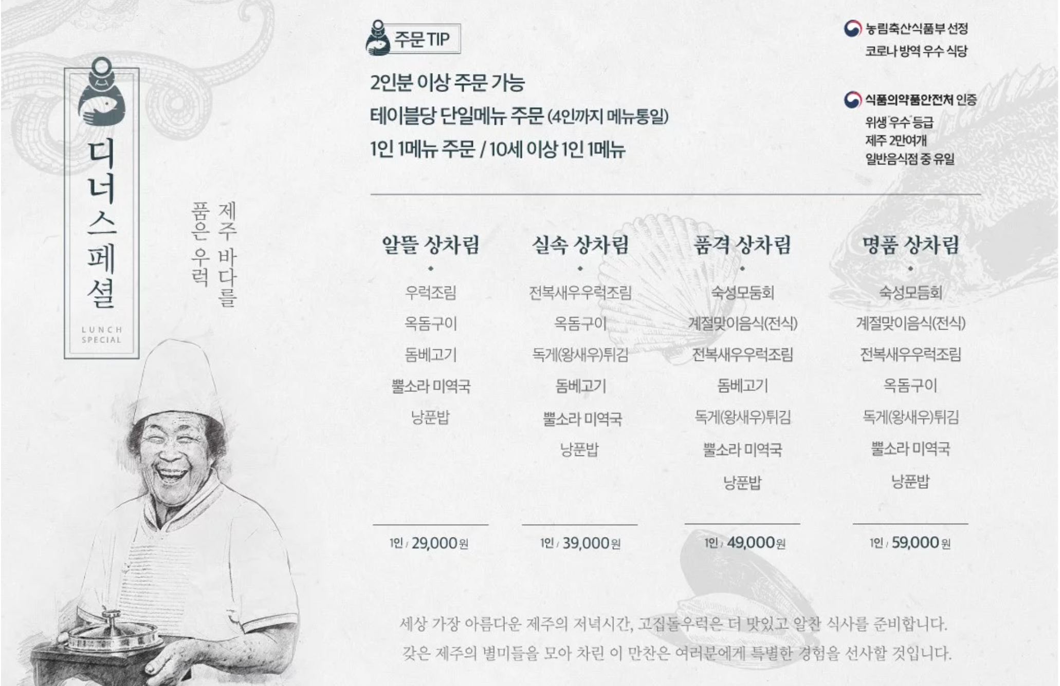 깜끌한 외관에 주차장도 편리하게 이용할 수 있다. 역시나 저녁 7시가 조금 넘어간 간 식당은 웨이팅이었다. 첫 인상은 세련됐다. 건물 외벽에 푸근하게 웃으시는 해녀 할머니가 있어서 더 정감이 간다. 웨이팅을 하게 될 경우 입구에 들어서면 키오스크로 핸드폰을 등록하게 되어 있어 식사 차례가 되면 자동으로 핸드폰으로 연락이 오게 되어있다. 편리한 세상이다.