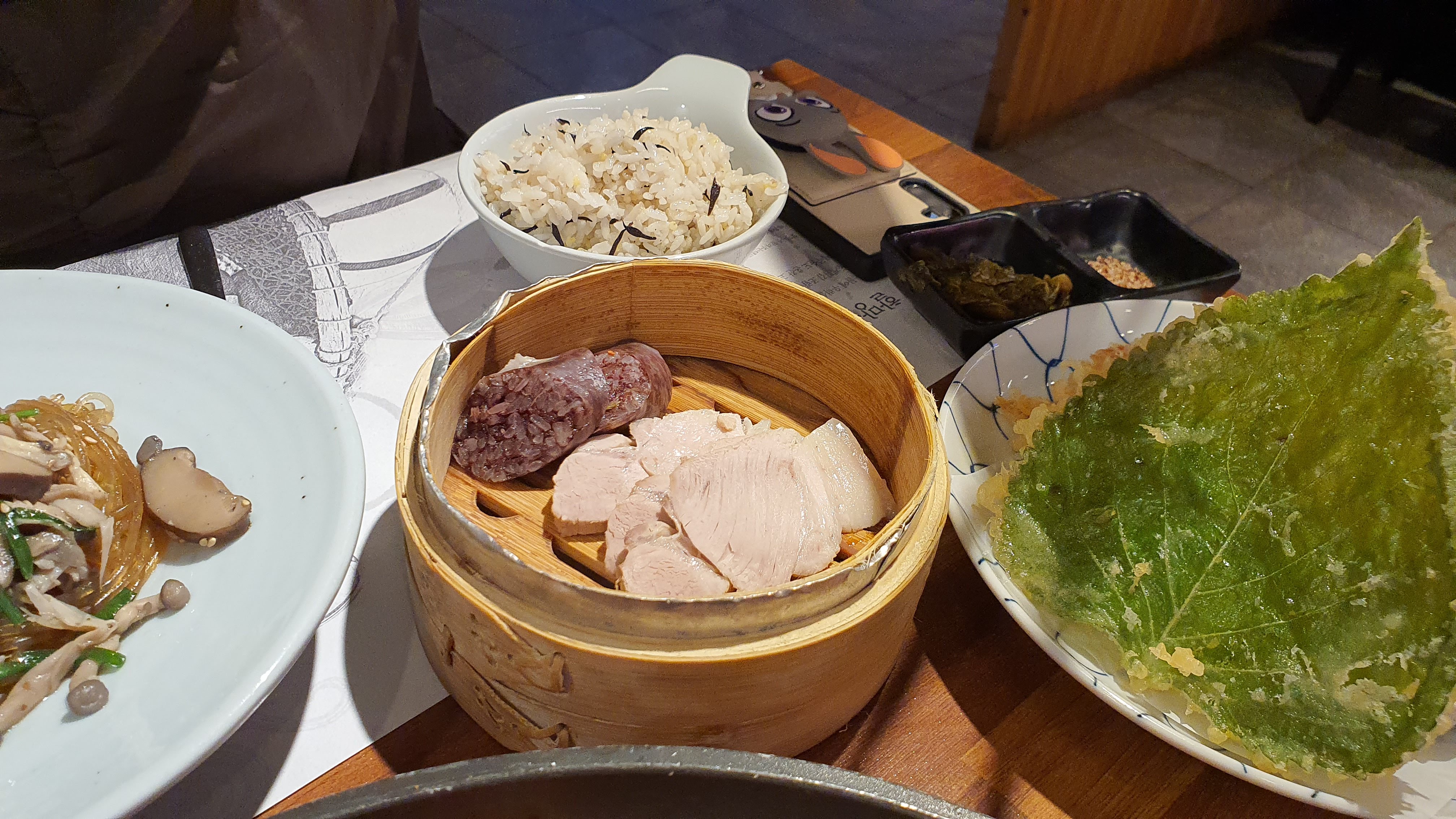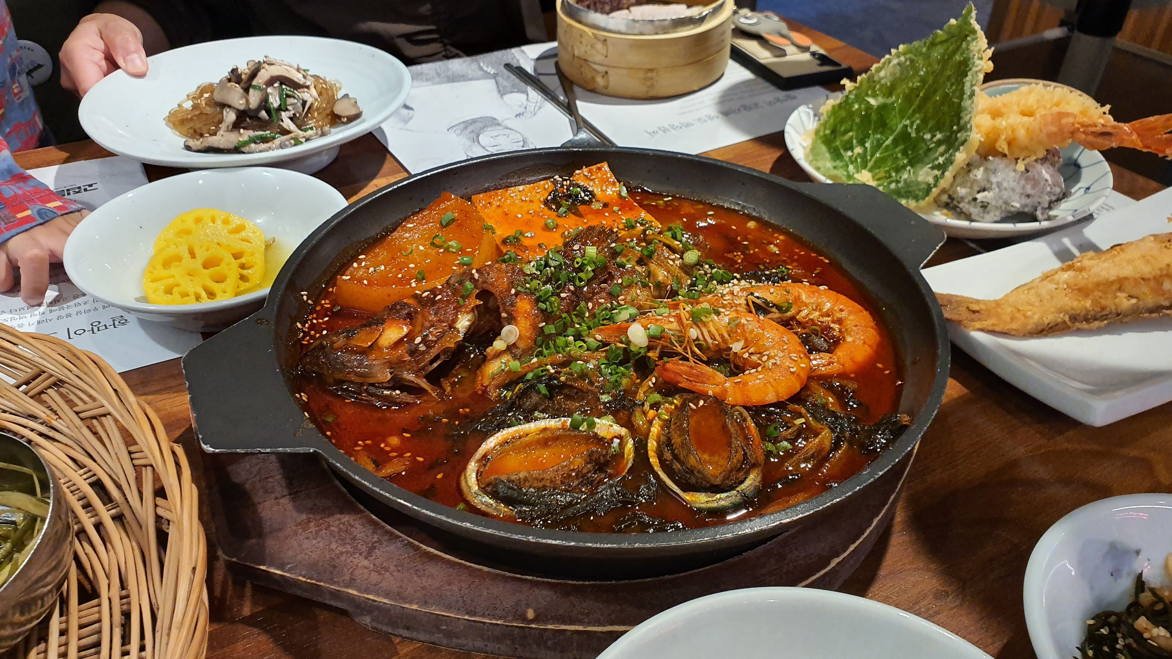 전복새우우럭조림. 식사의 메인 메뉴는 전복새우우럭조림 이다. 비주얼도 좋고 맛은 음... 뭐랄까 입에 착 감기는 맛이랄까? 일단 한 쌈 해서 와이프에게 먹여줘 보았다. 와이프가 음식 맛을 보고는 아까의 화난 마음이 가라앉고 생기가 있는 표정으로 바뀌었다. 안도의 한 숨을 쉬어본다. 누구나 그렇듯이 음식점을 데리고 온 사람이 맛에 대해서 책임을 져야 하기 때문에 ㅎㅎ. 나도 탱탱한 우럭 살을 한 점 때어내서 배춧잎에 올리고 같이 나온 시래기와 함께 마늘 쌈장을 찍어서 먹어 보았다. 입안에서 행복의 맛이 팡팡 터지는 신세계의 맛이다. 한 마디로 말해서 그냥 너무 맛있다. 정말 " 음.. 맛있어!!" 이 말이 튀어나온다. 정말 맛있다. 너무 익숙한 맛있는 맛인데 그걸 먹고 있다고 해야 할까 상차림과 메인 요리와 밑반찬들이 구성이 잘 되어있고 맛도 훌륭하다. 하늘이도 같이 나온 뿔소라 미역국과 잡채를 맛있다며 연신 먹어댄다. 5살 아이도 맛있다는 표현을 하다니!! ㅎㅎ