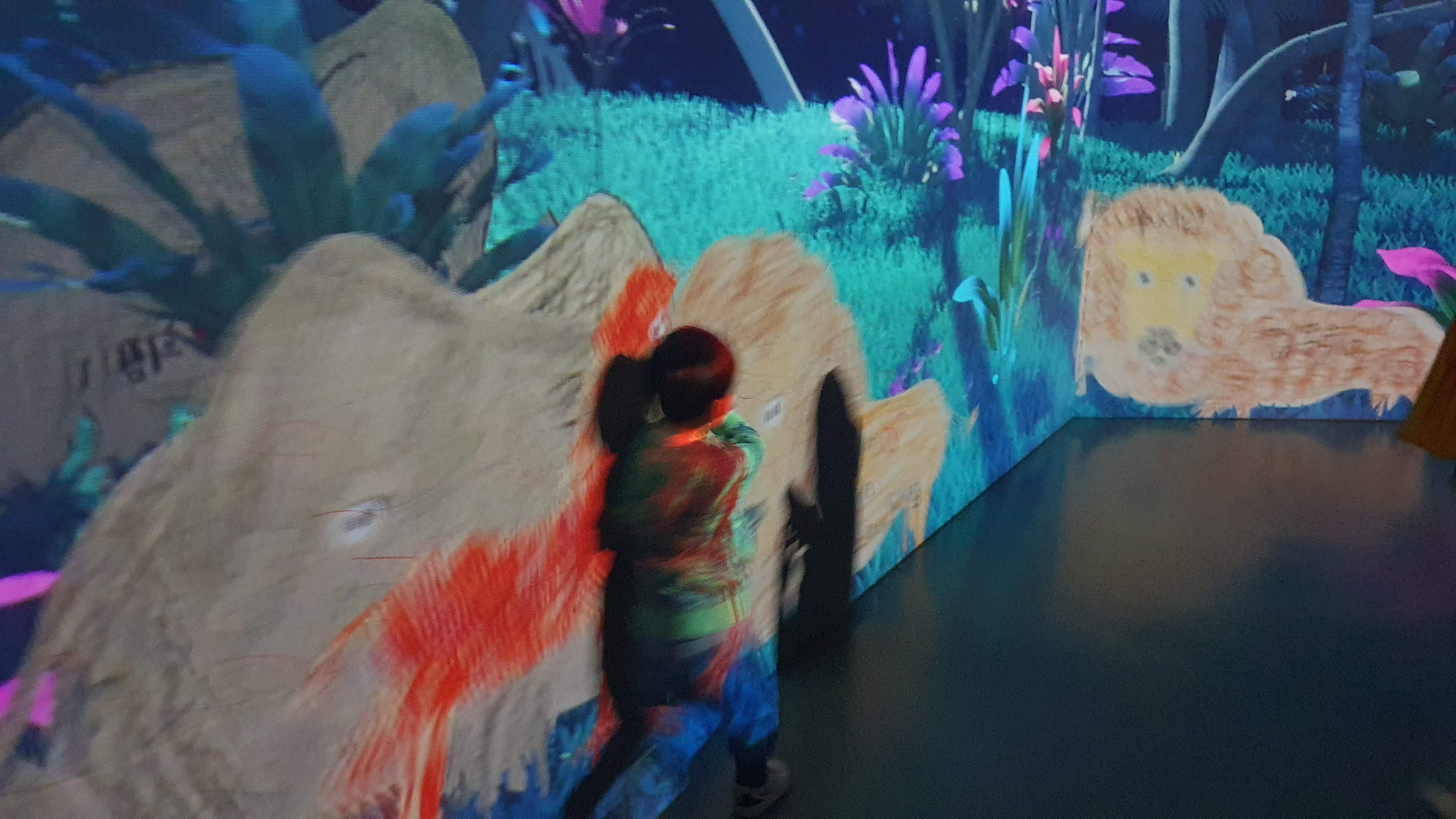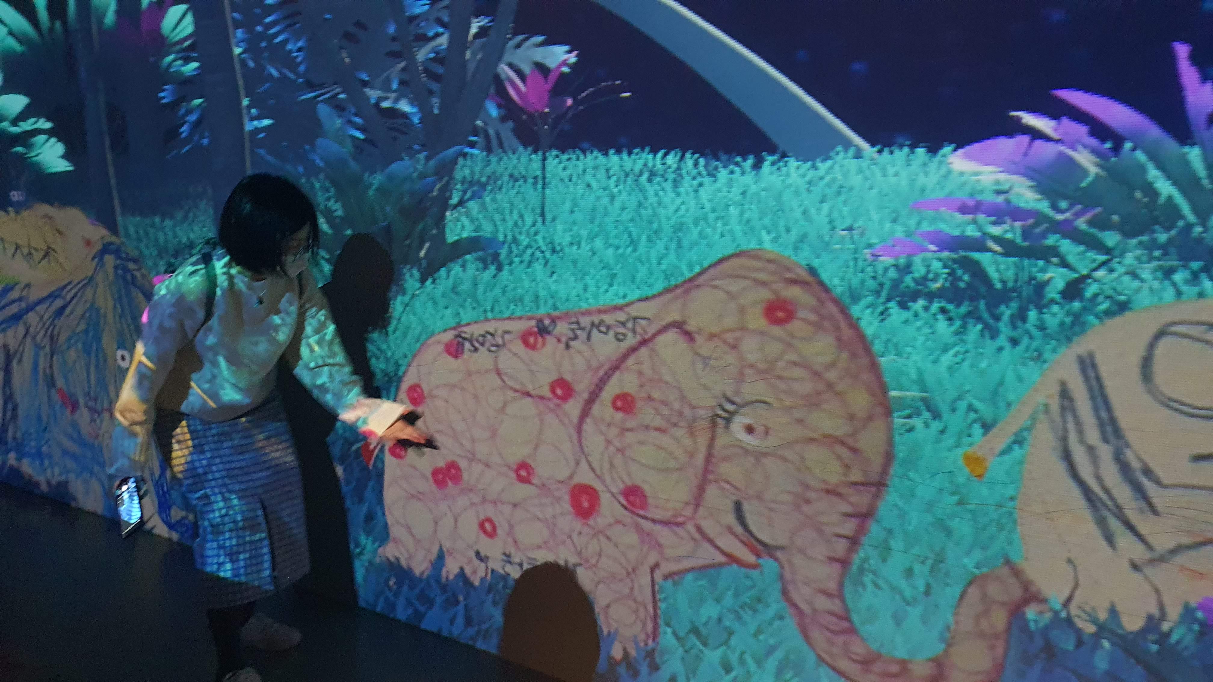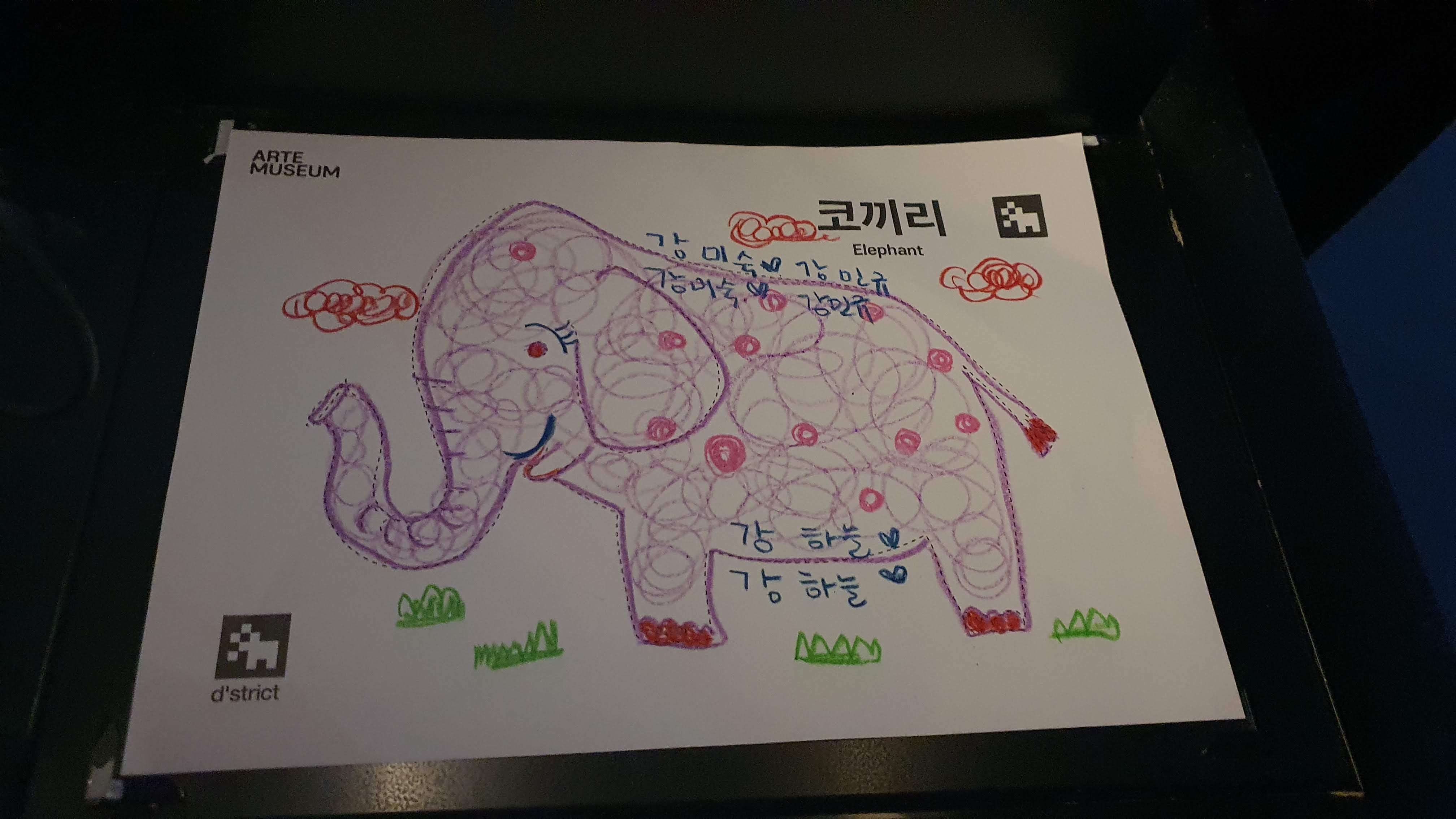 아이가 그림 그림을 스캔하면 대형 화면에 아이가 그린 그림이 툭 하고 나타난다. 정말 신기한 경험.